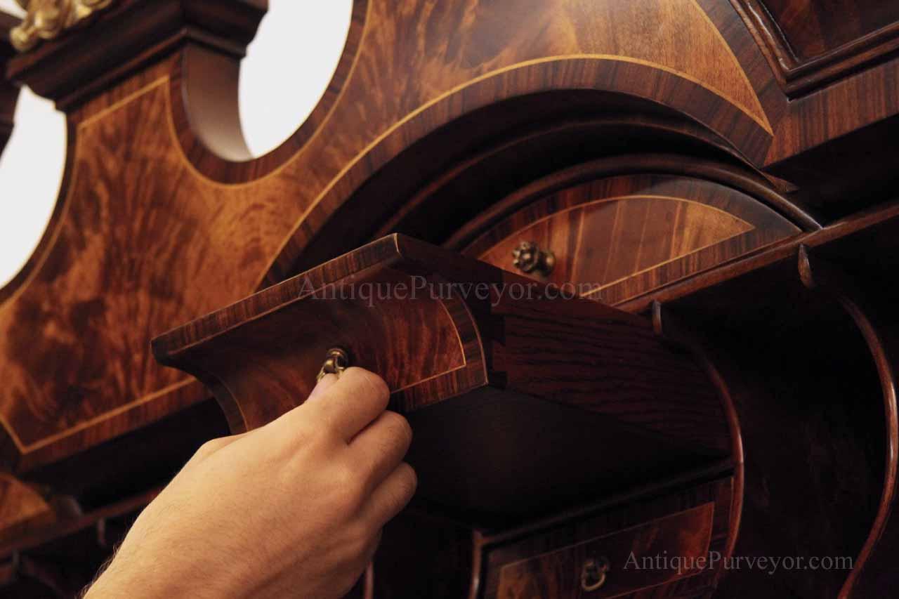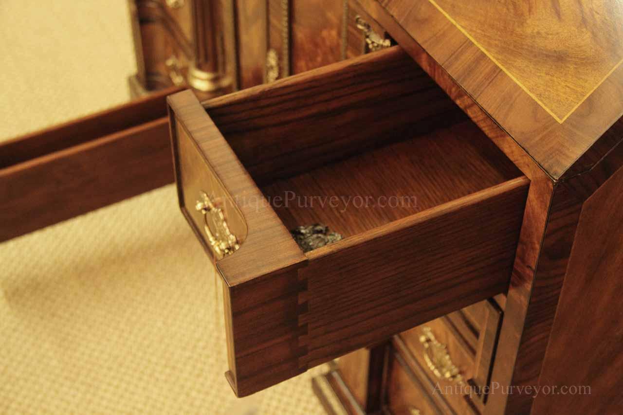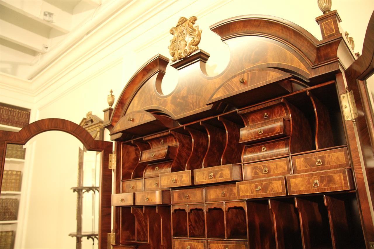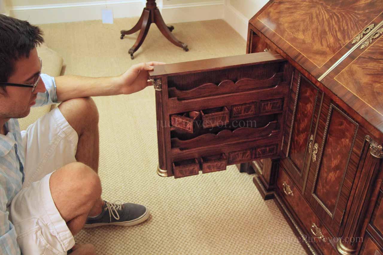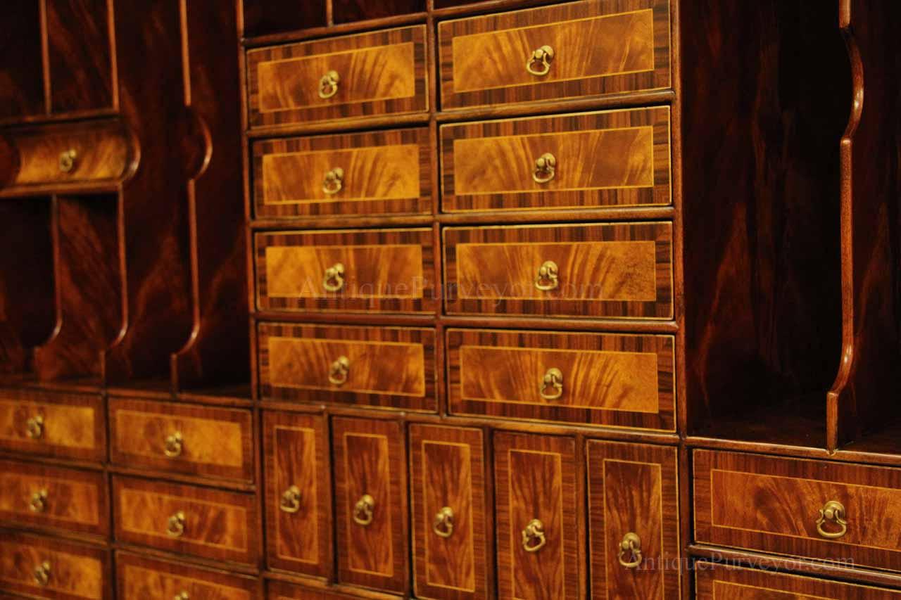 Luxurious mahogany secretary desk with over 45 drawers and 19 pigeon holes. This desk is 900 pounds! Every drawer is dovetailed, even the smallest drawers within the cabinet are tongue and groove. This secretary desk was manufactured by skilled artisans with traditional methods and it is a high-end 18th century antique reproduction built for a luxurious estate, stately home, grand foyer or historic site. This desk is loaded with details. Desk is made from mahogany solids and fancier rosewood and flame mahogany Veneers. Desk has architectural brass cornices and gilt crest above two locking glass doors which enclose 45 drawers and 19 pigeon holes. Below the glass case is an opening slant lid desk with leather inset pull-out trays. The bottom of cabinet has two more locking doors in front of many secretive compartments which traditional secretaries are known for.
