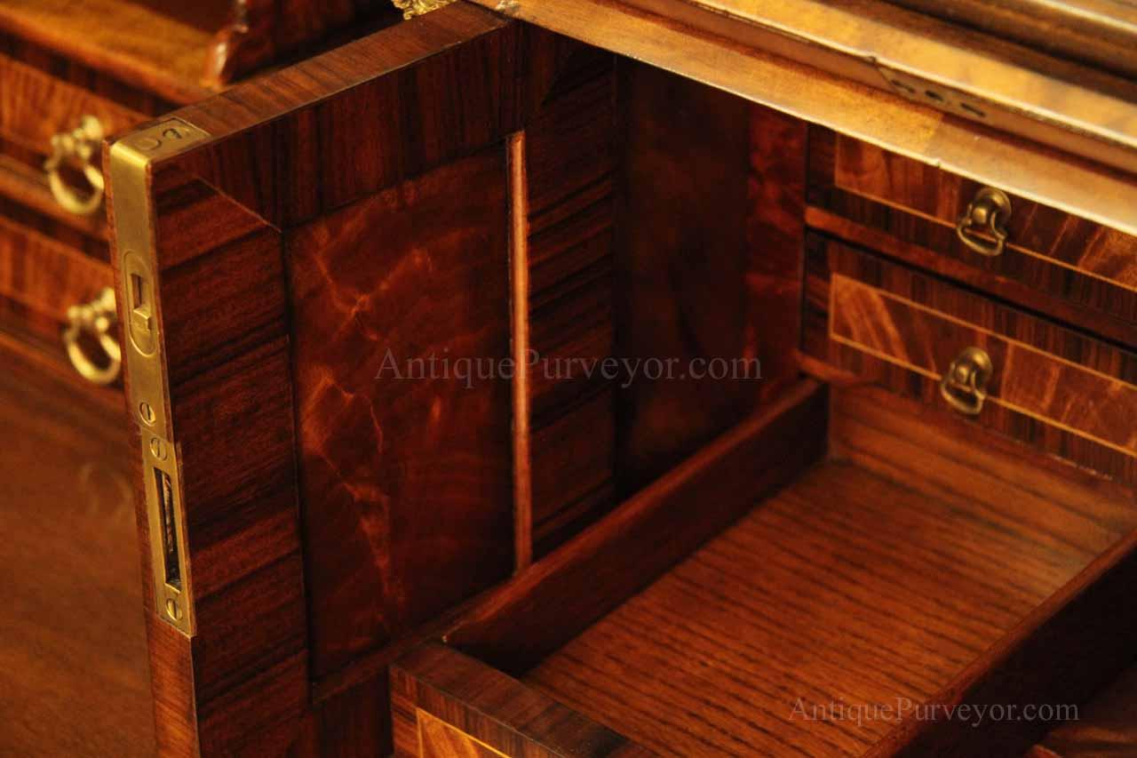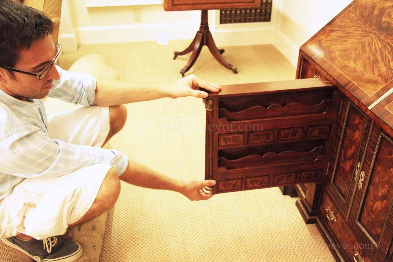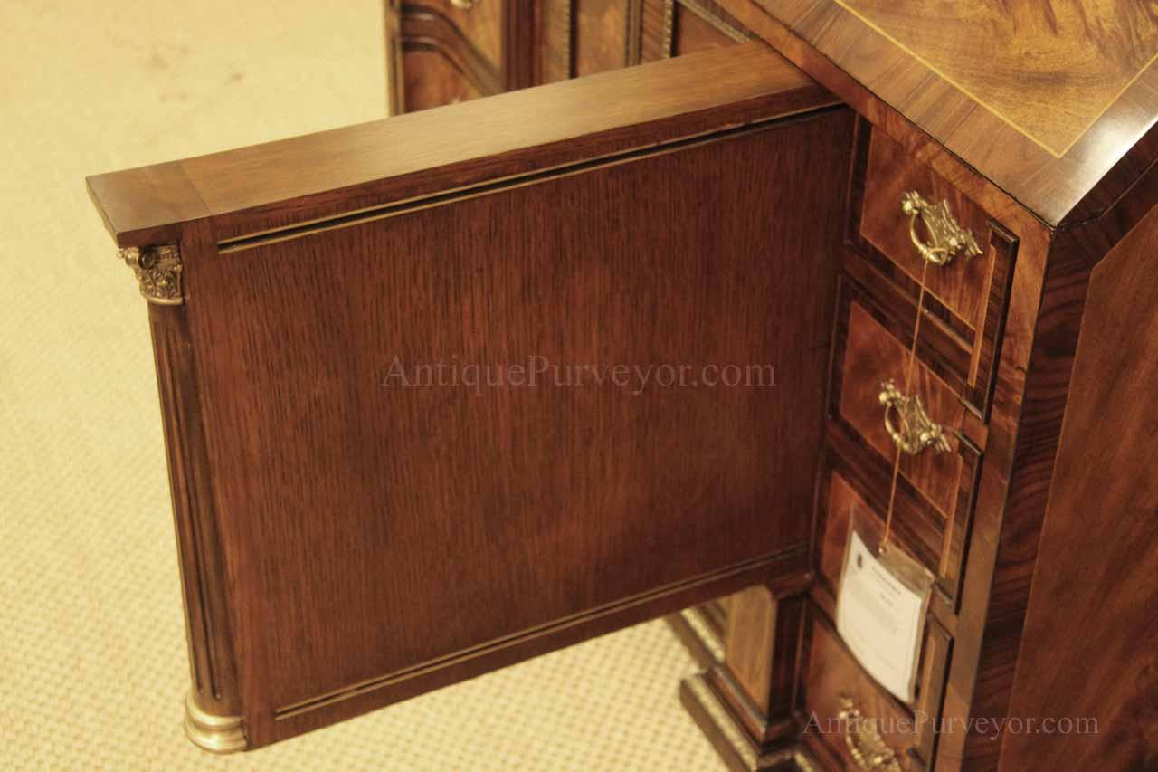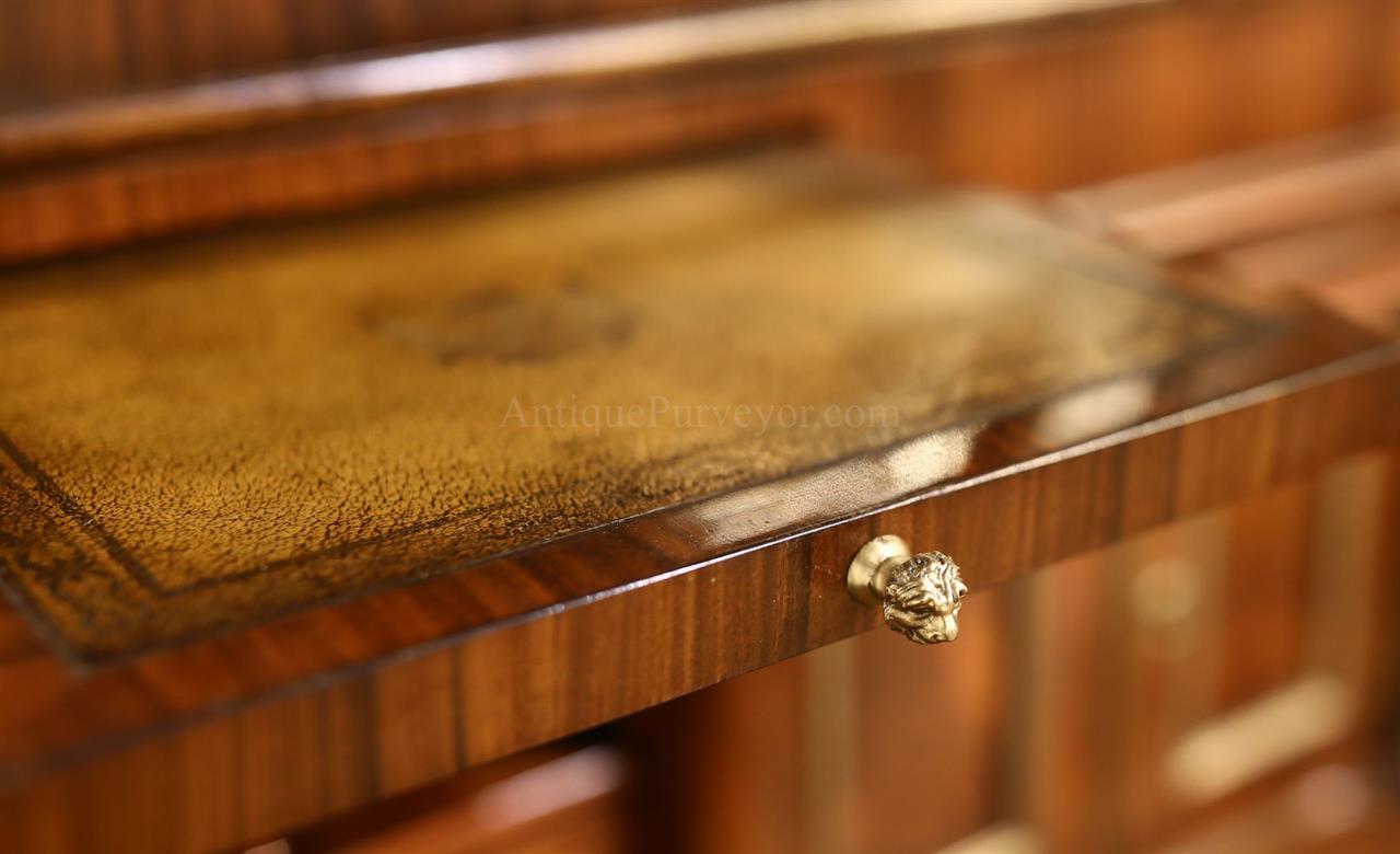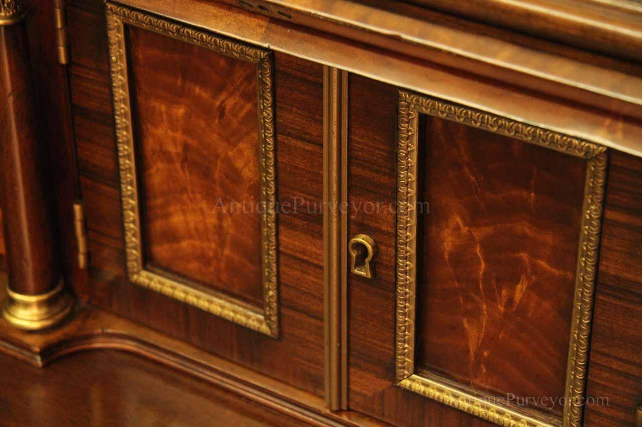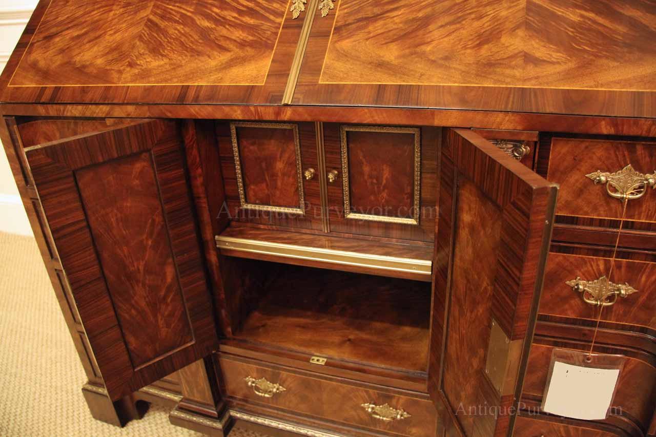 Luxurious mahogany secretary desk with over 45 drawers and 19 pigeon holes. This desk is 900 pounds! Every drawer is dovetailed, even the smallest drawers within the cabinet are tongue and groove. This secretary desk was manufactured by skilled artisans with traditional methods and it is a high-end 18th century antique reproduction built for a luxurious estate, stately home, grand foyer or historic site. This desk is loaded with details. Desk is made from mahogany solids and fancier rosewood and flame mahogany Veneers. Desk has architectural brass cornices and gilt crest above two locking glass doors which enclose 45 drawers and 19 pigeon holes. Below the glass case is an opening slant lid desk with leather inset pull-out trays. The bottom of cabinet has two more locking doors in front of many secretive compartments which traditional secretaries are known for.