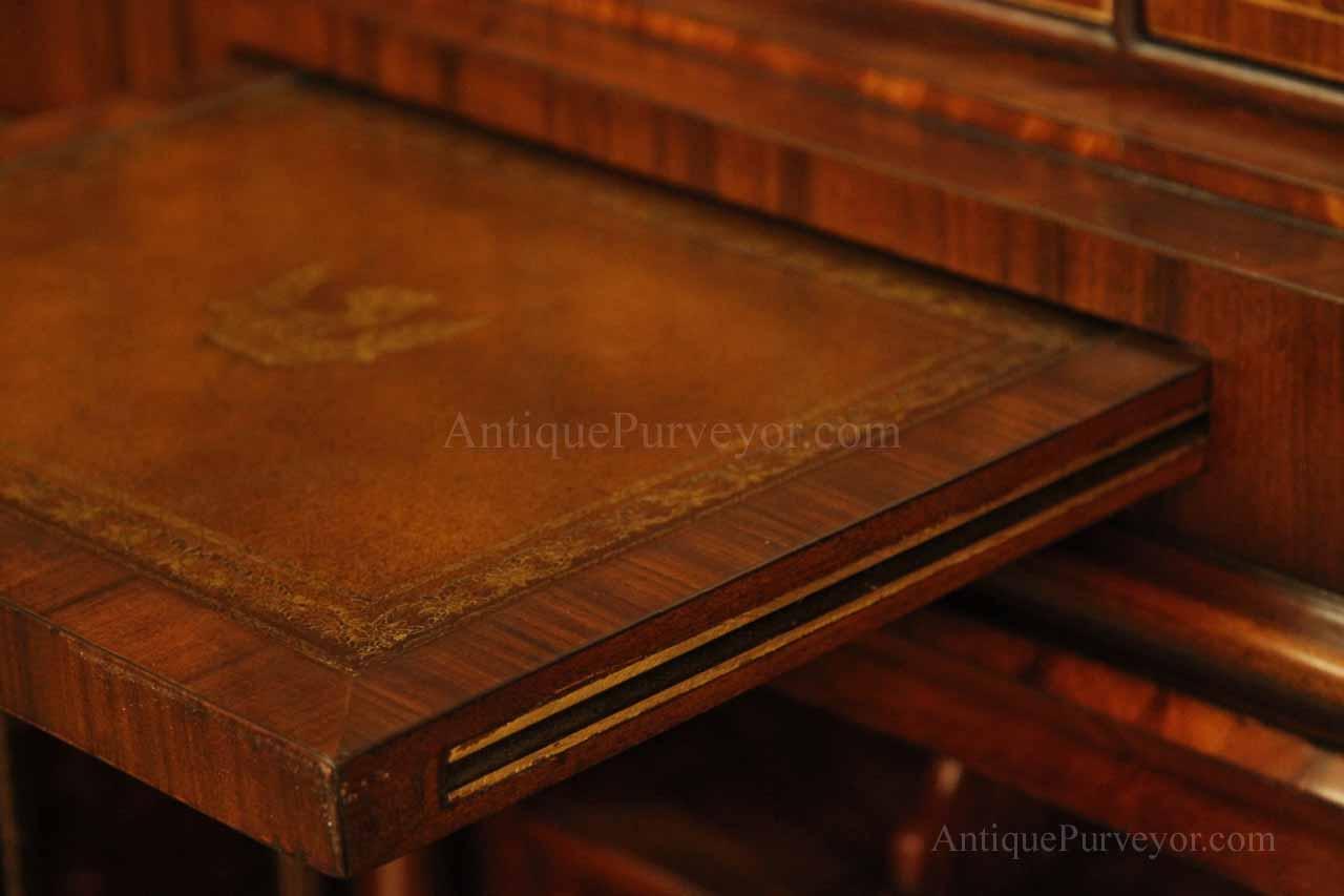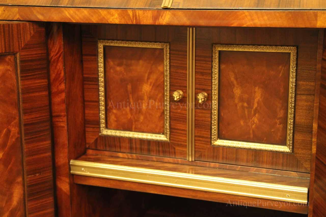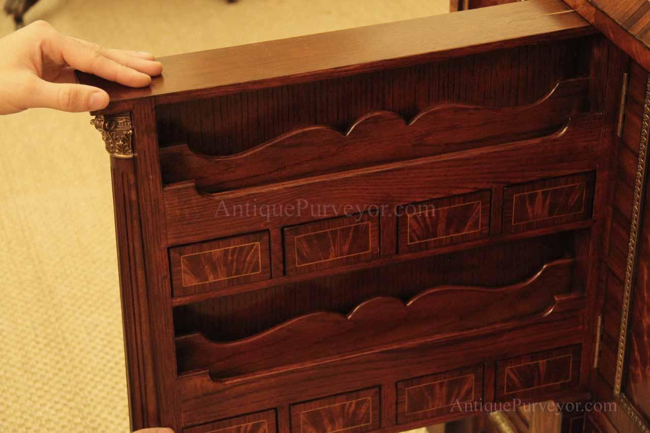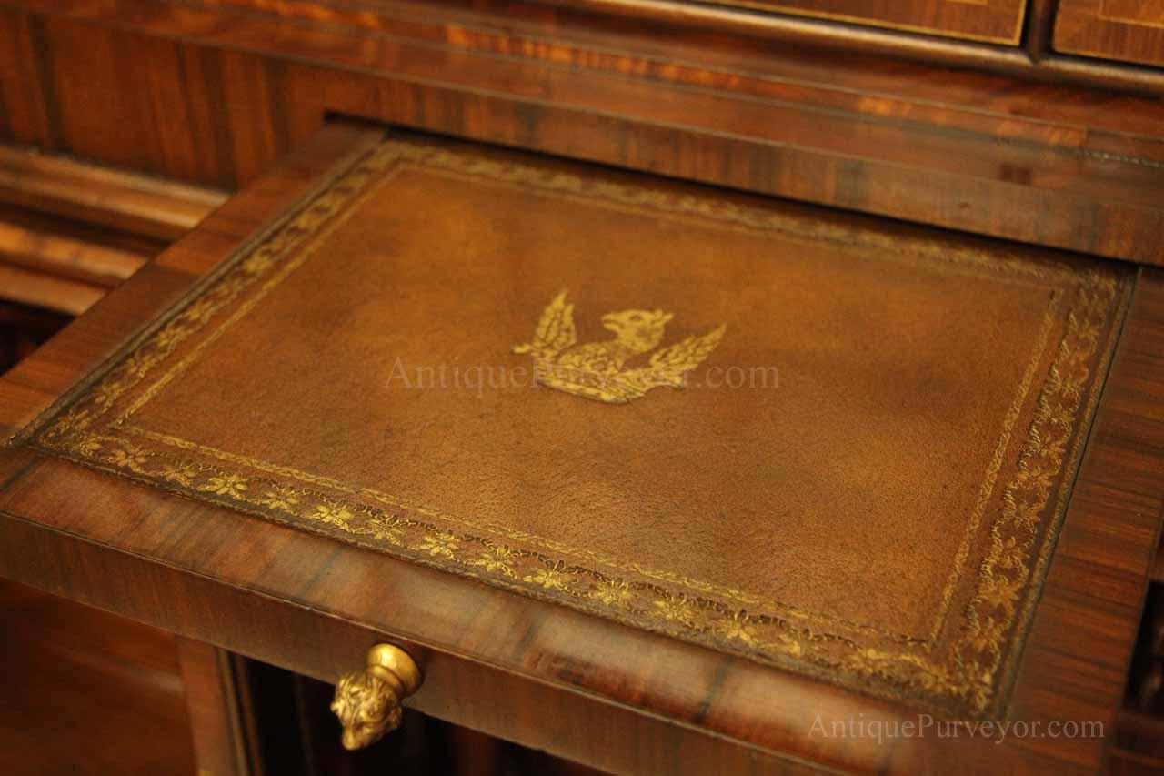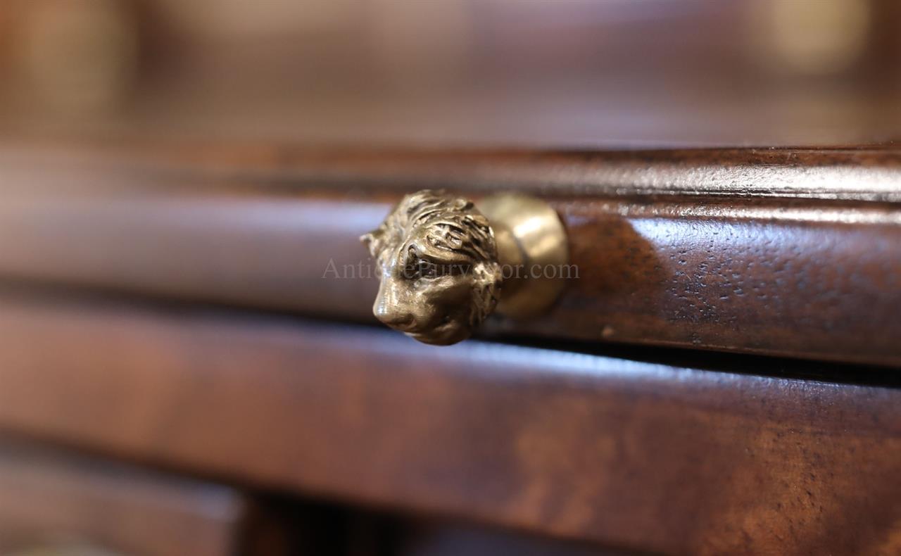 Luxurious mahogany secretary desk with over 45 drawers and 19 pigeon holes. This desk is 900 pounds! Every drawer is dovetailed, even the smallest drawers within the cabinet are tongue and groove. This secretary desk was manufactured by skilled artisans with traditional methods and it is a high-end 18th century antique reproduction built for a luxurious estate, stately home, grand foyer or historic site. This desk is loaded with details. Desk is made from mahogany solids and fancier rosewood and flame mahogany Veneers. Desk has architectural brass cornices and gilt crest above two locking glass doors which enclose 45 drawers and 19 pigeon holes. Below the glass case is an opening slant lid desk with leather inset pull-out trays. The bottom of cabinet has two more locking doors in front of many secretive compartments which traditional secretaries are known for.