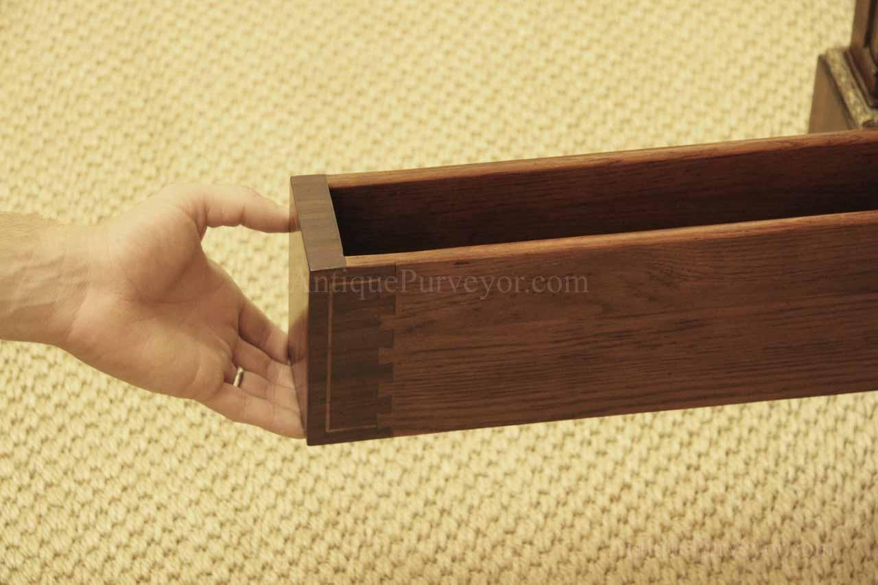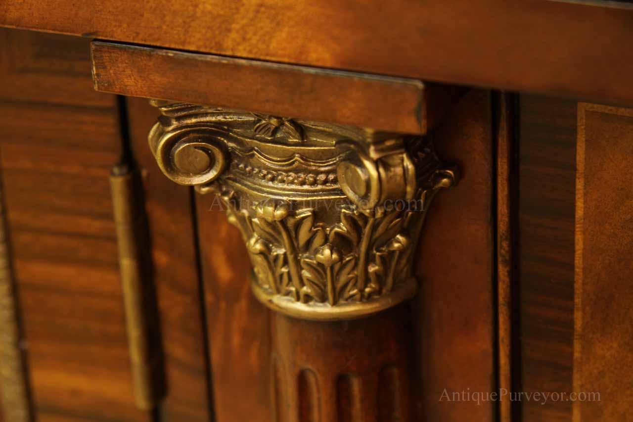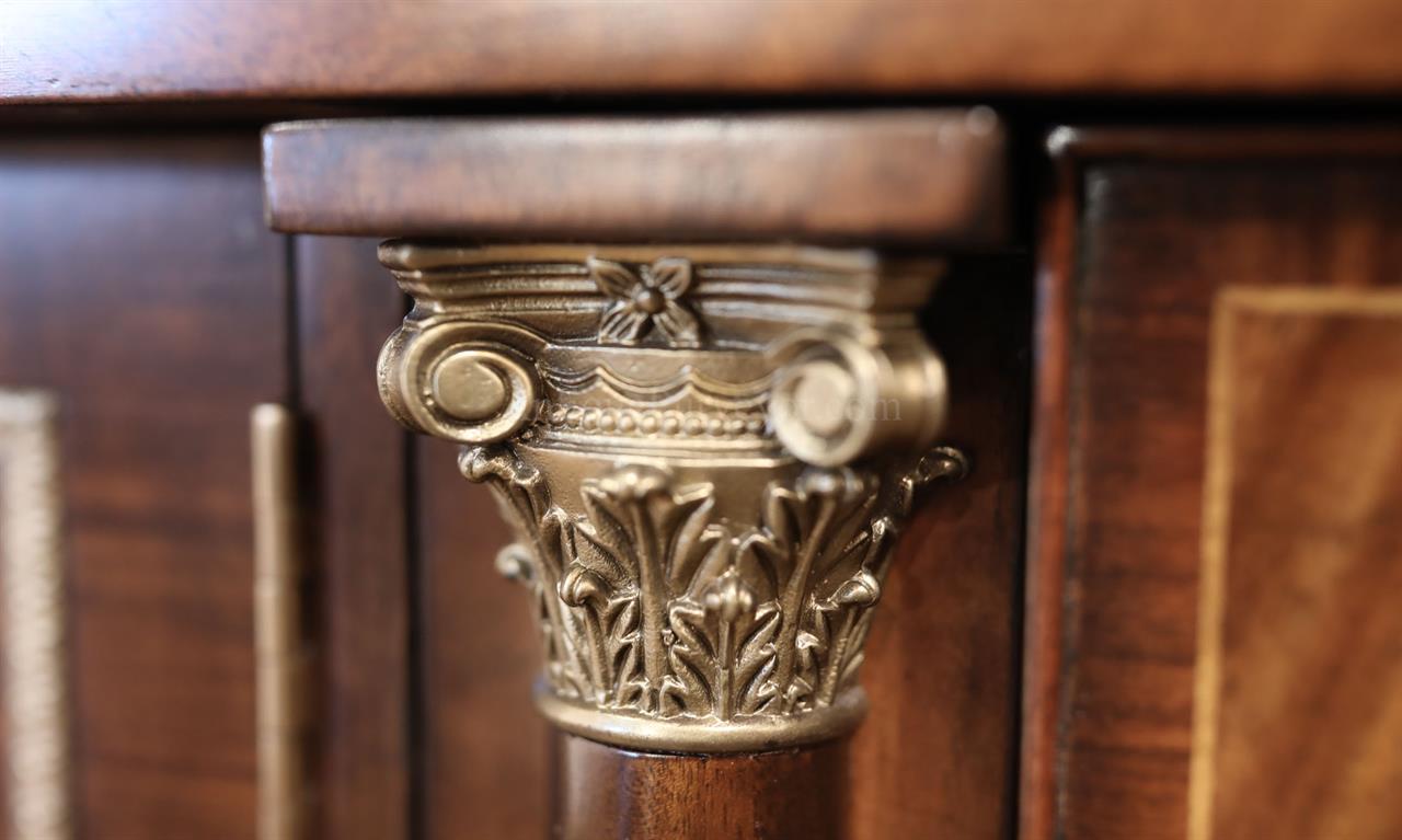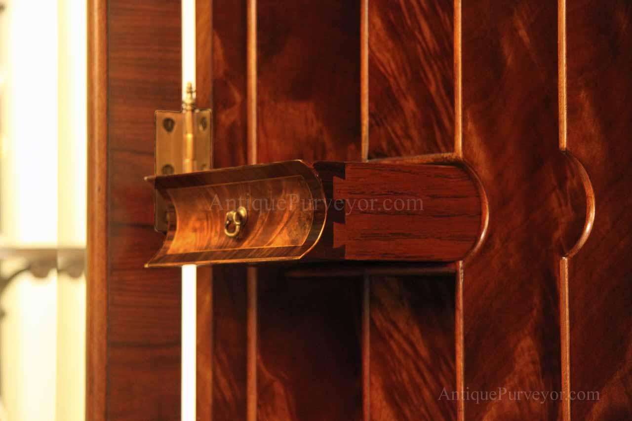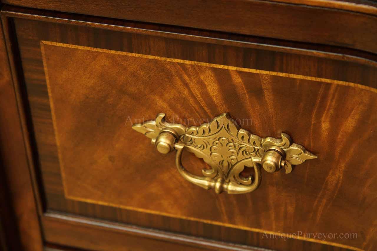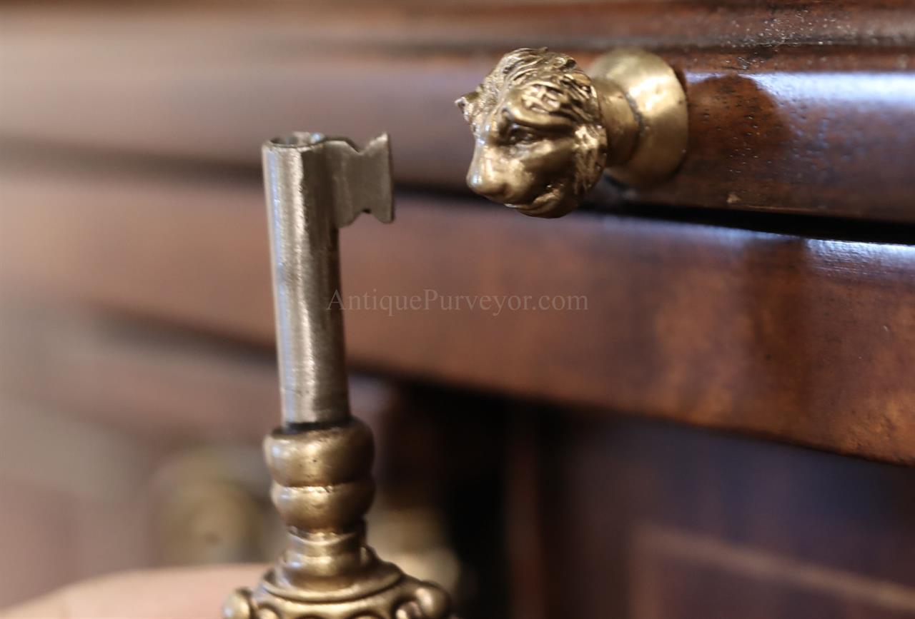 Luxurious mahogany secretary desk with over 45 drawers and 19 pigeon holes. This desk is 900 pounds! Every drawer is dovetailed, even the smallest drawers within the cabinet are tongue and groove. This secretary desk was manufactured by skilled artisans with traditional methods and it is a high-end 18th century antique reproduction built for a luxurious estate, stately home, grand foyer or historic site. This desk is loaded with details. Desk is made from mahogany solids and fancier rosewood and flame mahogany Veneers. Desk has architectural brass cornices and gilt crest above two locking glass doors which enclose 45 drawers and 19 pigeon holes. Below the glass case is an opening slant lid desk with leather inset pull-out trays. The bottom of cabinet has two more locking doors in front of many secretive compartments which traditional secretaries are known for.