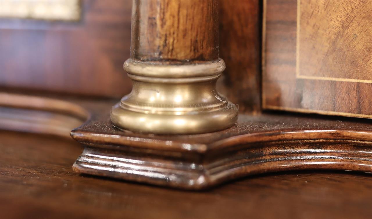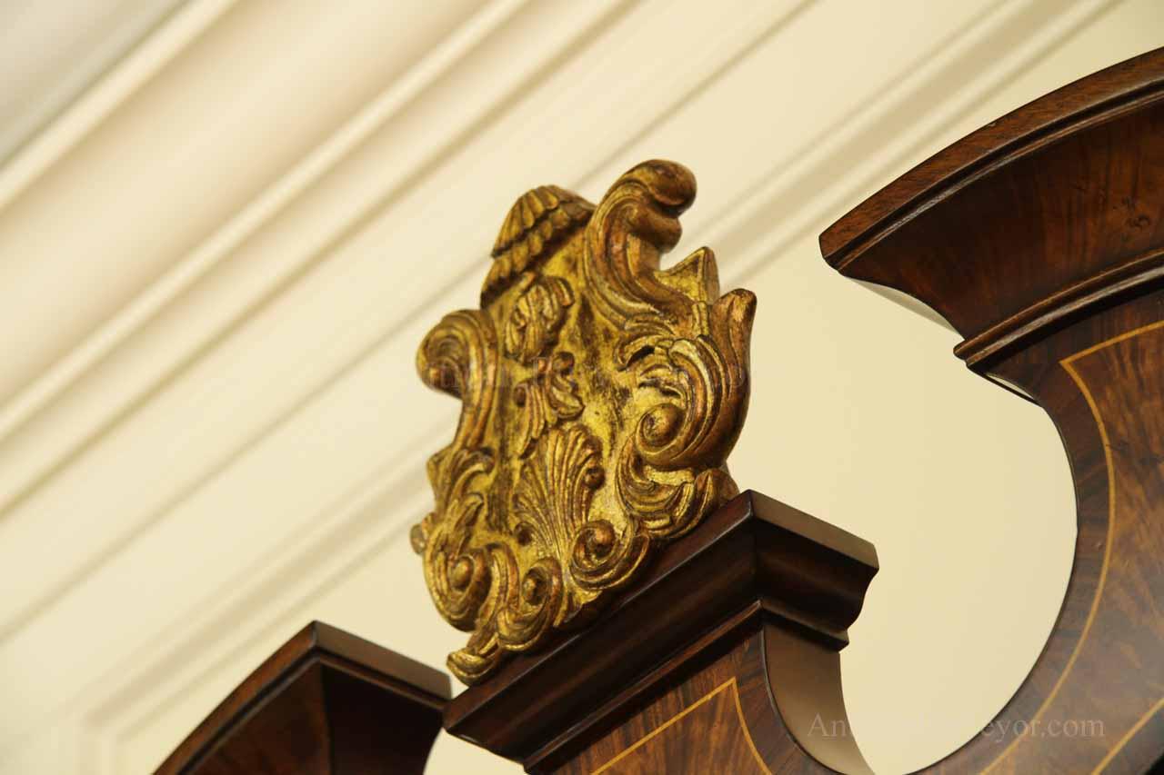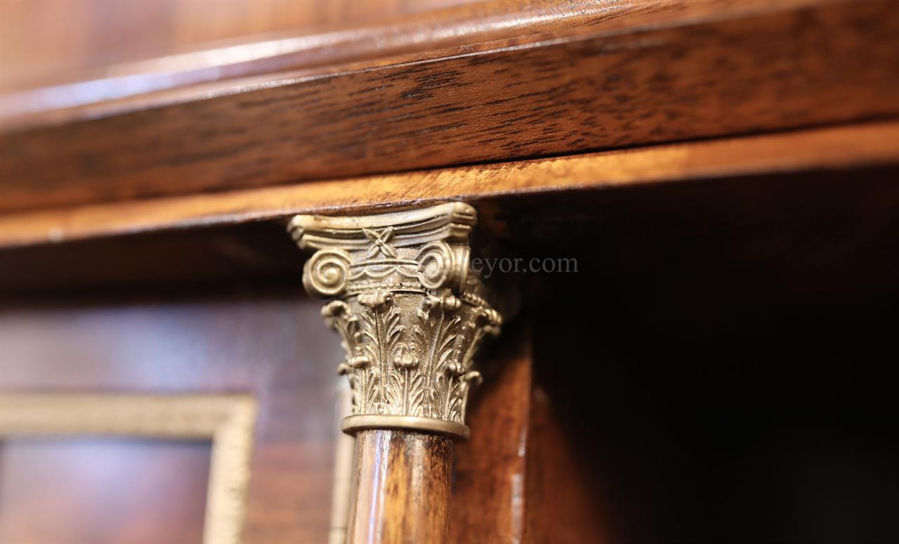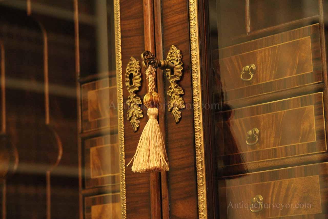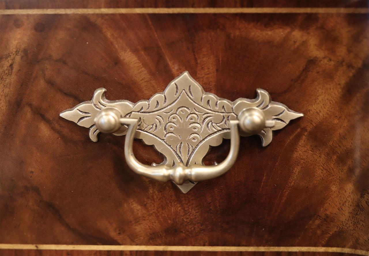 Luxurious mahogany secretary desk with over 45 drawers and 19 pigeon holes. This desk is 900 pounds! Every drawer is dovetailed, even the smallest drawers within the cabinet are tongue and groove. This secretary desk was manufactured by skilled artisans with traditional methods and it is a high-end 18th century antique reproduction built for a luxurious estate, stately home, grand foyer or historic site. This desk is loaded with details. Desk is made from mahogany solids and fancier rosewood and flame mahogany Veneers. Desk has architectural brass cornices and gilt crest above two locking glass doors which enclose 45 drawers and 19 pigeon holes. Below the glass case is an opening slant lid desk with leather inset pull-out trays. The bottom of cabinet has two more locking doors in front of many secretive compartments which traditional secretaries are known for.