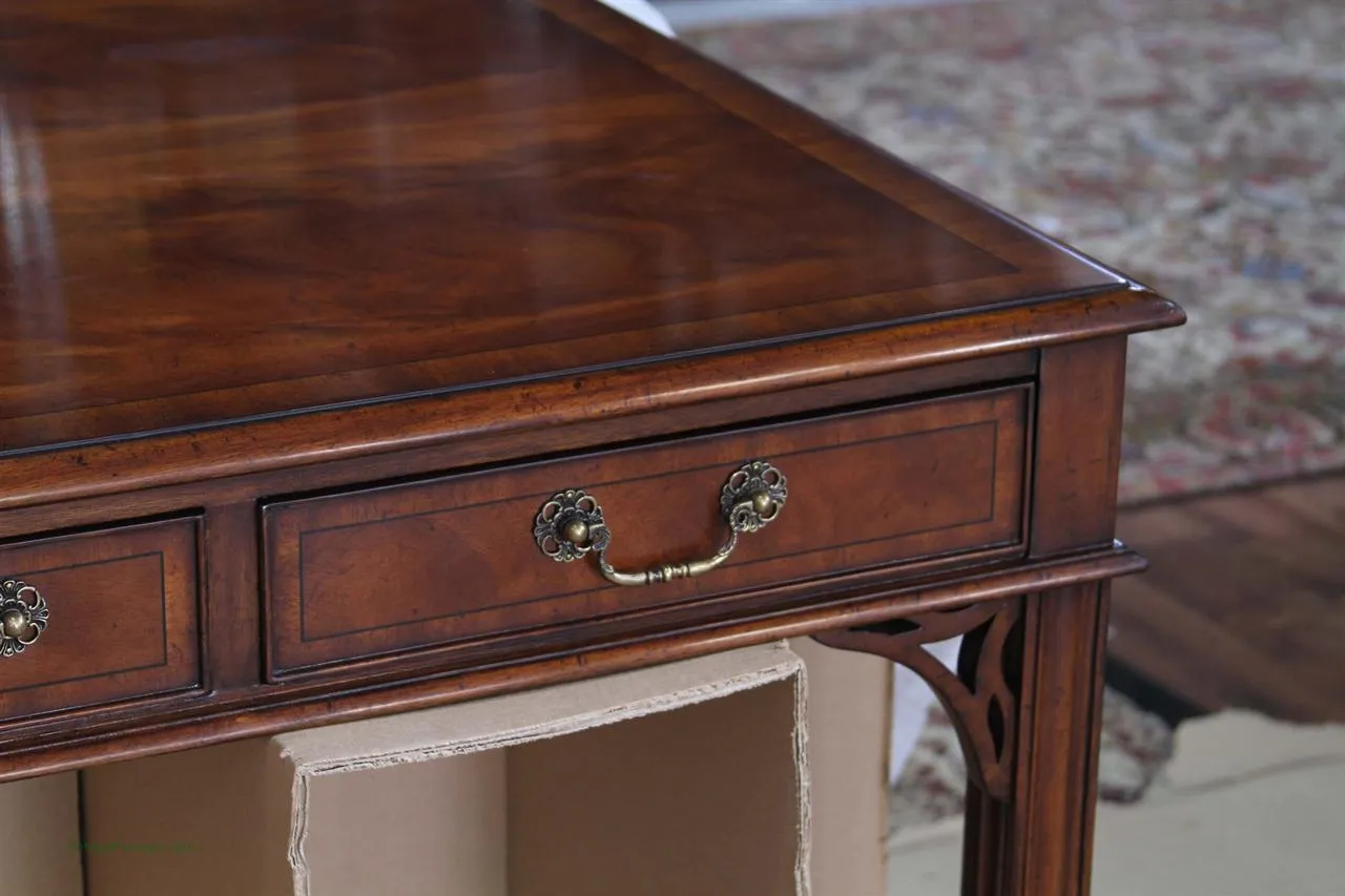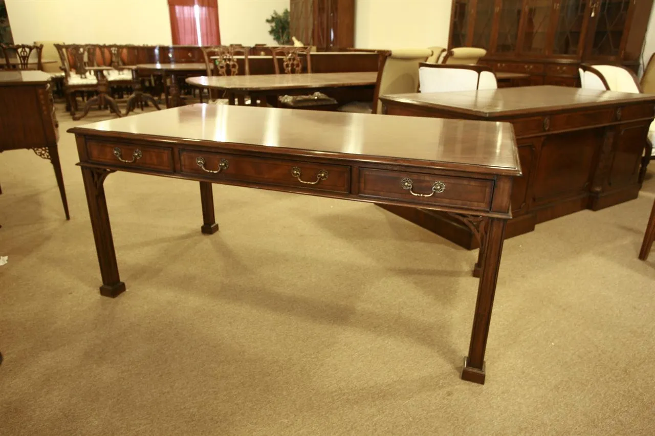 Traditional writing desk. Great reception area desk or low-profile desk for a waiting area or small office. High-end oak-lined drawers and dovetail construction. Measurements: 66″W x 34″ Dx30″H