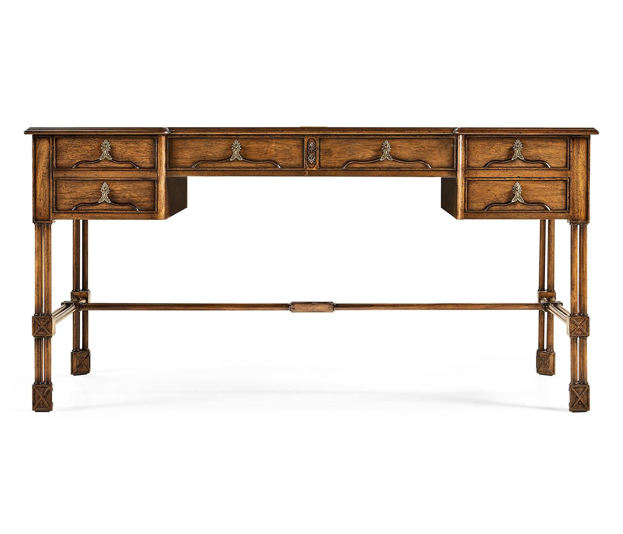 Jonathan Charles fine furniture Gothic writing desk. Walnut wood Chippendale style desk with leather top. It stands on Tropical-style legs, with unique custom forged drawer pulls that look and feel like leaves. This antique reproduction desk has pass-through wire management with a finely cast brass grommet.