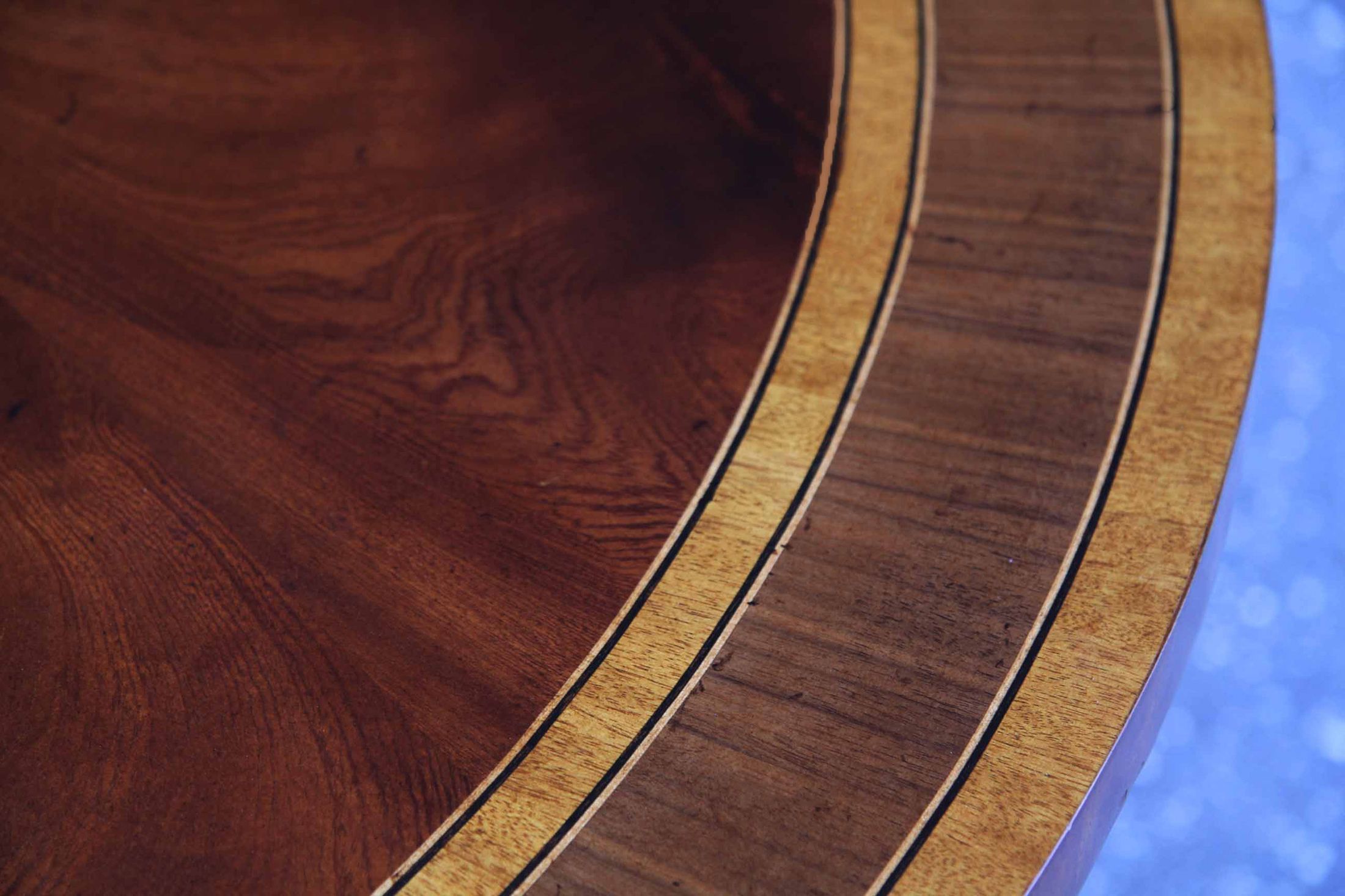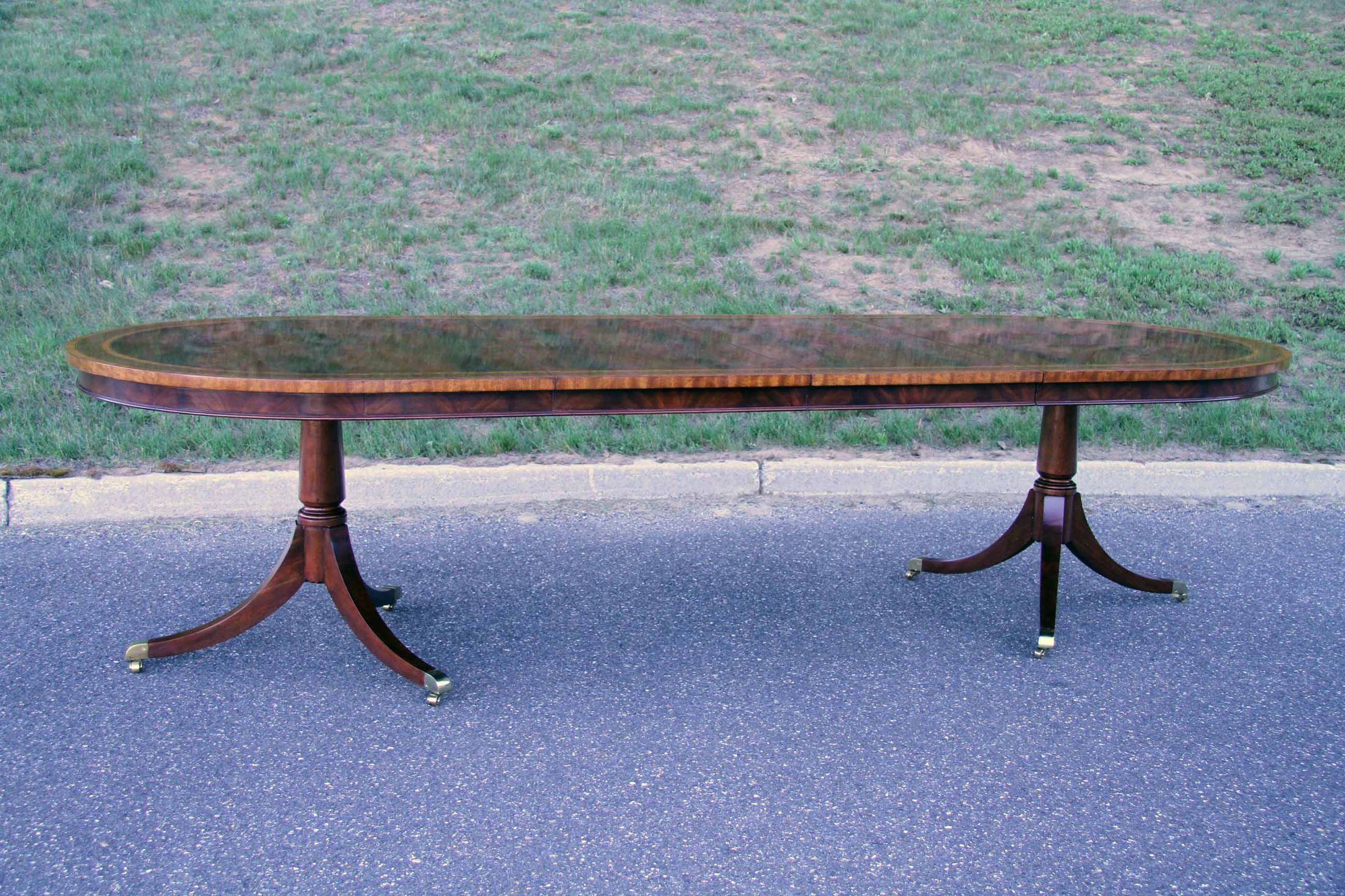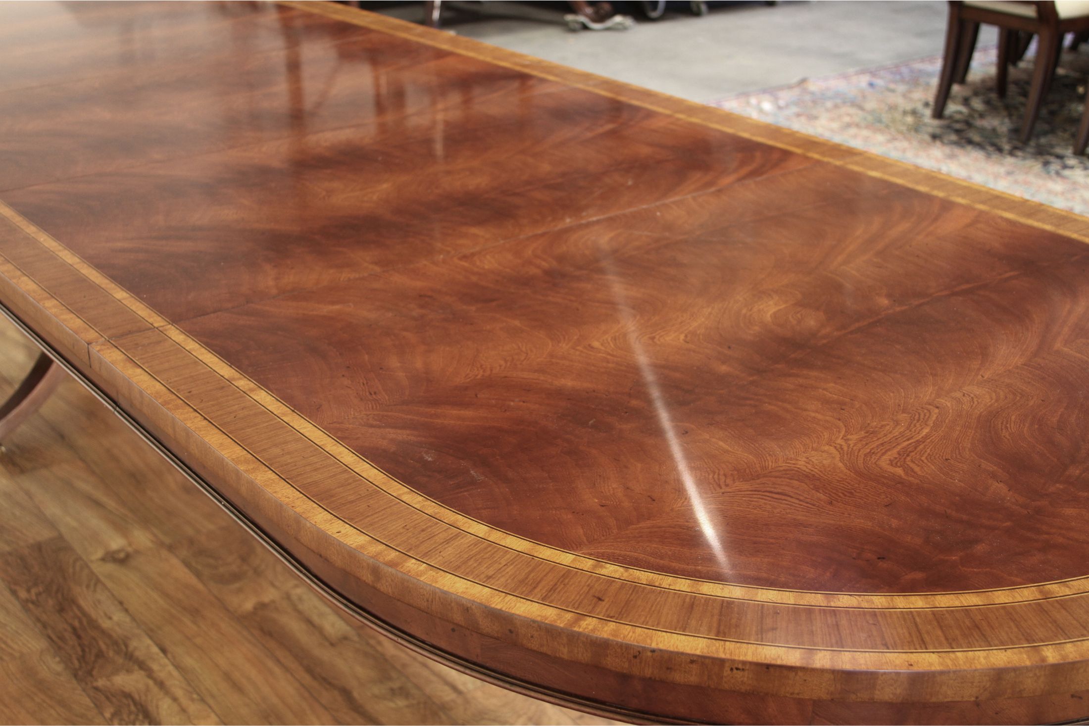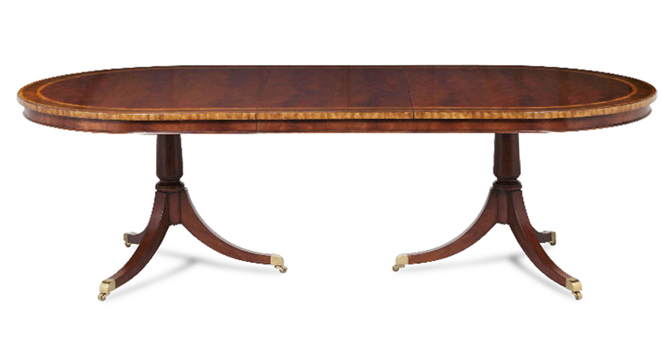Multi-banded swirl mahogany double pedestal dining table with two leaves
