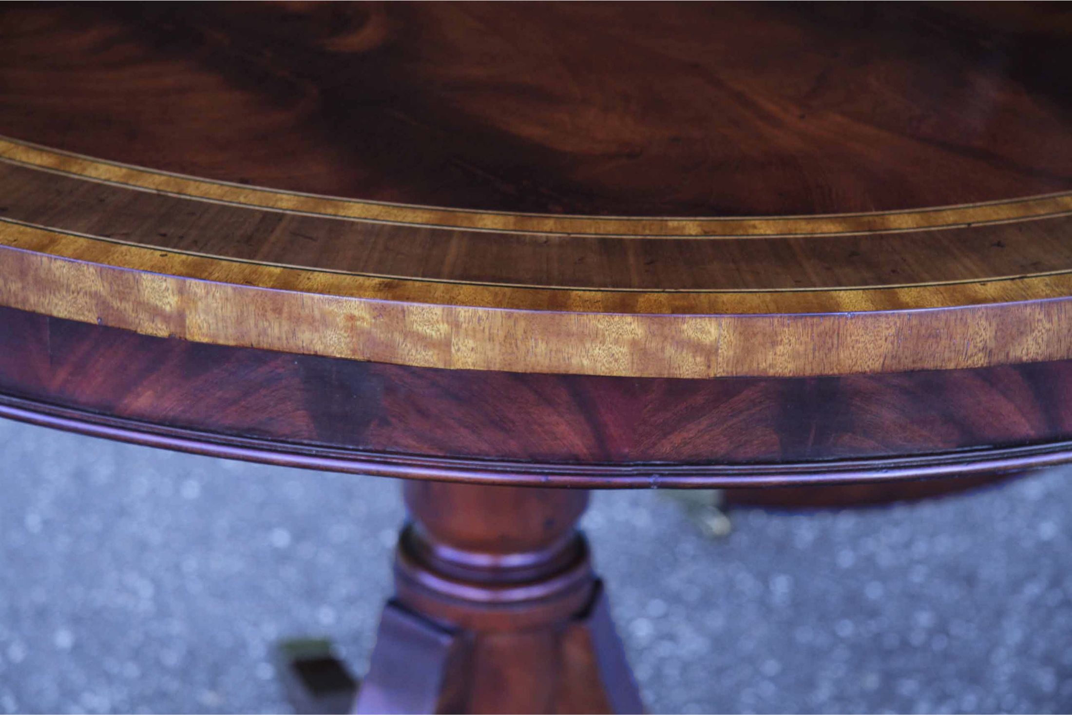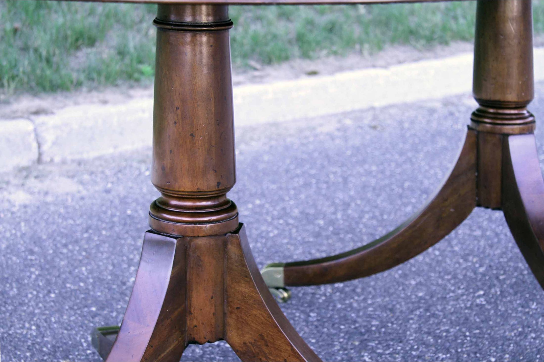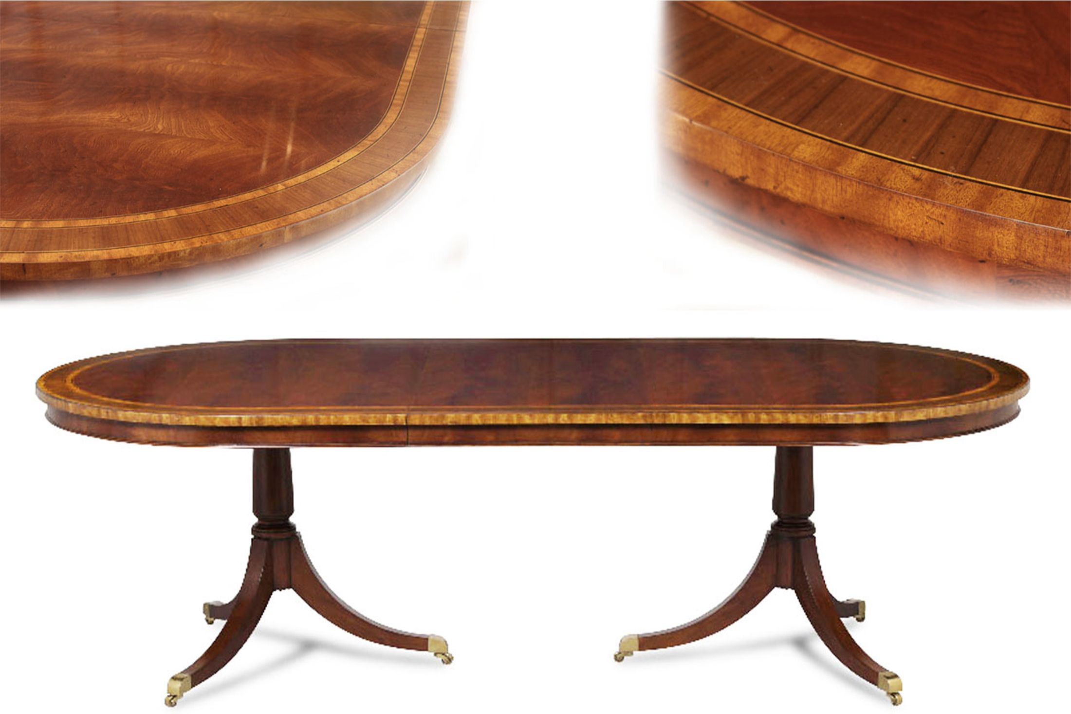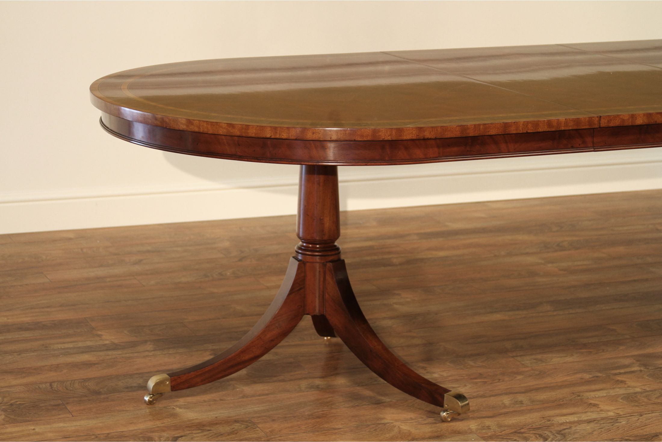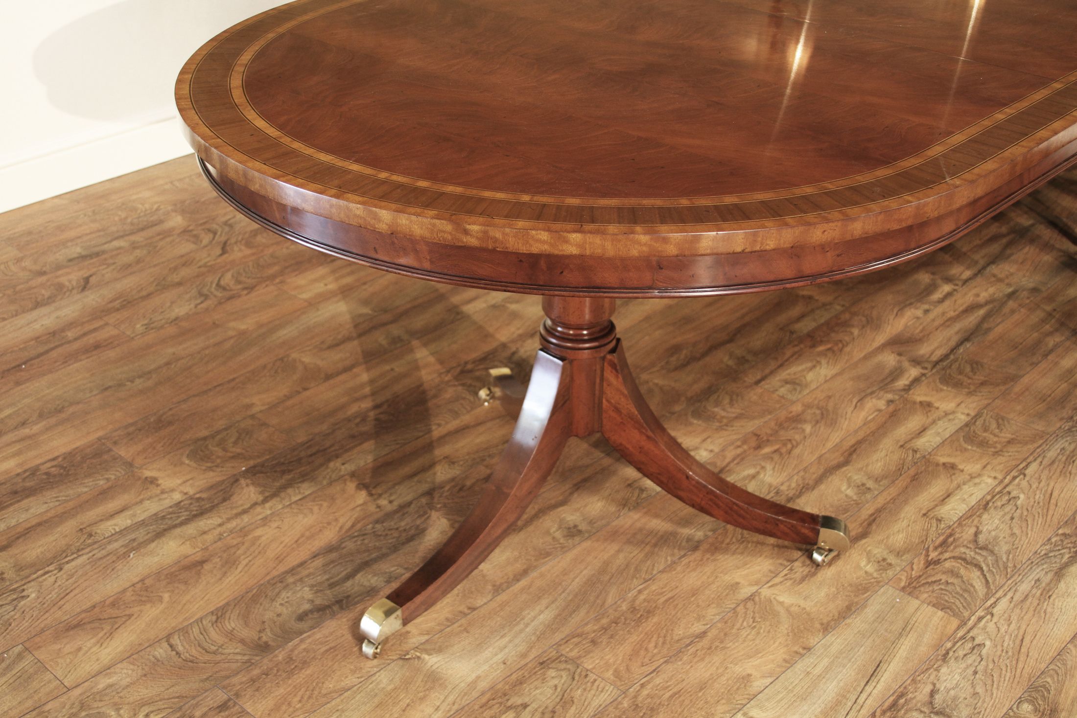 Crotch mahogany and walnut oval dining table with brass casters and two removable 22″ leaves. A multi-banded swirl mahogany dining tabletop on a paid of solid mahogany Duncan Phyfe pedestals. Table is 76” long and includes two 22” leaves and opens to 10 feet. Table can be used with no leaves, one leaf or both leaves.