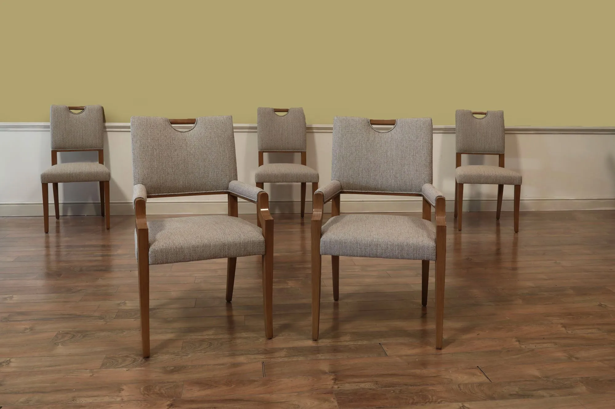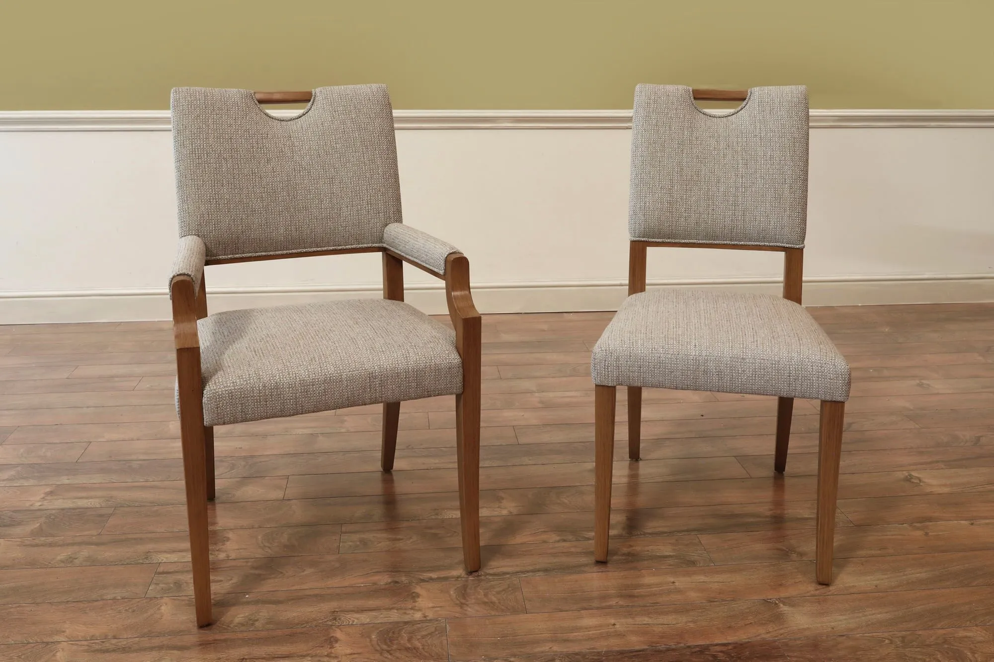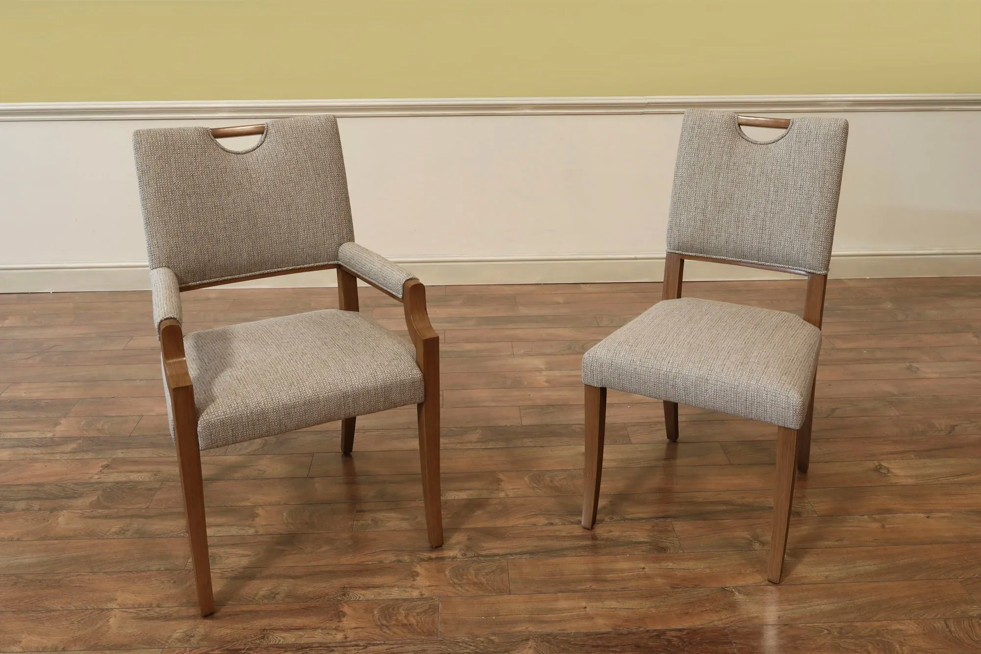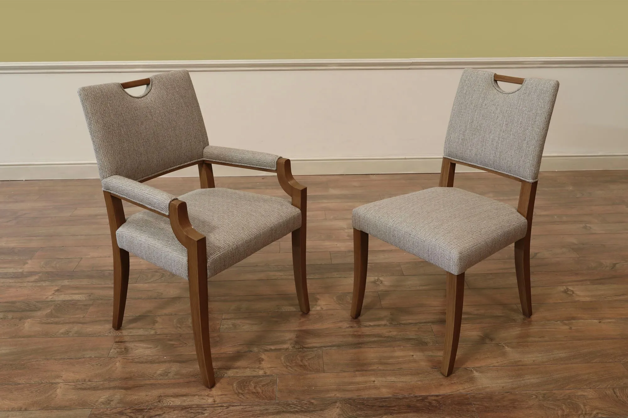 Simple-styled handle-back Parsons chair with customizable wood finish and upholstery options. These are modernized, high-end, customizable dining room chairs that will coordinate with our dining tables.