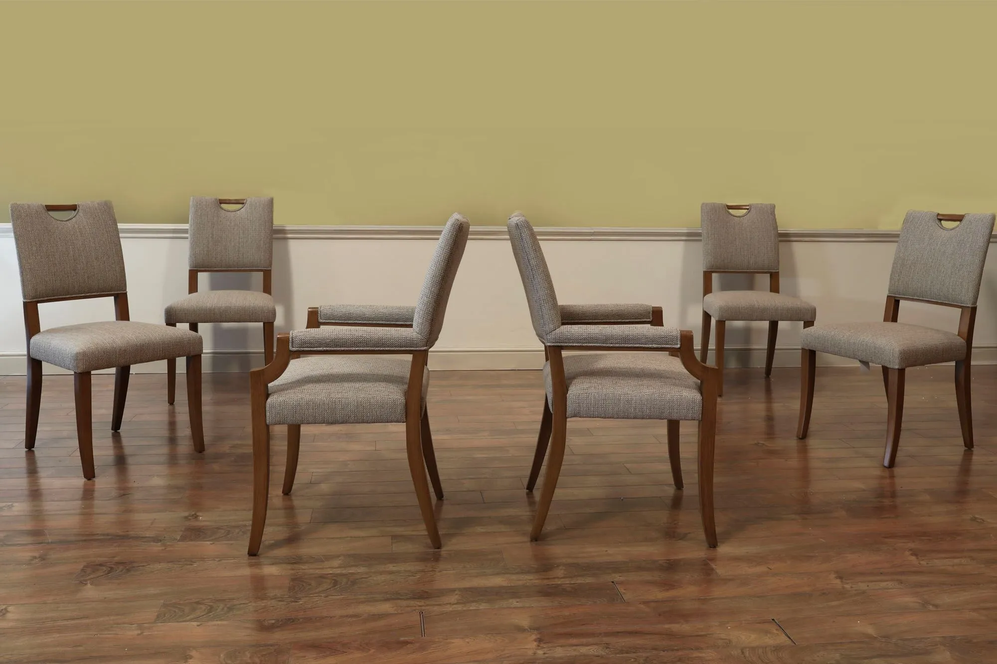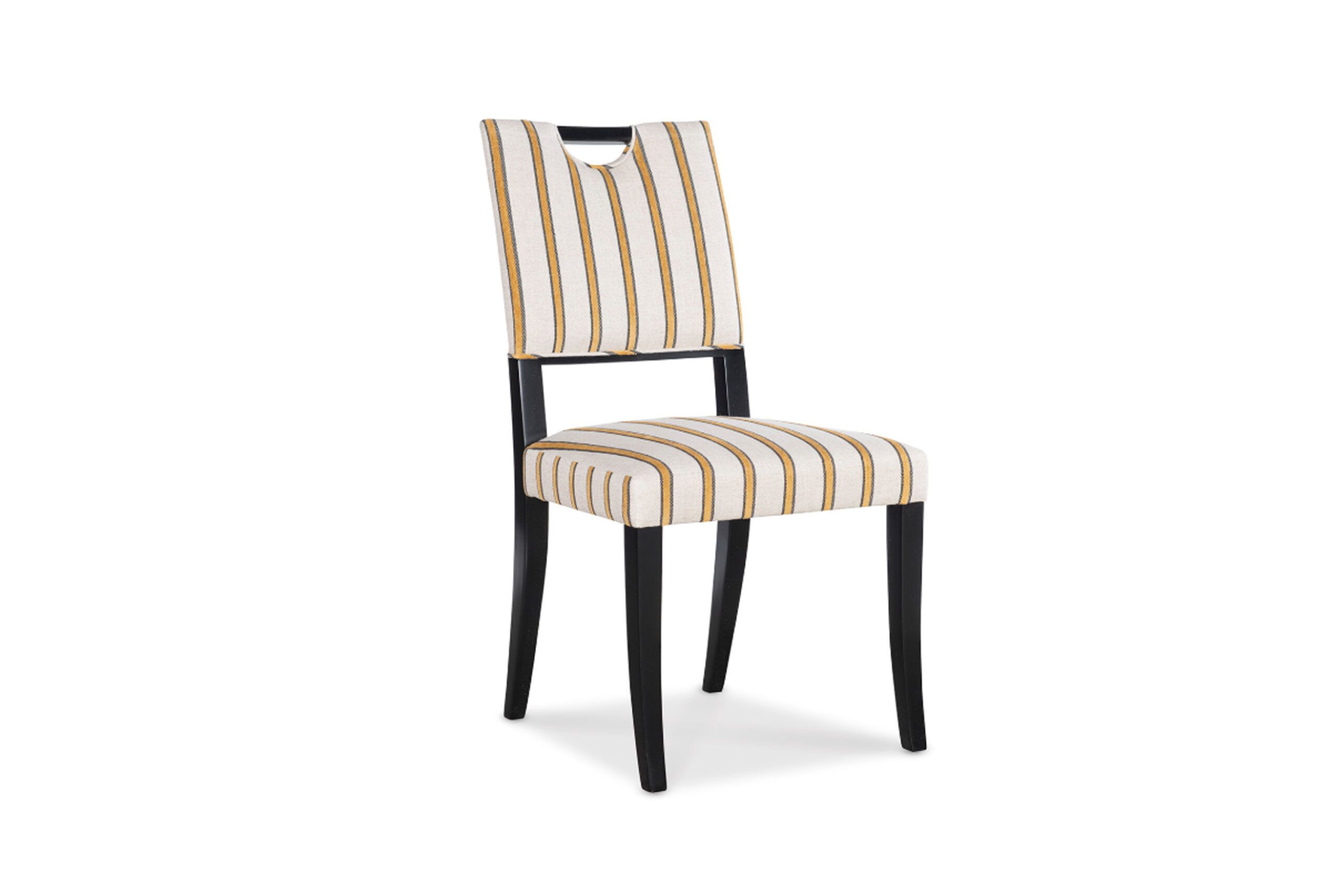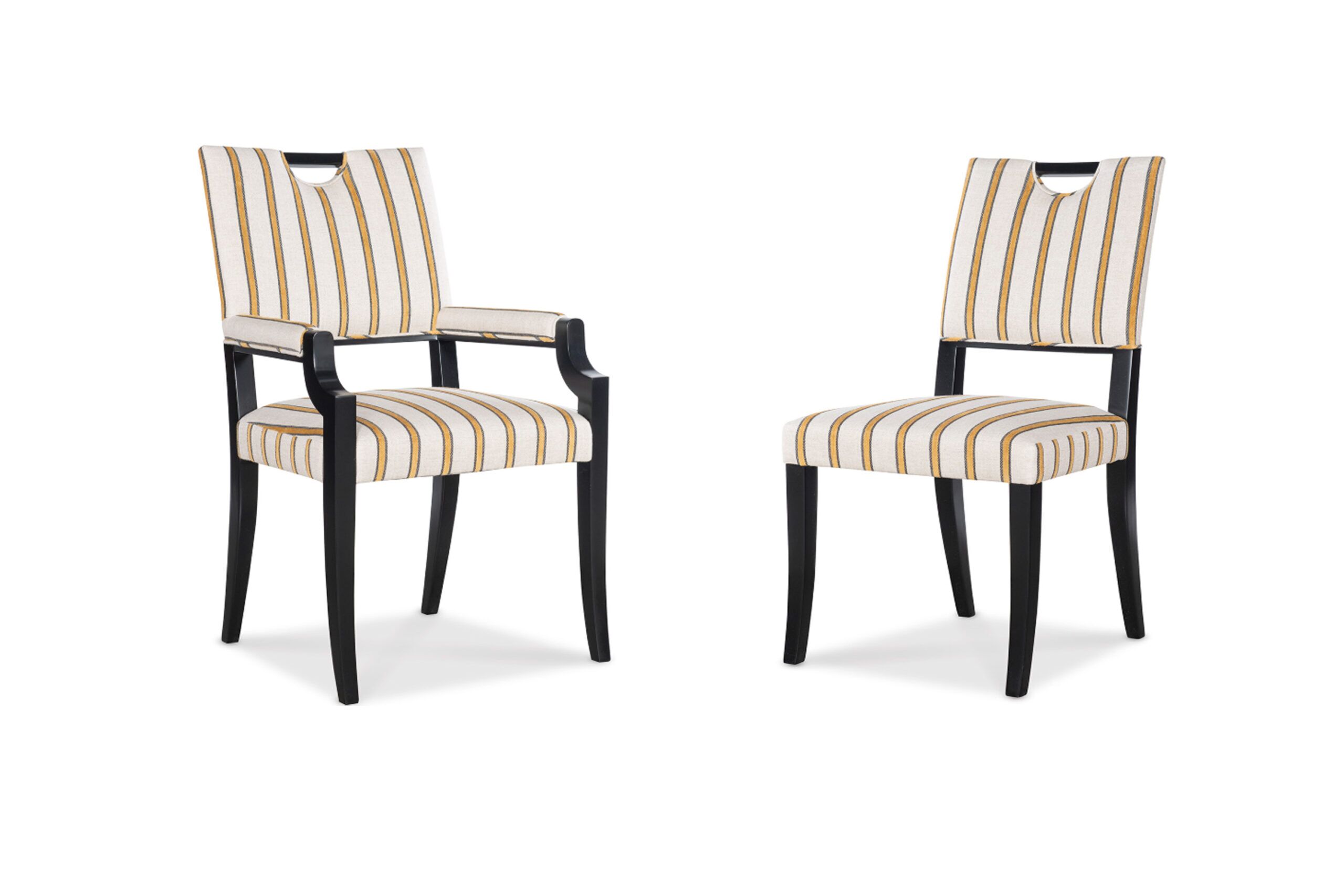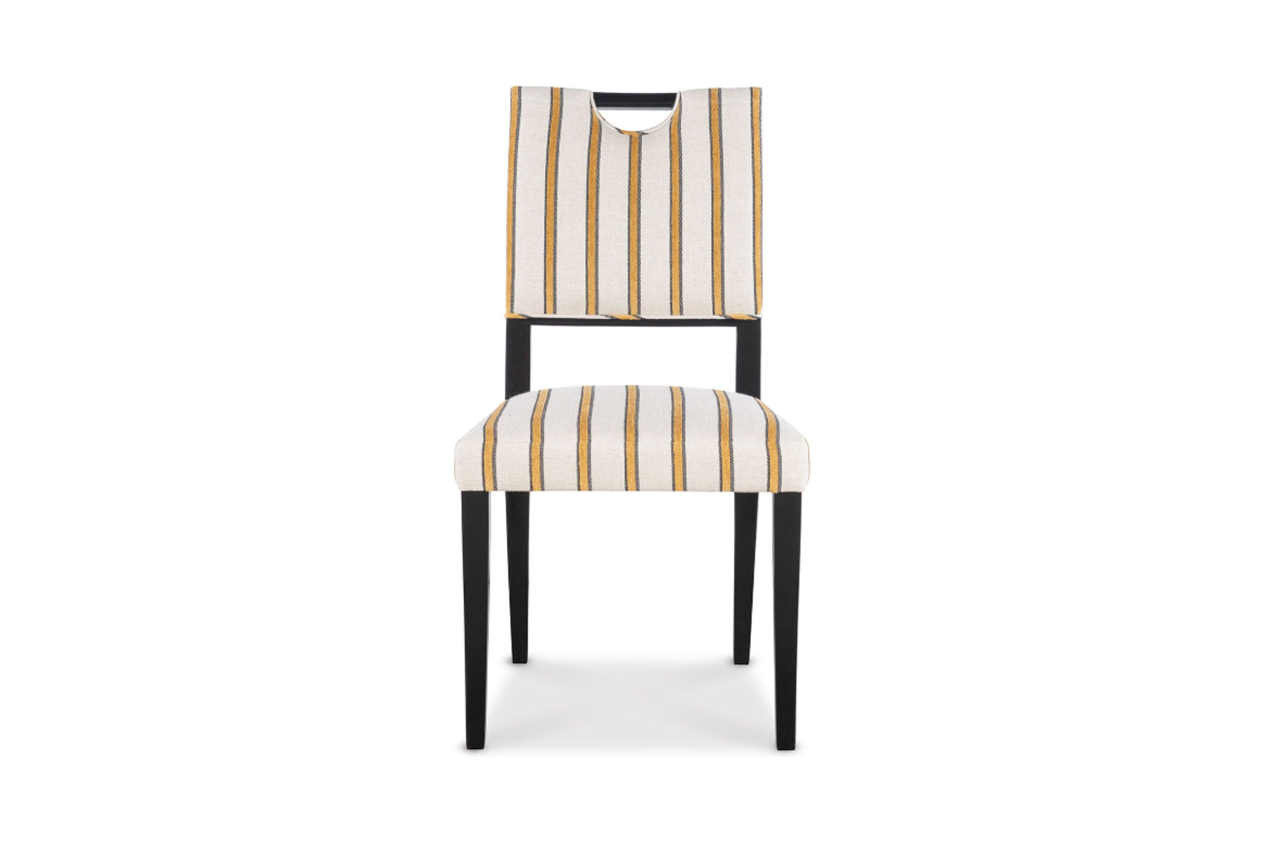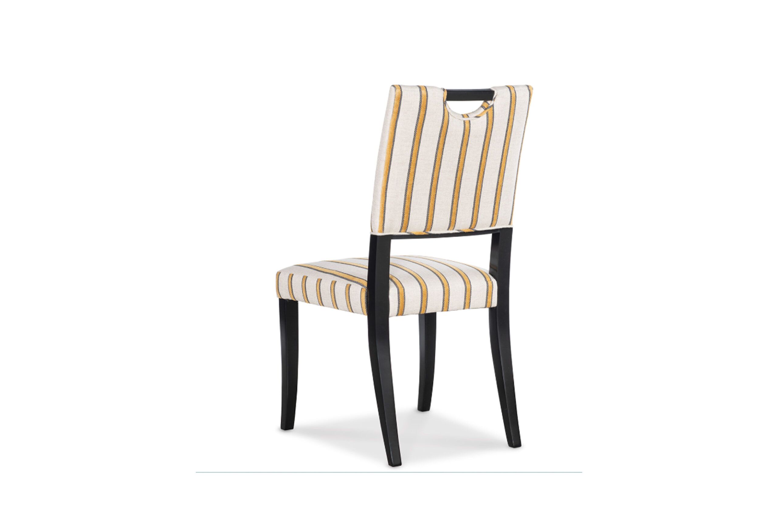 Simple-styled handle-back Parsons chair with customizable wood finish and upholstery options. These are modernized, high-end, customizable dining room chairs that will coordinate with our dining tables.