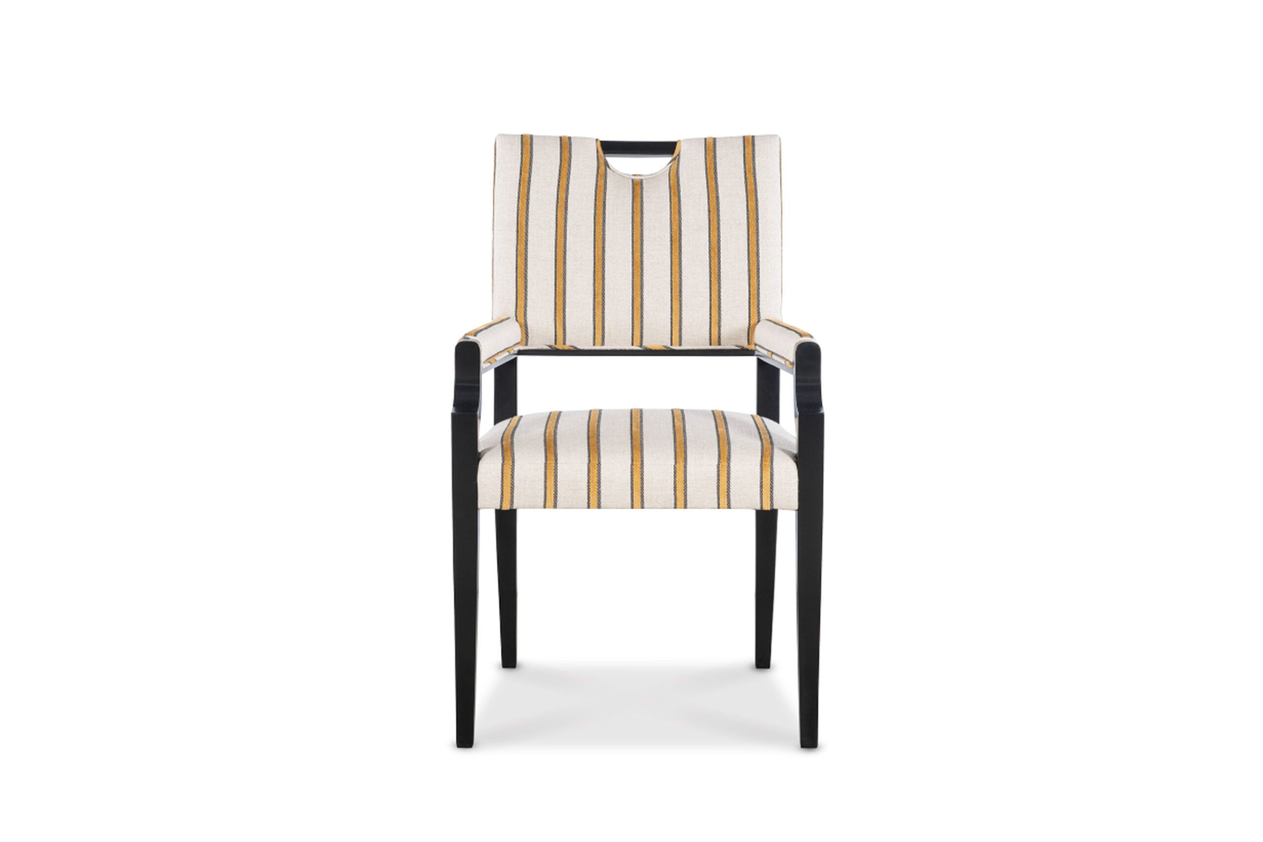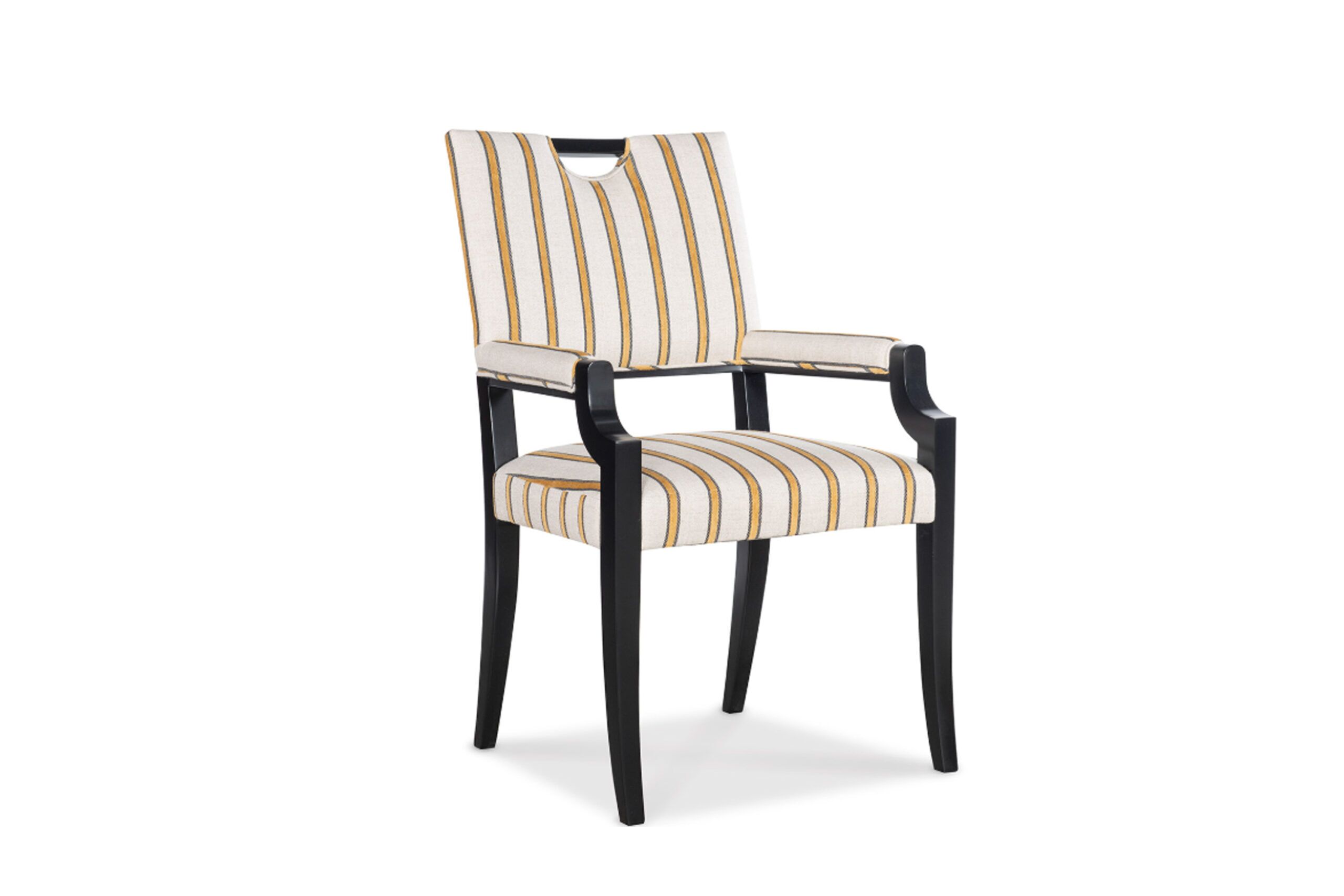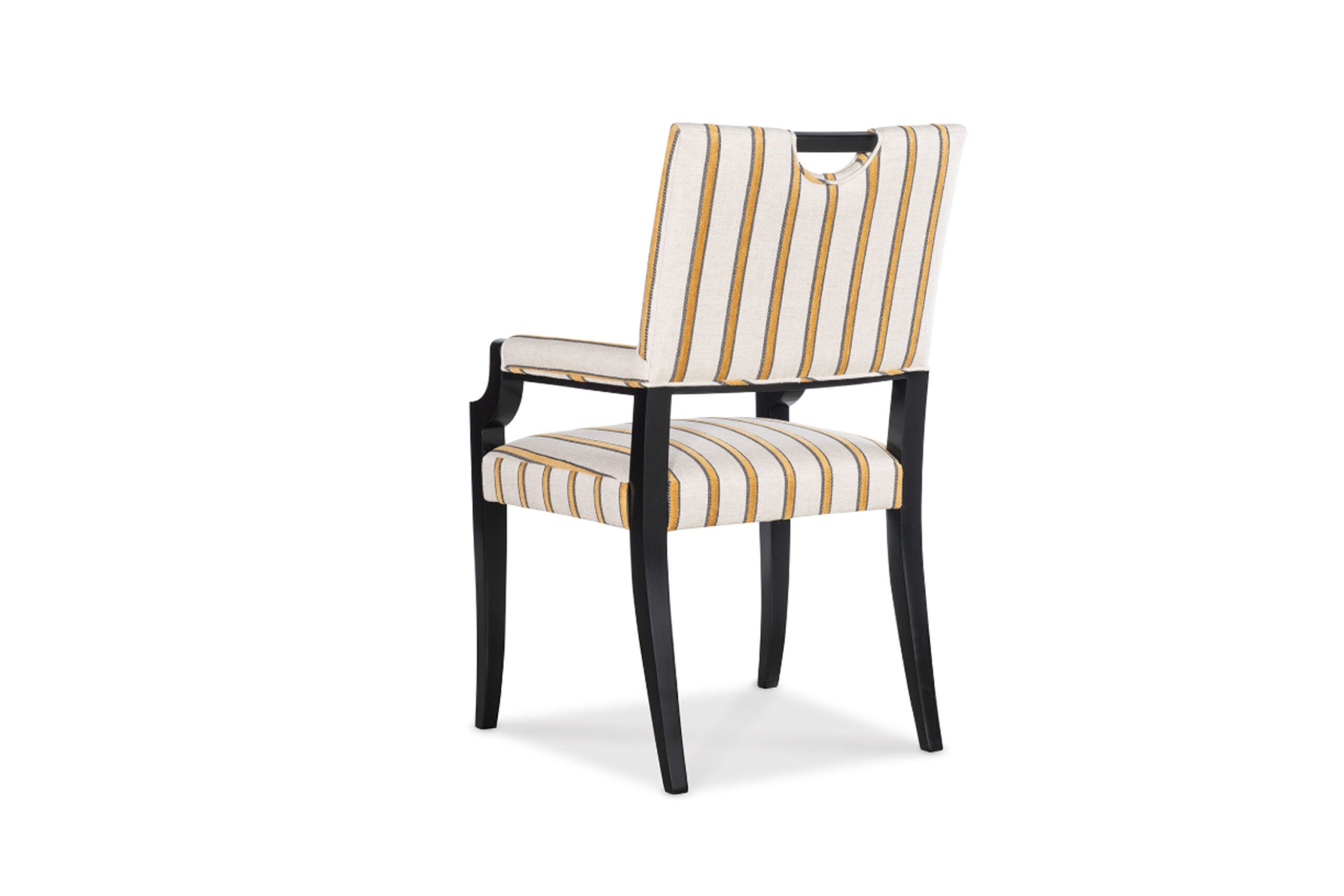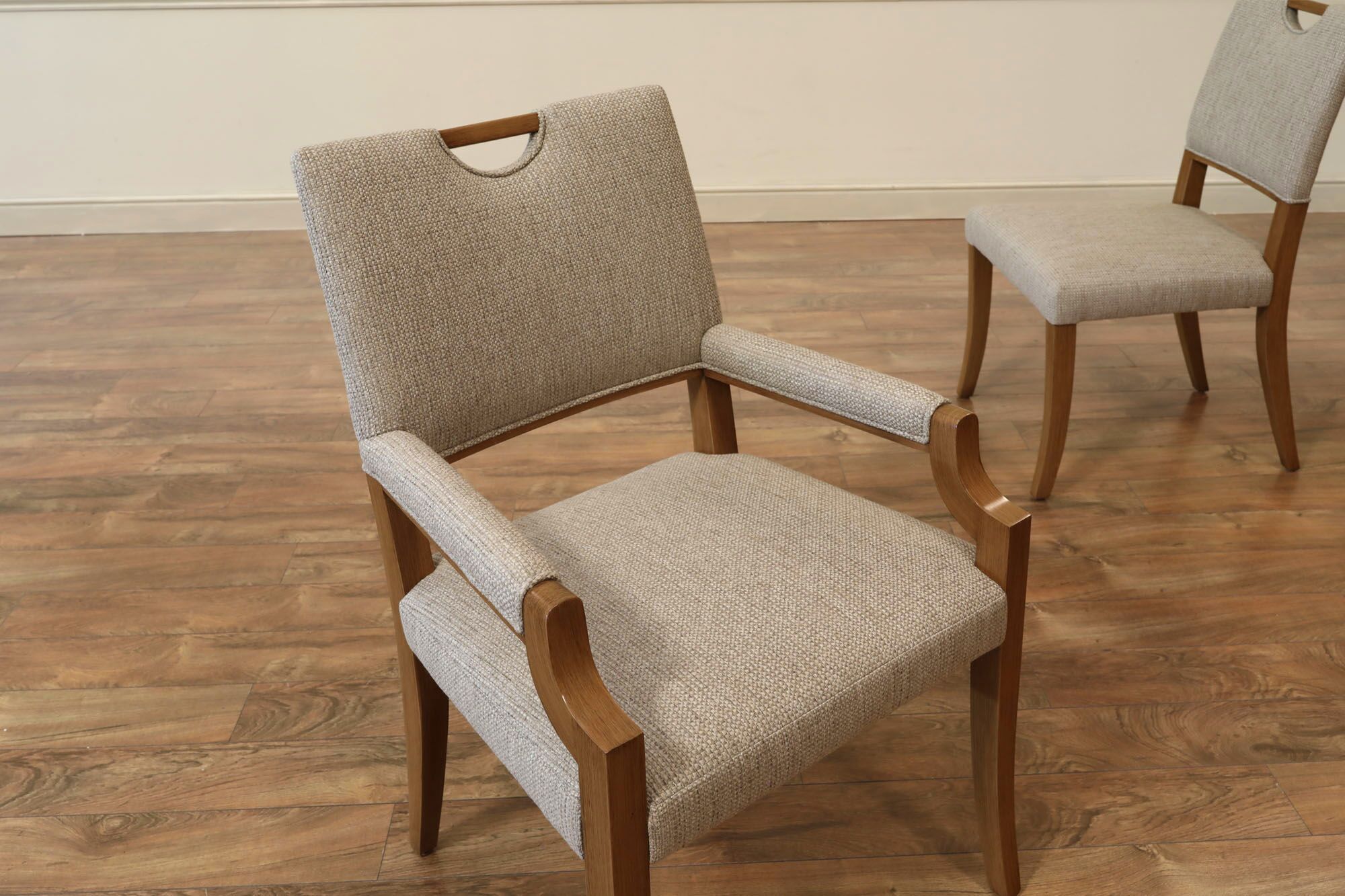 Simple-styled handle-back Parsons chair with customizable wood finish and upholstery options. These are modernized, high-end, customizable dining room chairs that will coordinate with our dining tables.