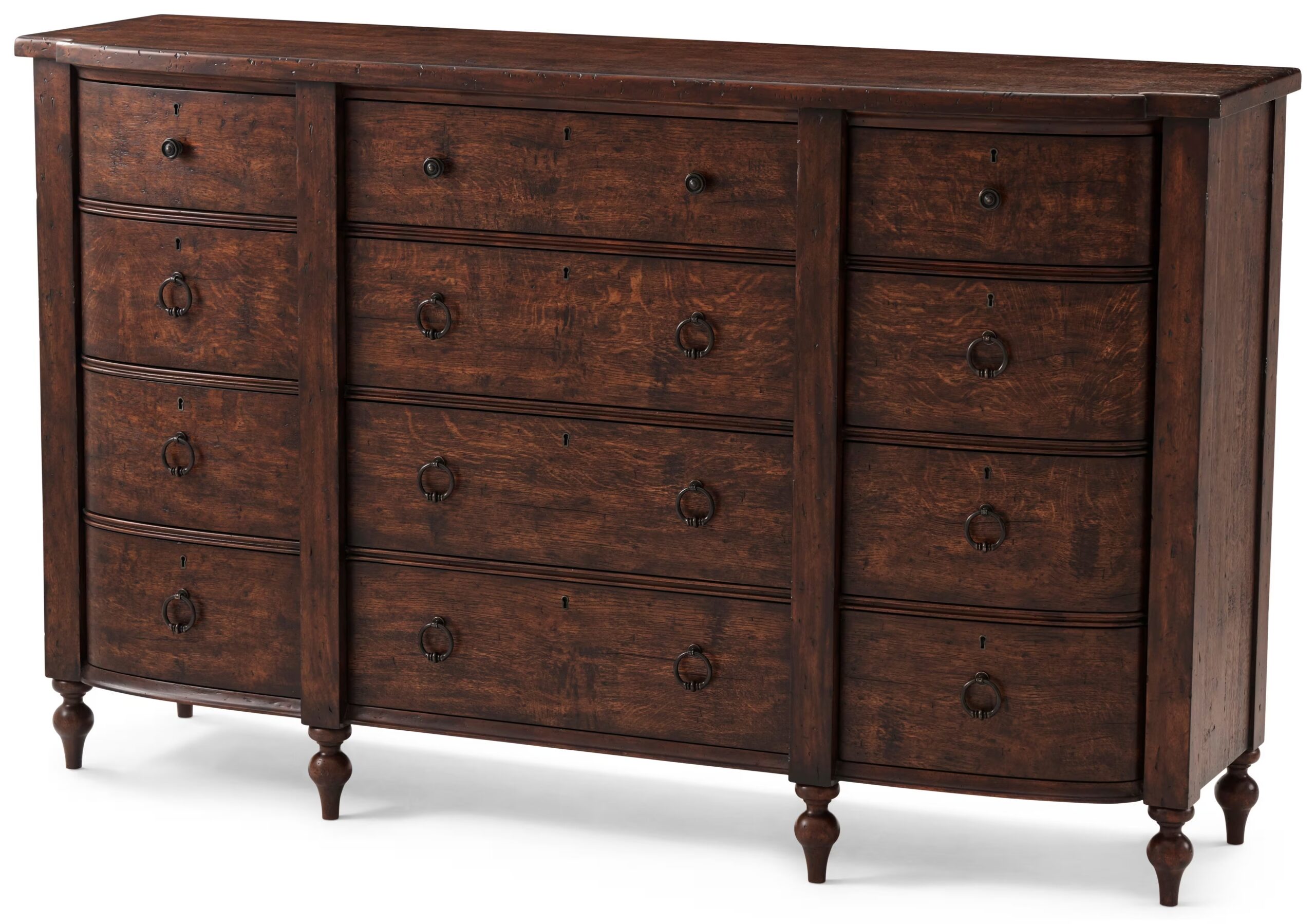 A dresser constructed in reclaimed oak veneer with khaya wood, featuring a shaped top that defines the upper profile. The case is fitted with drawers presenting bellied fronts, creating a subtle outward curvature across the façade. Each drawer is fitted with oil-rubbed escutcheons and pulls, providing consistent hardware across the front. The structure is supported by six finely turned legs, positioned to distribute weight along the length of the case. Bold pilasters frame the case, reinforcing the vertical structure and separating the drawer groupings. The combination of bellied drawer faces, turned legs, and pilaster framing creates a layered composition across the front.