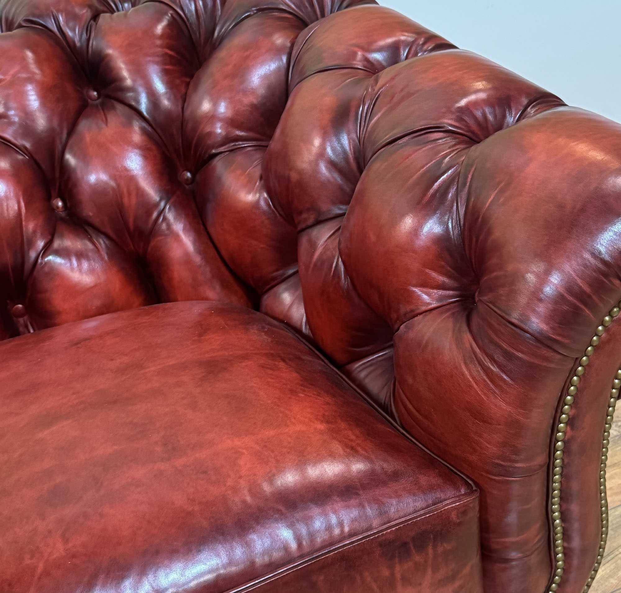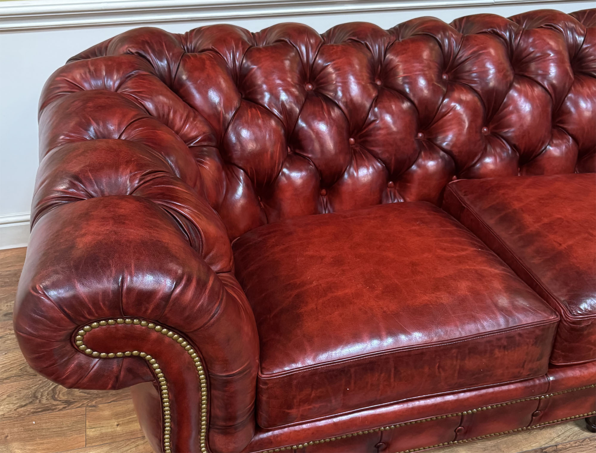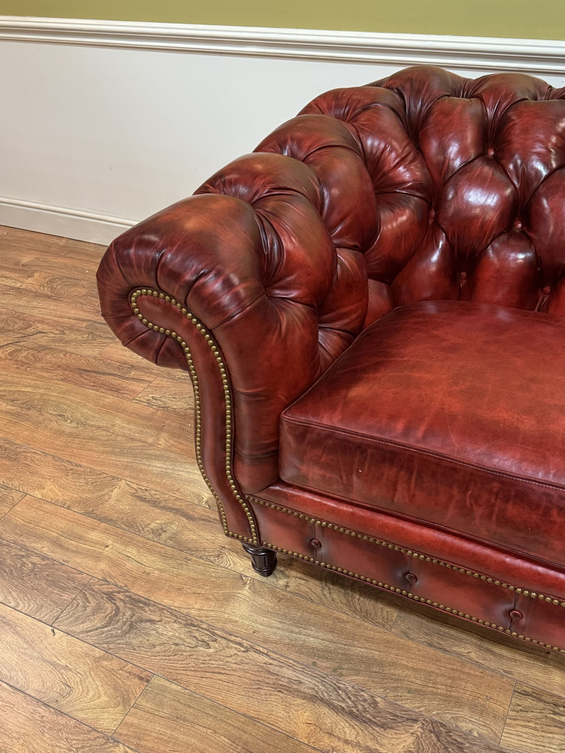 Home » Catalog » Red Leather Couch, American Made Garnet-Red Tufted Chesterfield