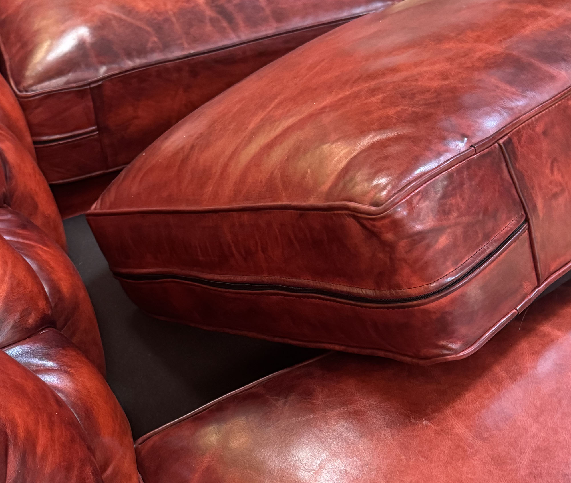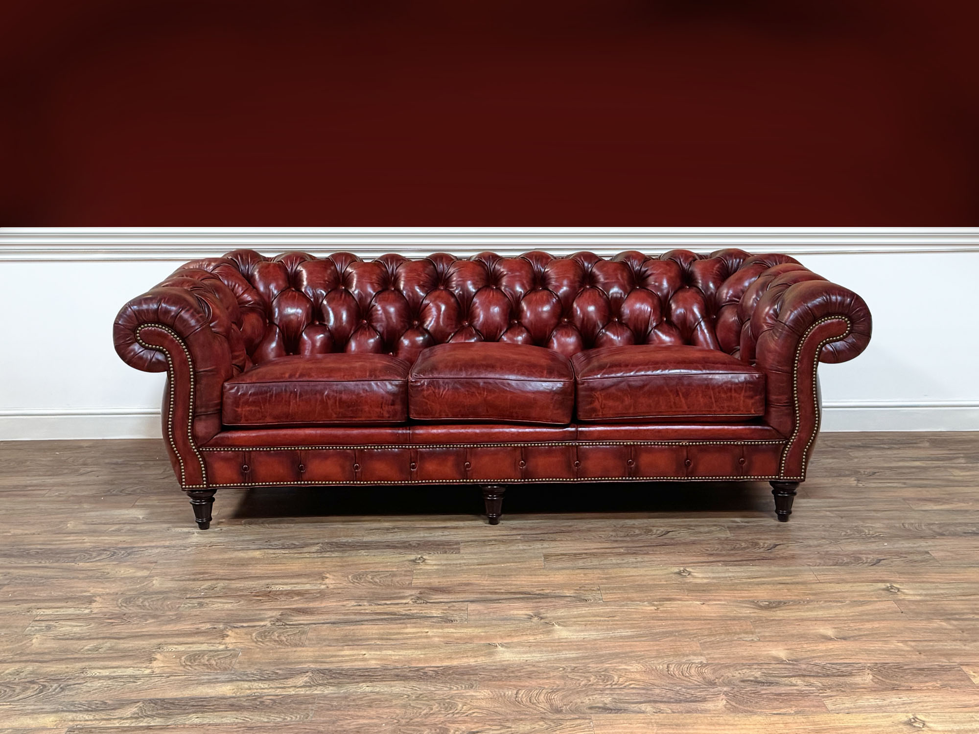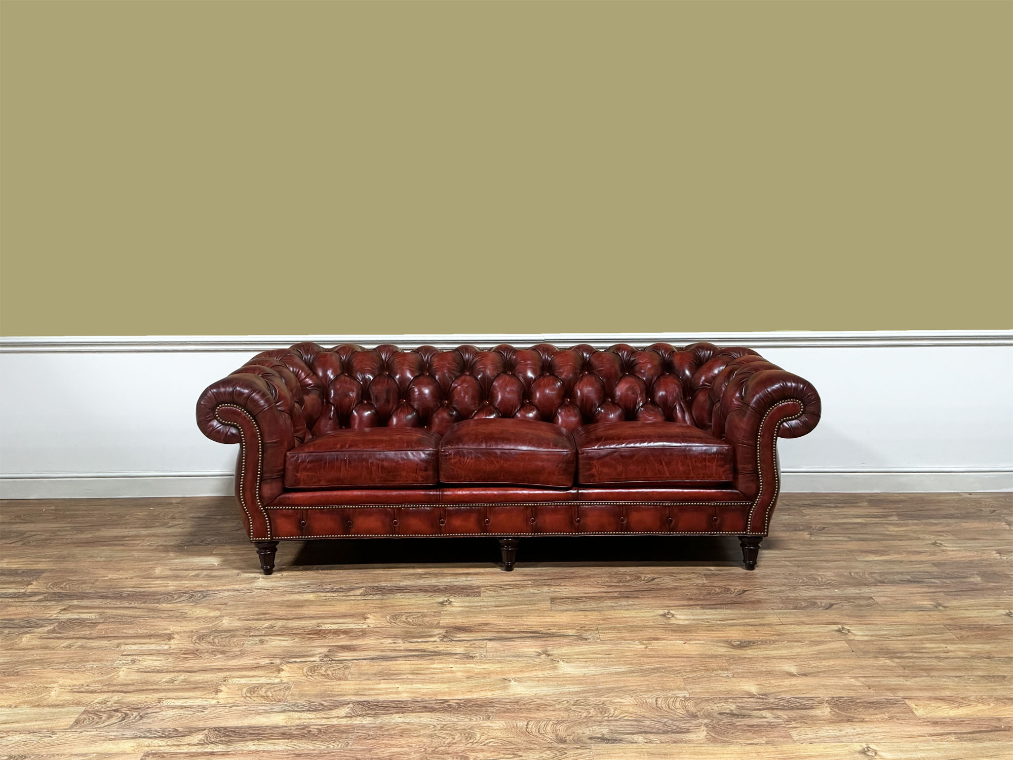 Home » Catalog » Red Leather Couch, American Made Garnet-Red Tufted Chesterfield