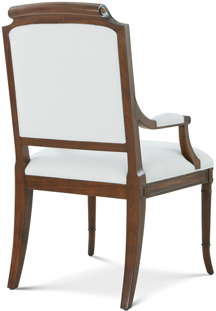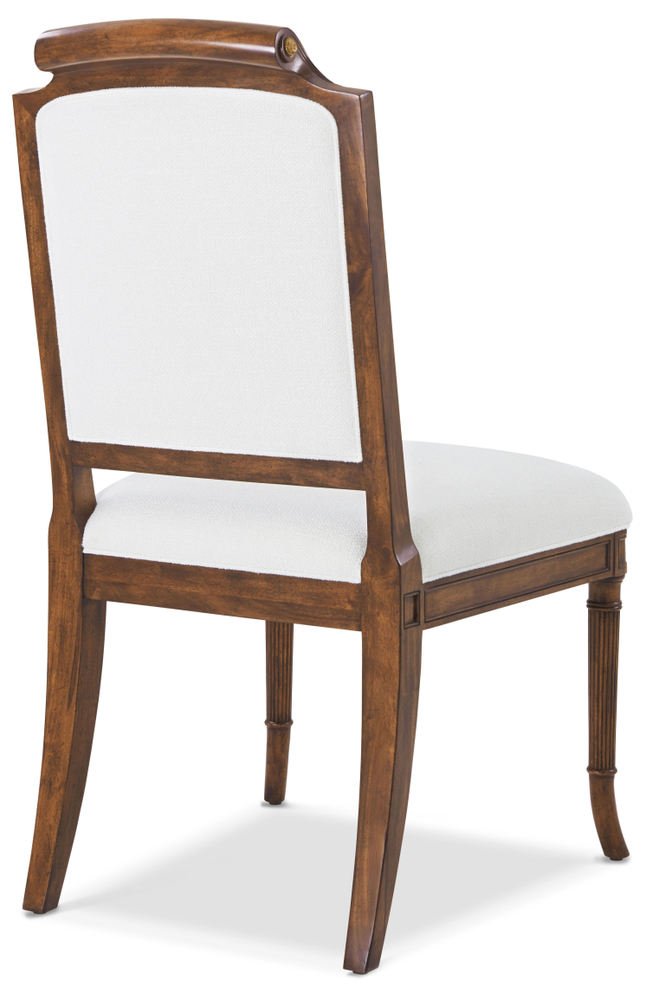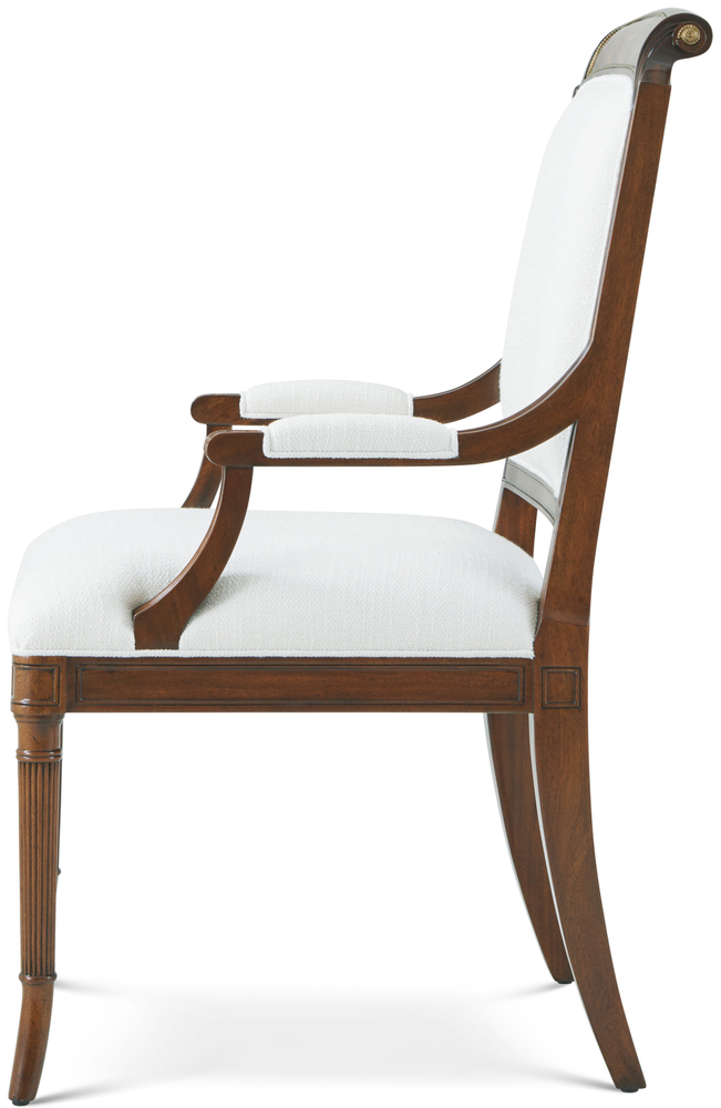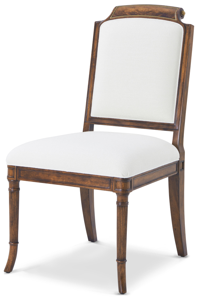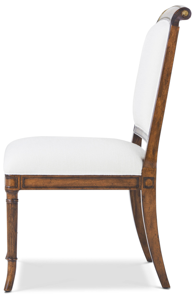 A solid Regency-style scroll-back dining room chair. This chair has fluted splayed front legs and saber rear legs. A square framed back with a swirl mahogany scroll over the toprail makes for easy handling. Small antiqued brass florettes on both side of crest.
