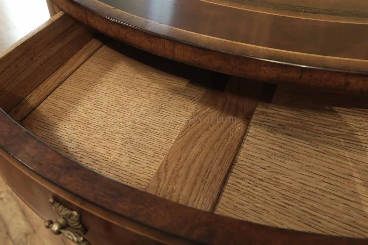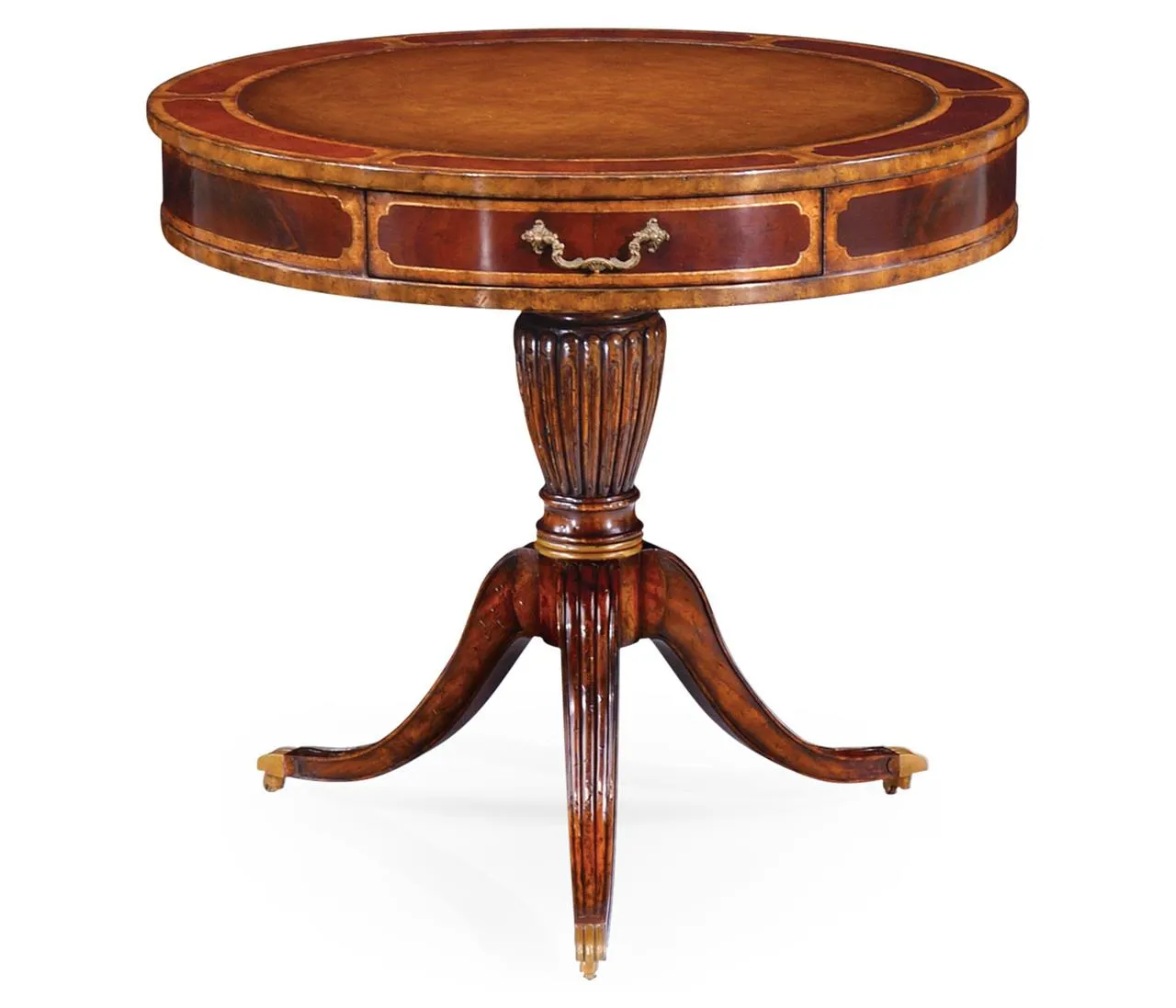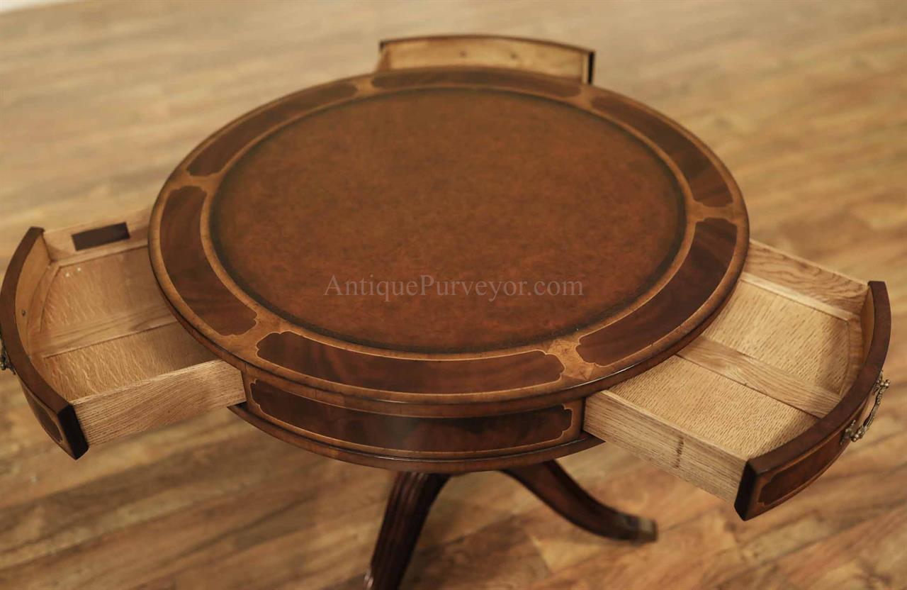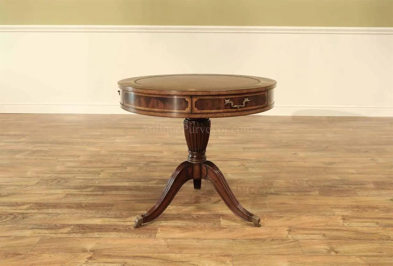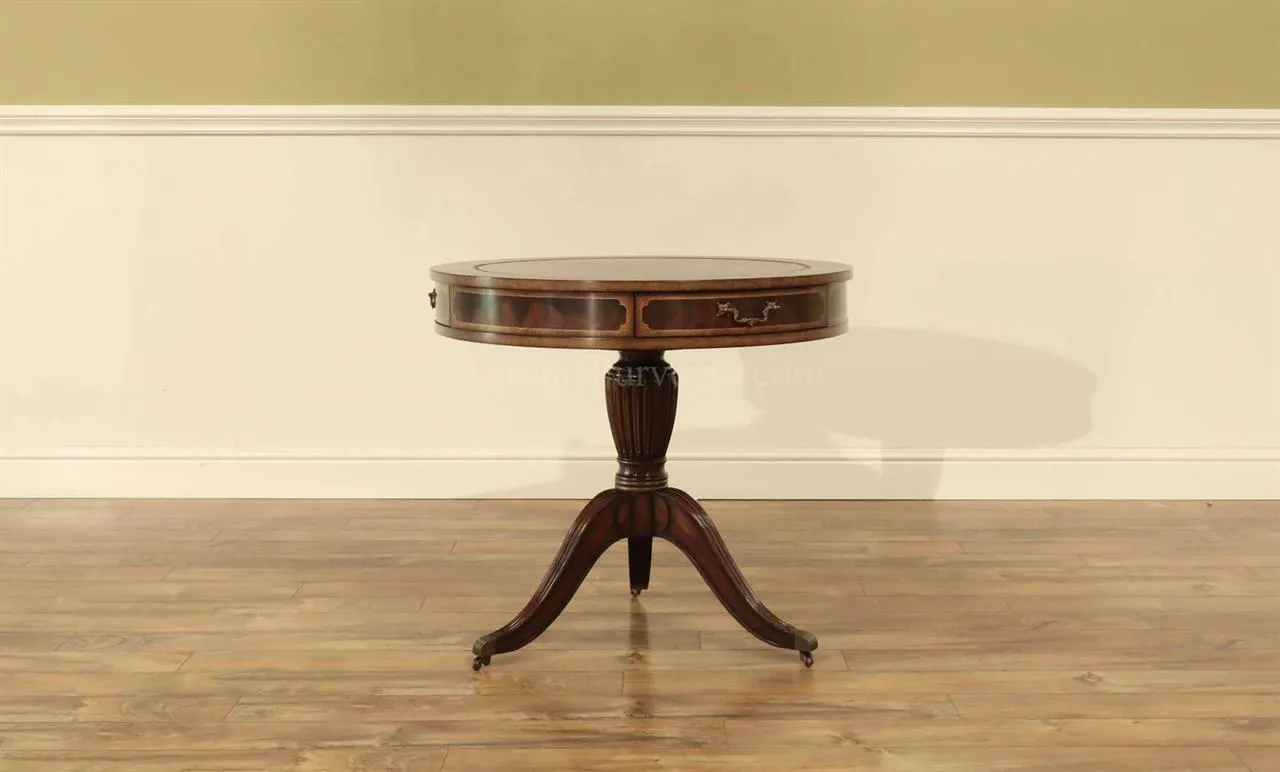 High-end antique reproduction leather top mahogany drum table or traditional center table. Traditional red or green leather top mahogany foyer table. This table is very good quality, it is heavy and made with high end components. Saber legs terminating is custom solid brass feet which are cast with lost wax techniques. This leather top mahogany drum table will work well in any traditional home and it makes a great foyer table. The traditional center table is currently available with two leather options: standard red or traditional green. When adding to cart you will see the option for both colors. Red leather is not really red, just redder than green. It will be a brownish red.