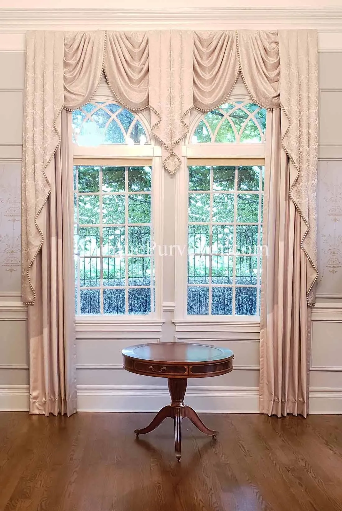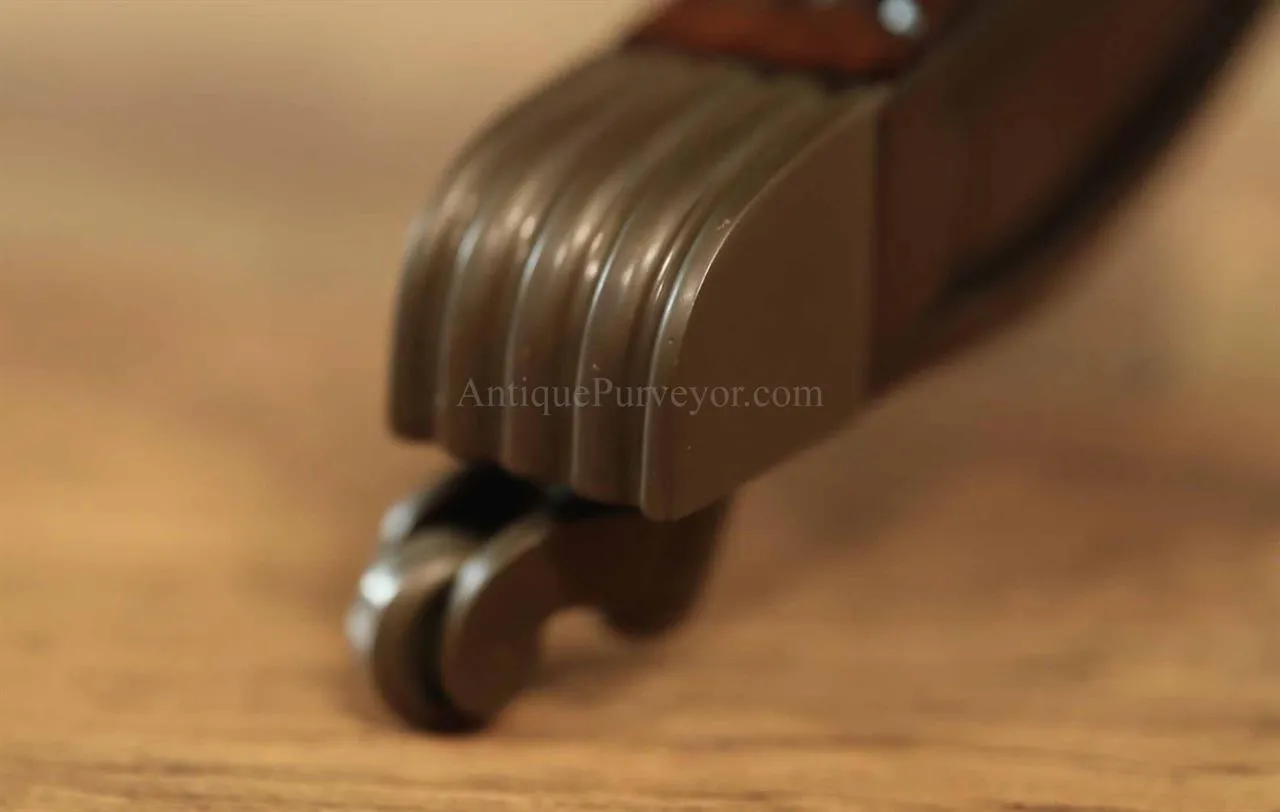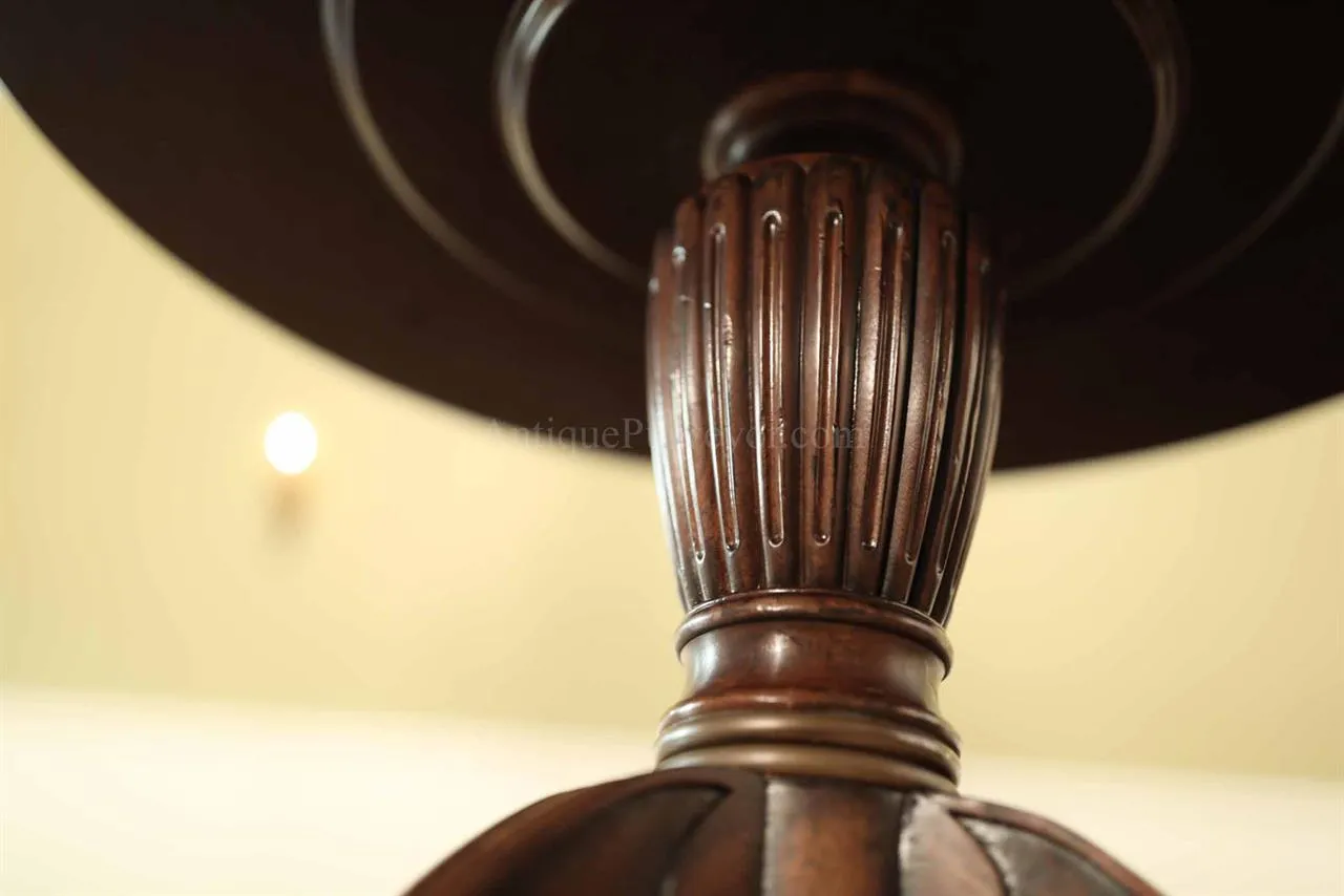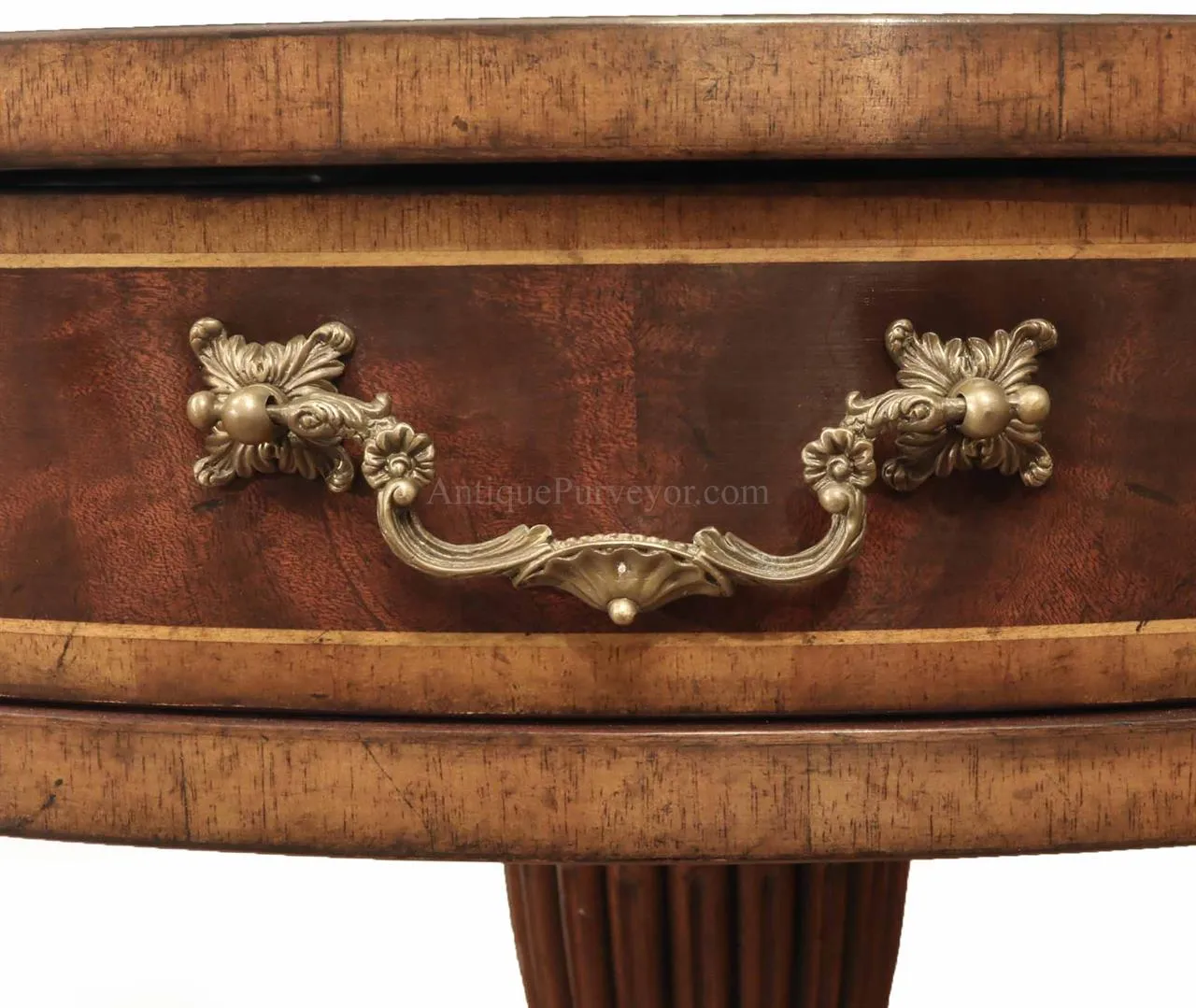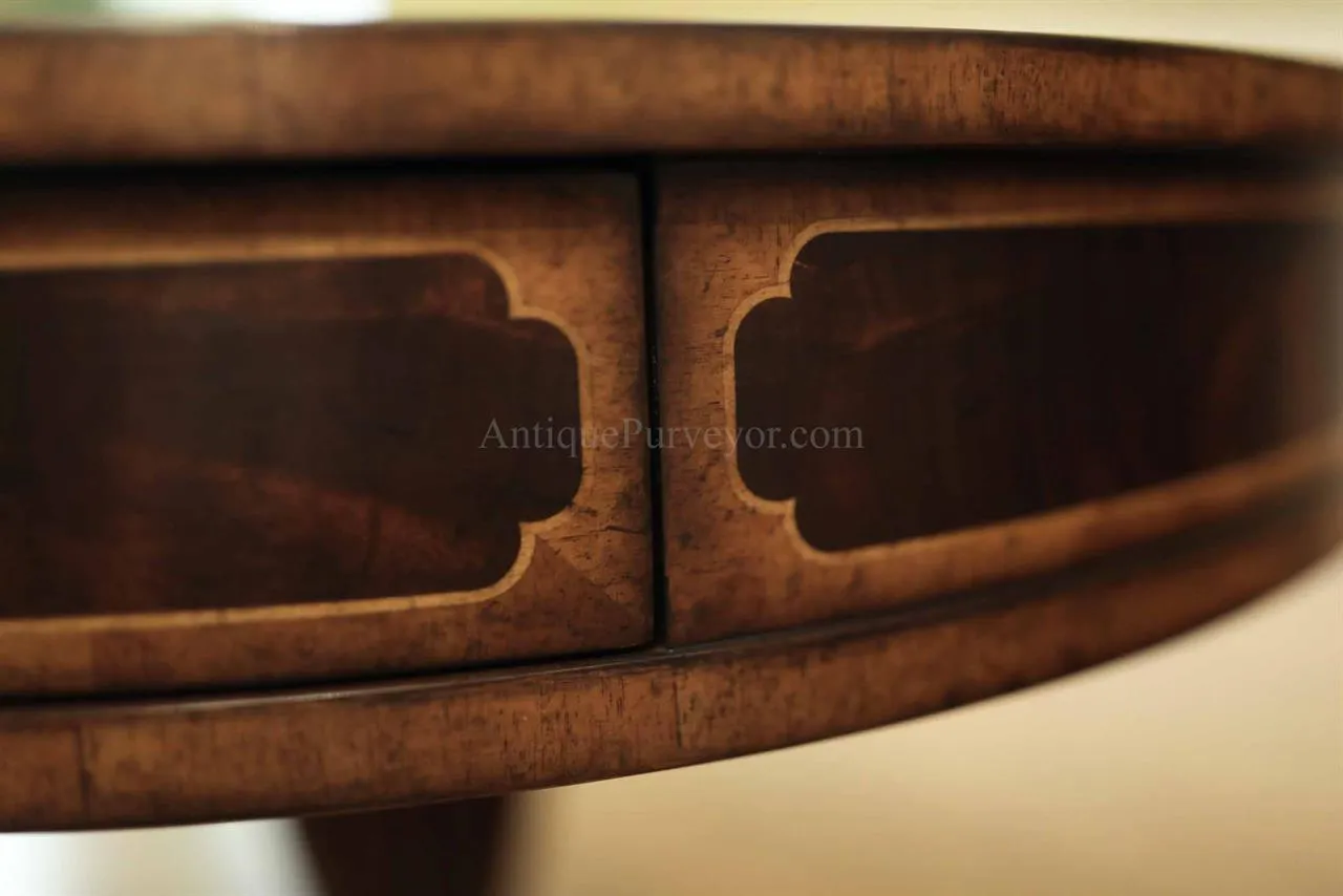 High-end antique reproduction leather top mahogany drum table or traditional center table. Traditional red or green leather top mahogany foyer table. This table is very good quality, it is heavy and made with high end components. Saber legs terminating is custom solid brass feet which are cast with lost wax techniques. This leather top mahogany drum table will work well in any traditional home and it makes a great foyer table. The traditional center table is currently available with two leather options: standard red or traditional green. When adding to cart you will see the option for both colors. Red leather is not really red, just redder than green. It will be a brownish red.