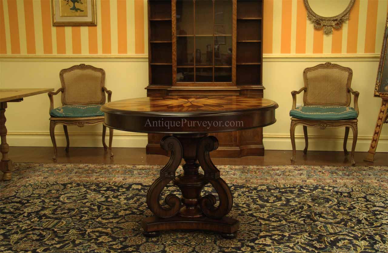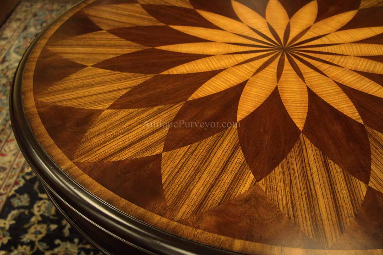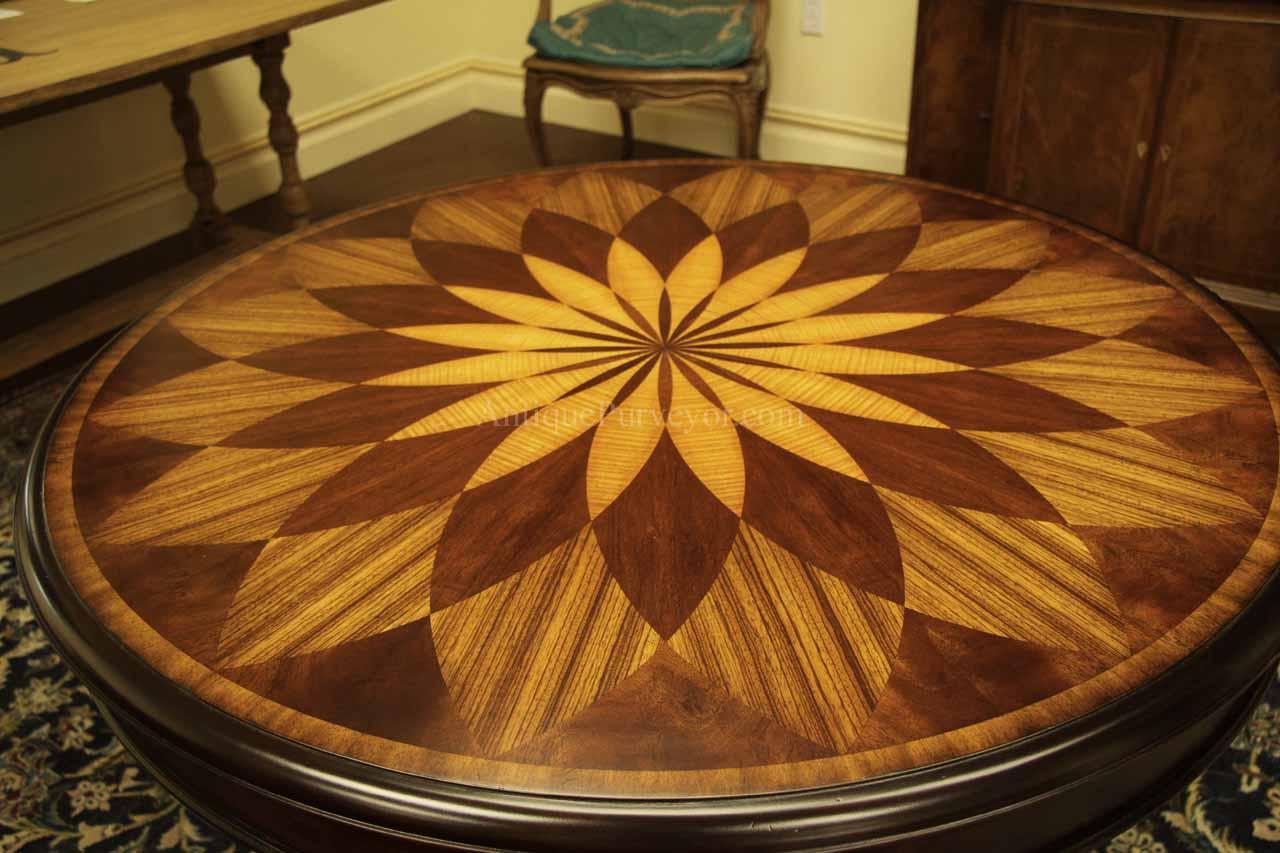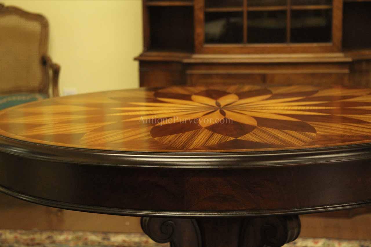 Inlaid mahogany entranceway table or center table. 41 inches round. Handmade marquetry with rosewood and satinwood decorated in star and flower pattern. Crisp floral carved tri leg pedestal base and traditional bun feet. Sturdy center table can also be used as a small round dining table because of its common 30 inch dining height. Quality table, heavy and well made pedestal table for a high end home or office. Table is also fitted with a decorative yet simple apron.