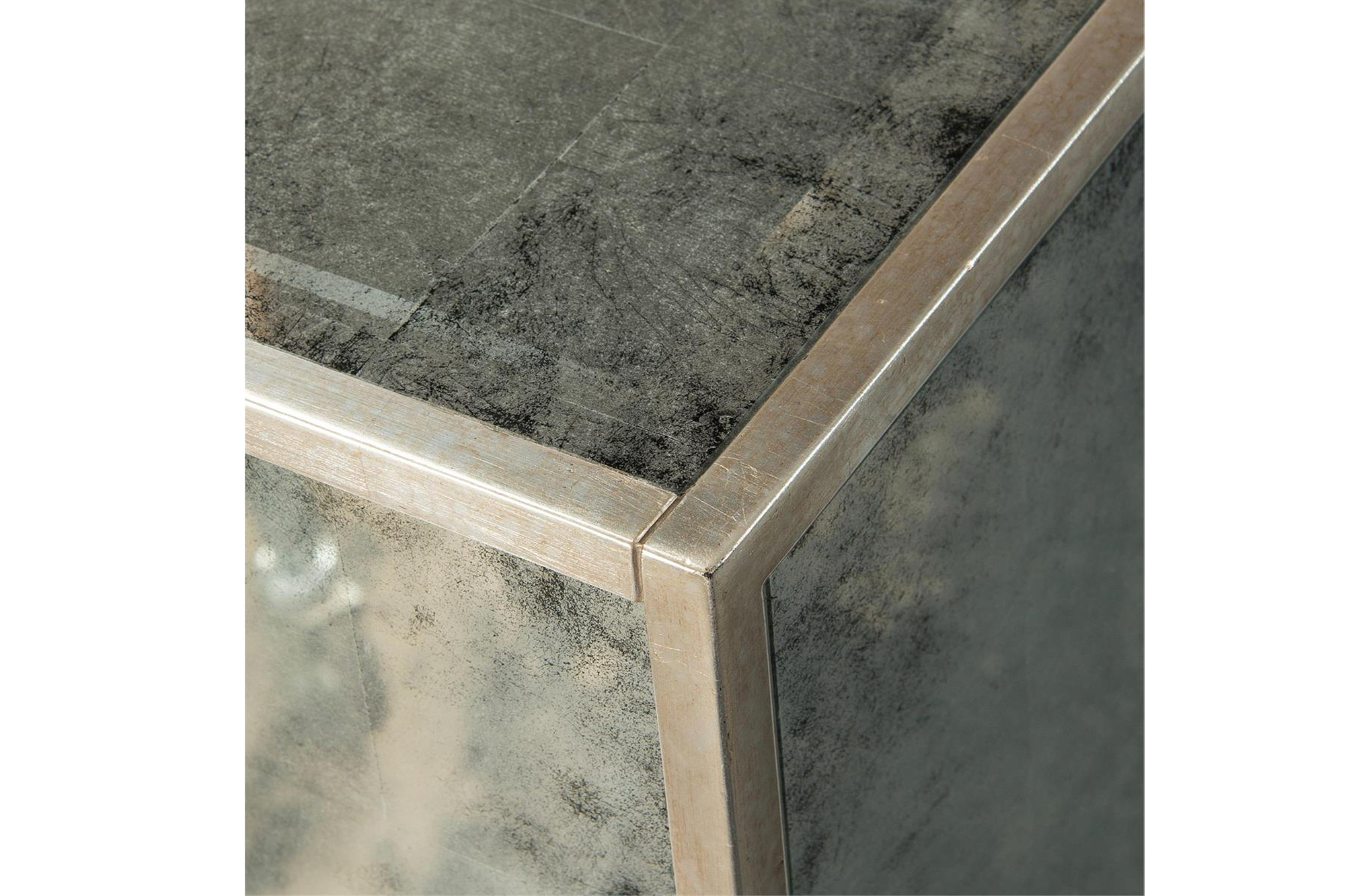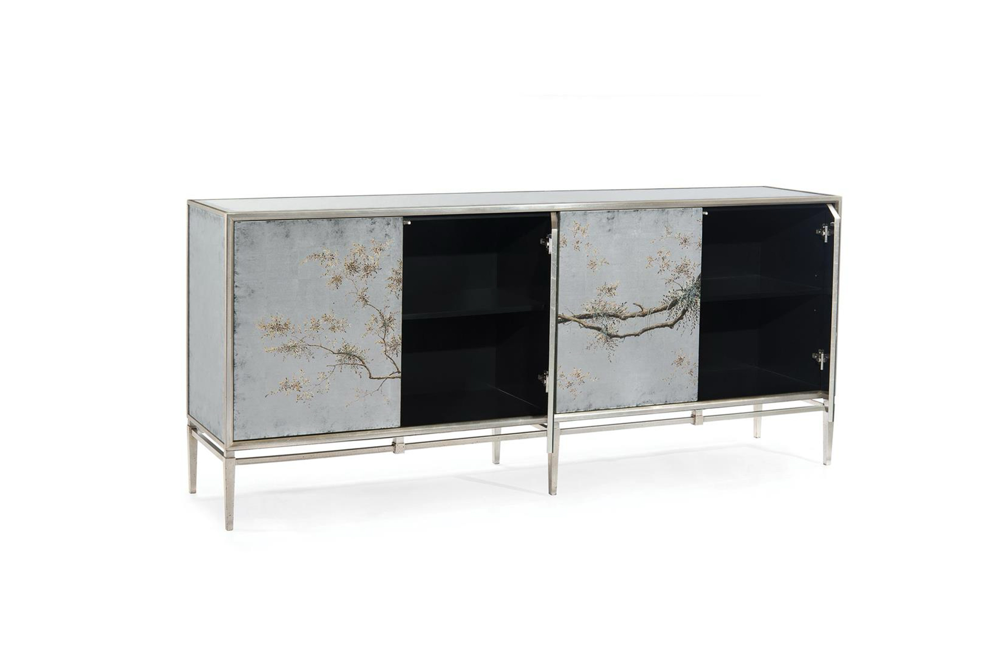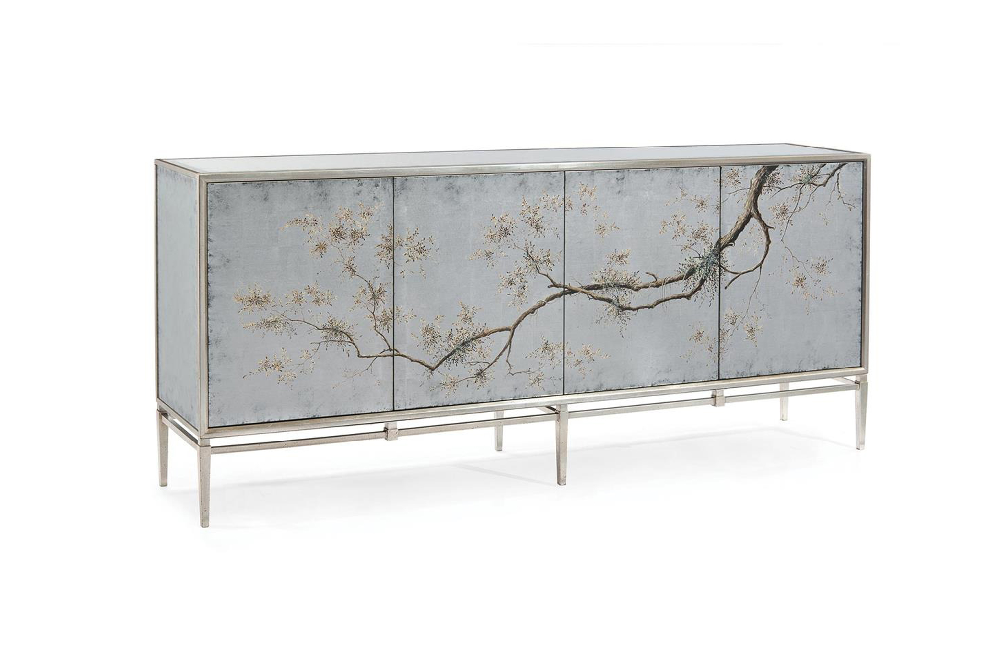 The four doors of this credenza feature églomisé panels with a reverse-hand-painted branch running across them to make a complete picture. The carcass, raised on a steel frame, is inset with églomisé side panels and a beveled églomisé top.