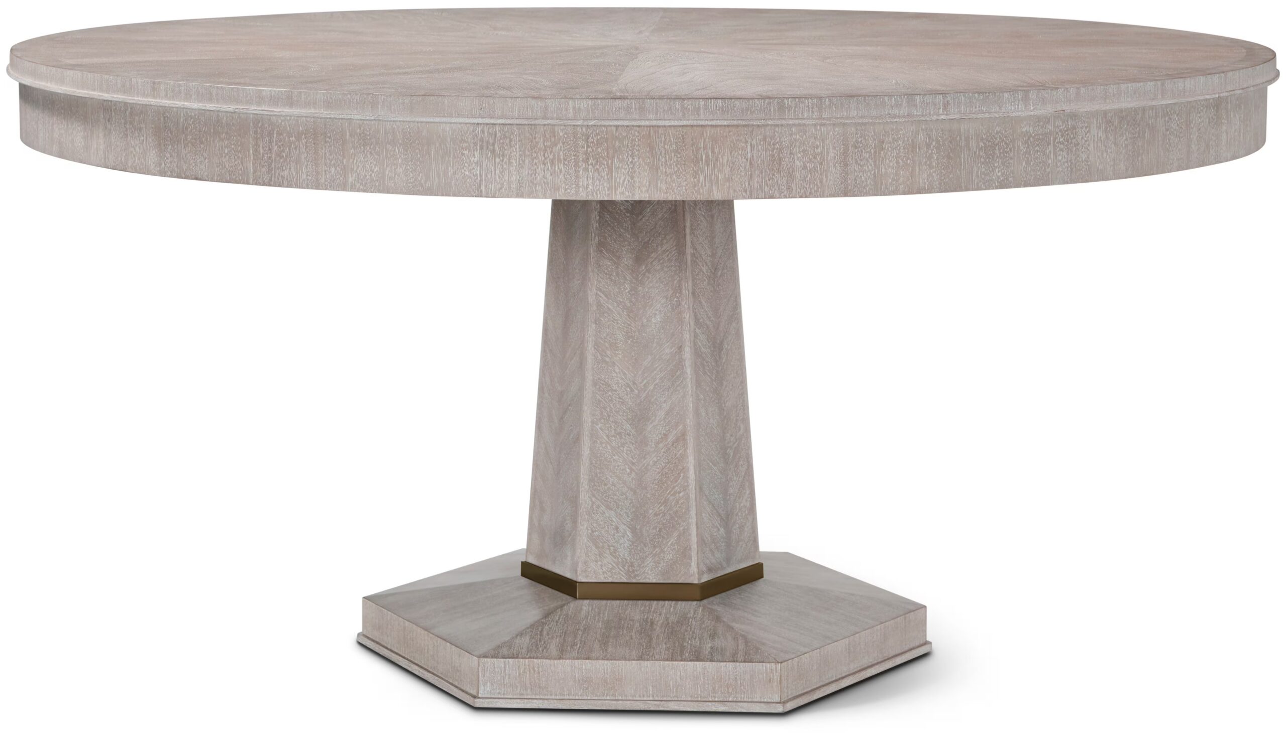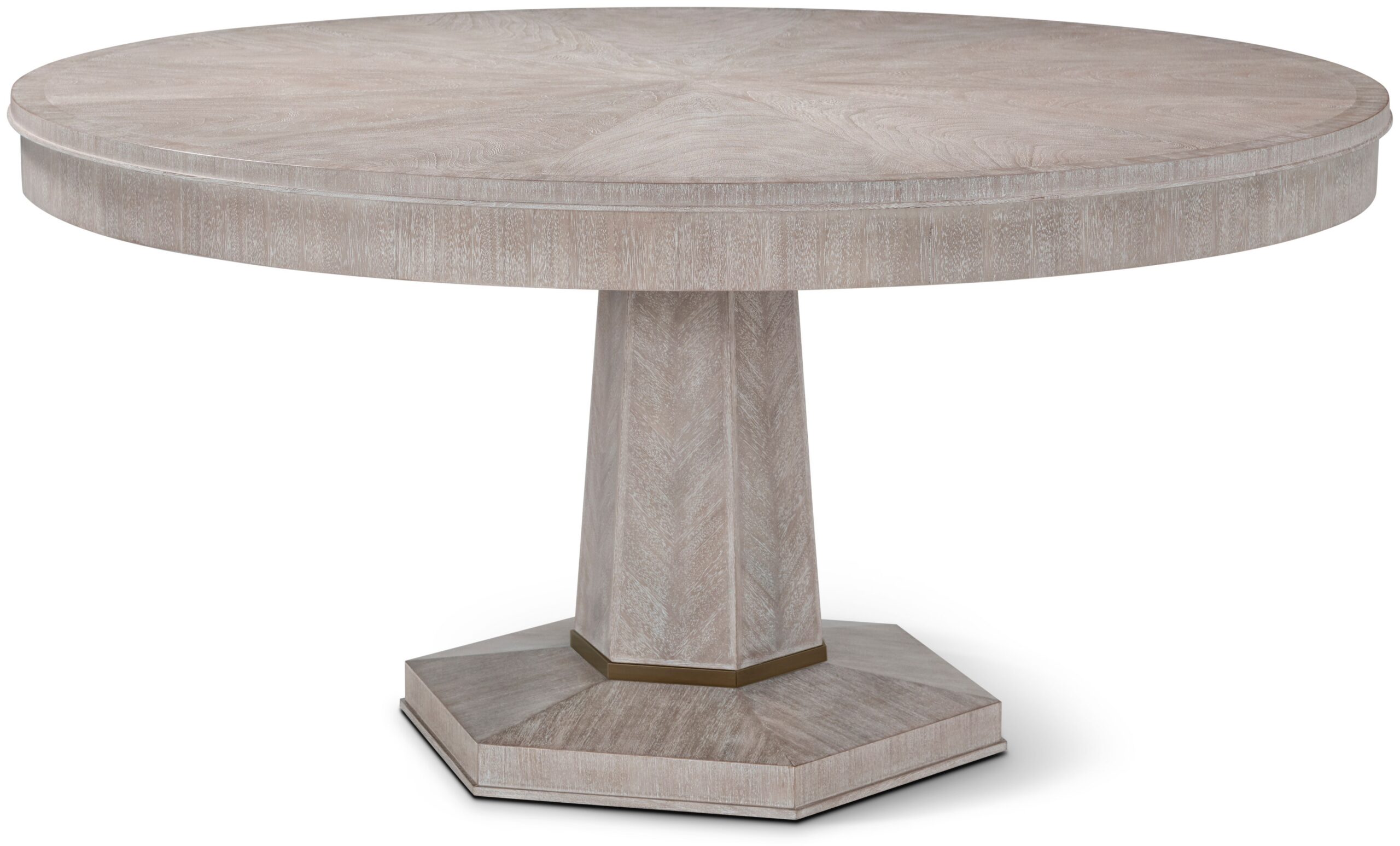 From the Marlborough by Alexa Hampton collection, the Morrison Dining Table features a starburst khaya veneer top on a faceted pedestal base with brass accents. Its round form brings timeless elegance and upscale ambiance to dining spaces.