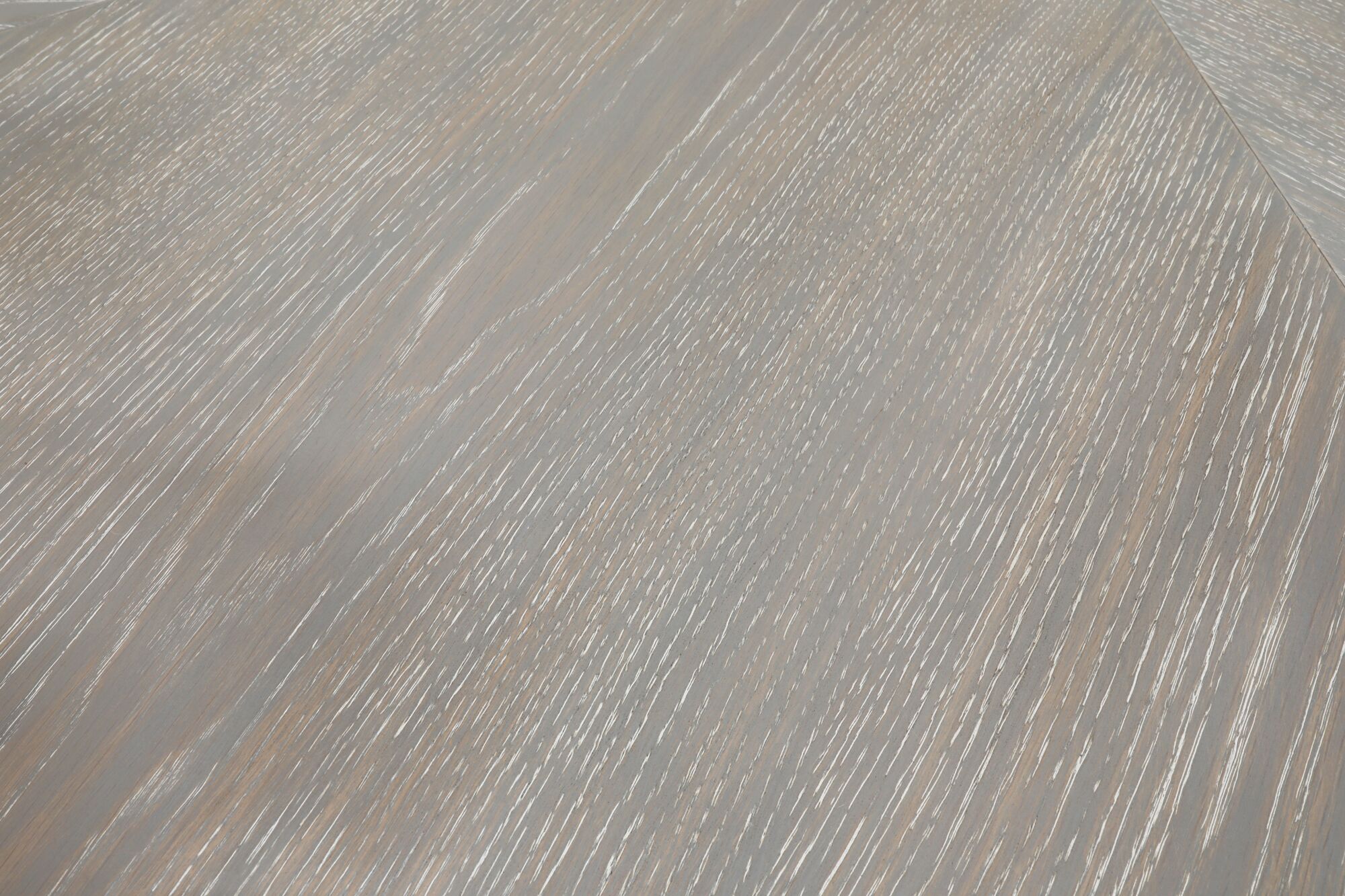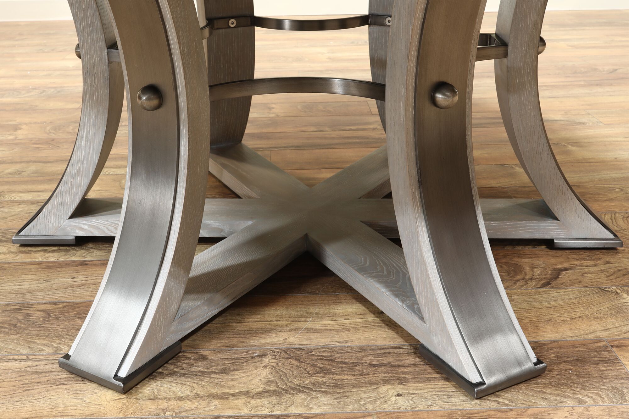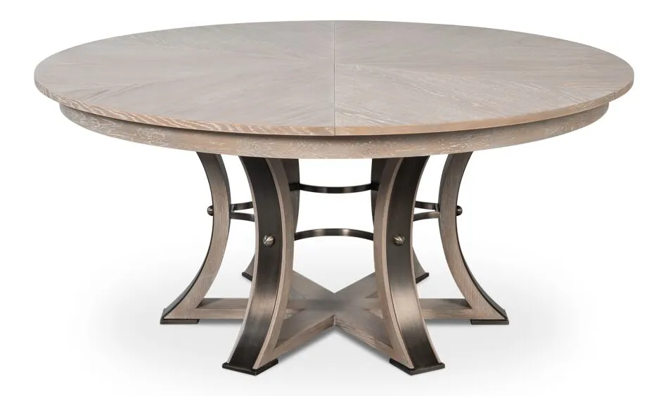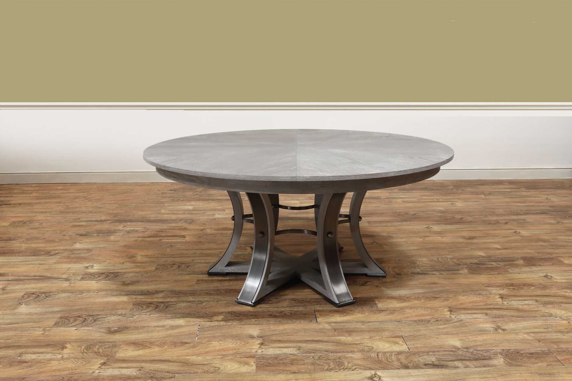 66-86 Inch Round Jupe Table with a bluish gray finish.  This color also has some peach undertones. The pictured wood sample here is true color.  This table has brushed aluminum outswept saber legs. Measurements: 66″ Round to 86″ Round, 30″ High