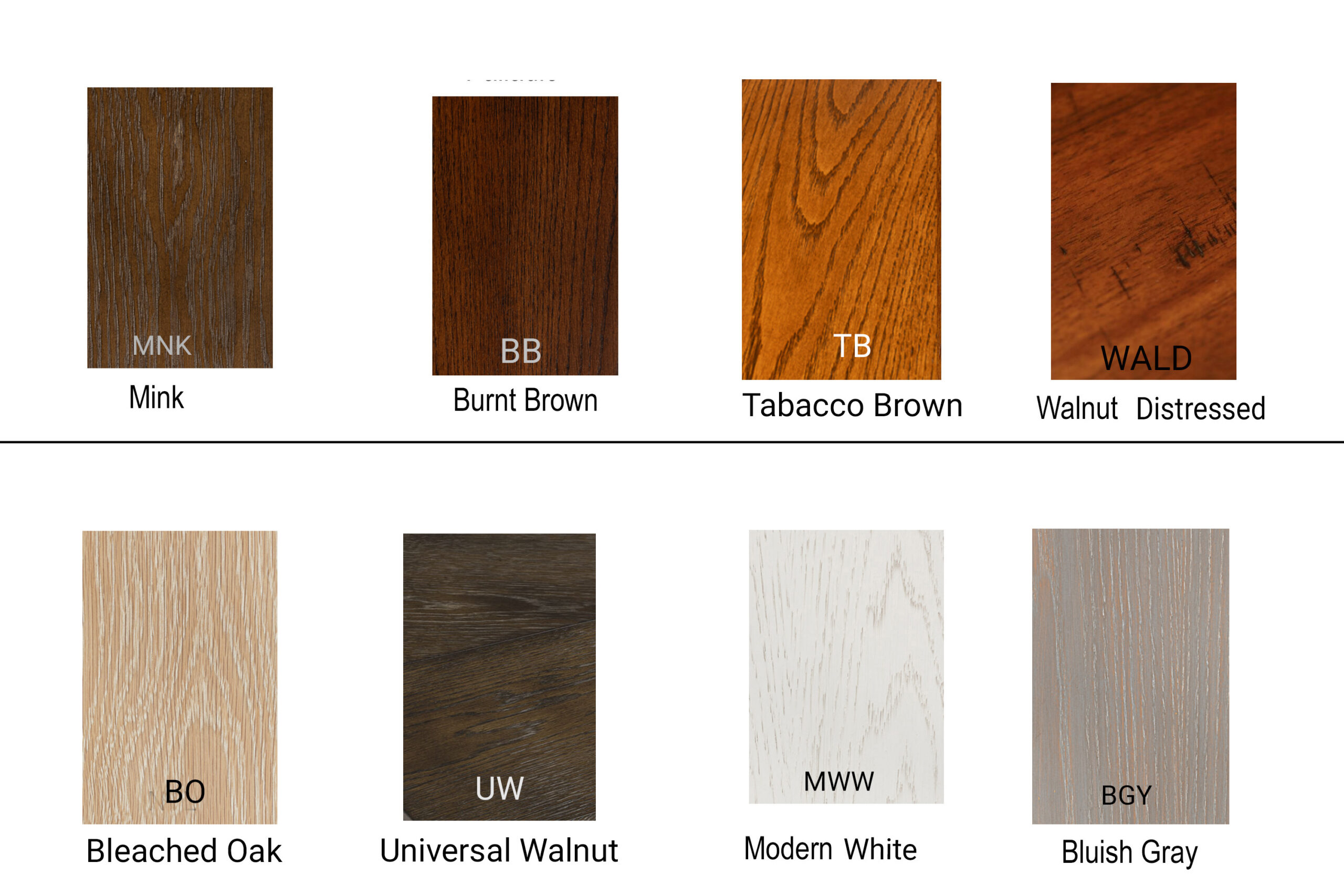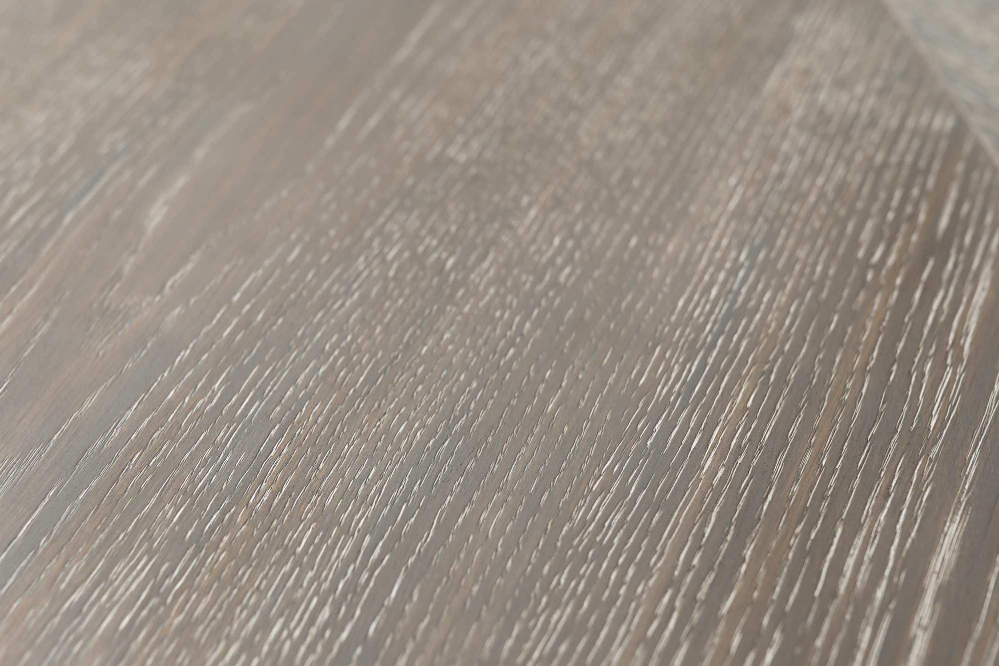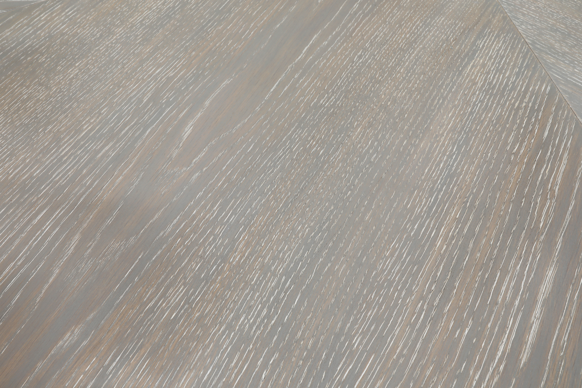 66-86 Inch Round Jupe Table with a bluish gray finish. This color also has some peach undertones. The pictured wood sample here is true color. This table has brushed aluminum outswept saber legs.