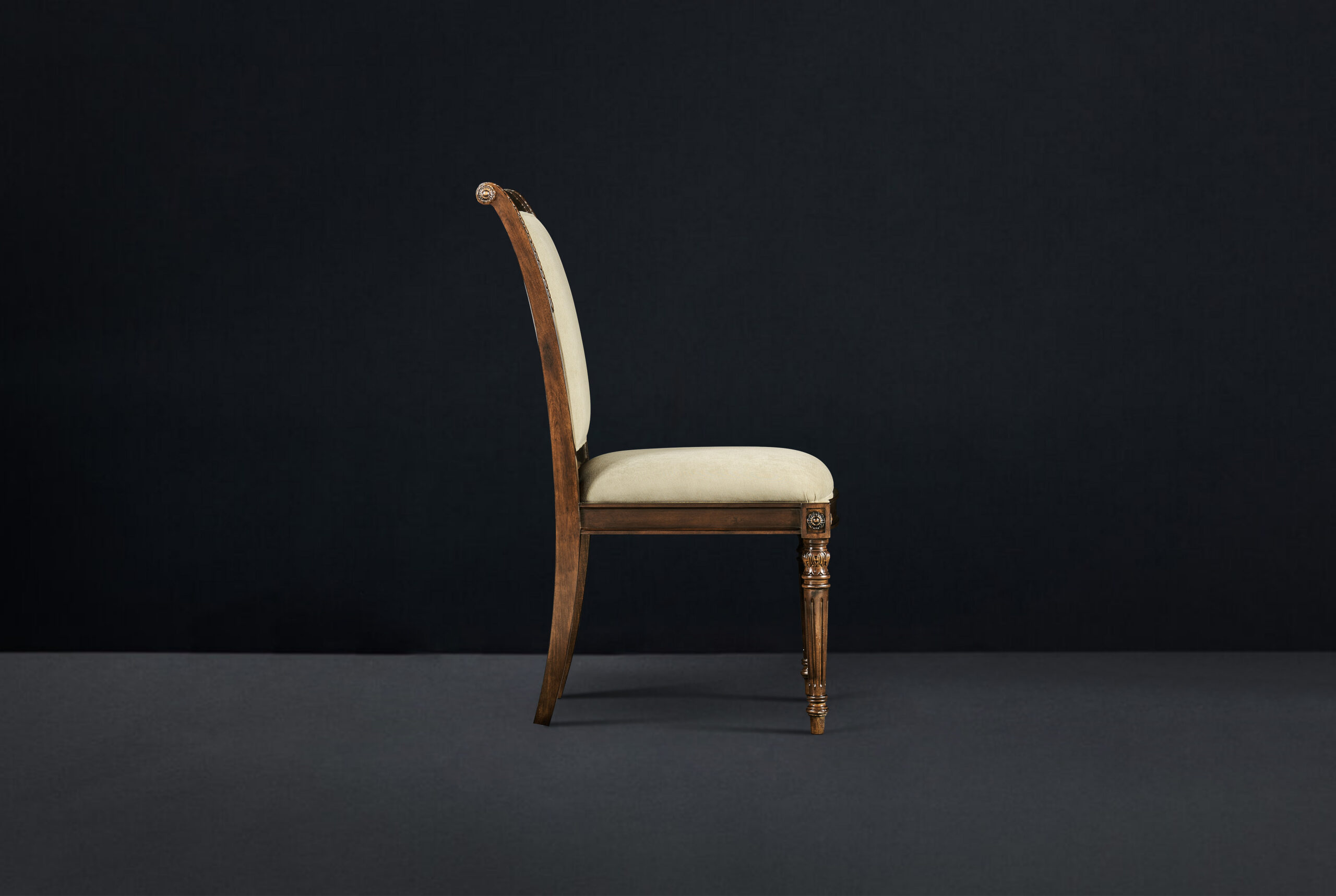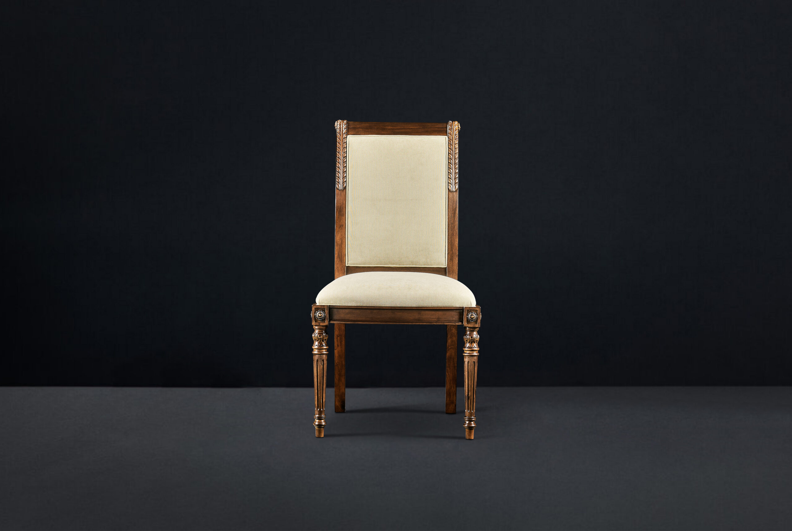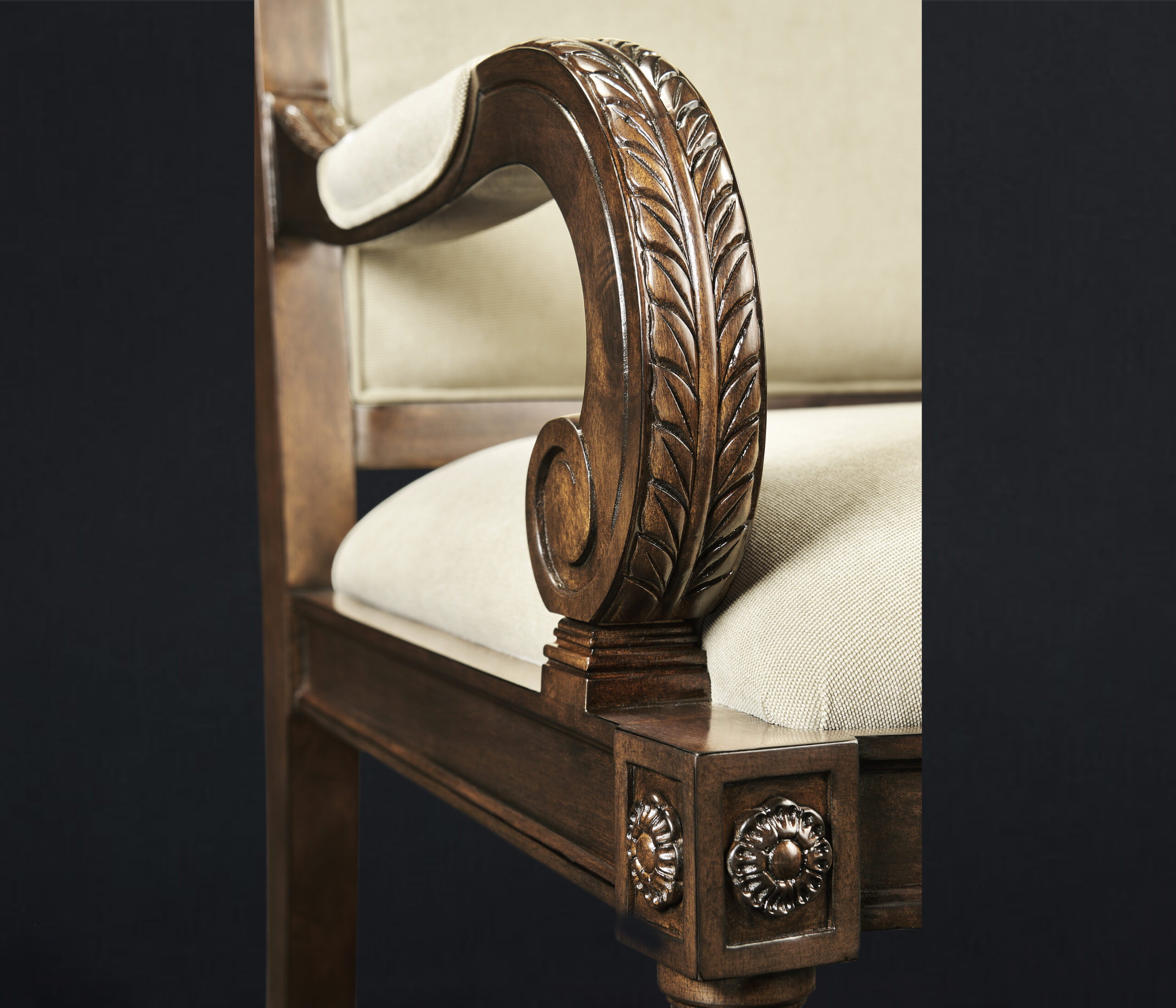 High-end solid mahogany Louis XVI-style dining room chairs, an AP Exclusive by AntiquePurveyor. These chairs feature an acanthus leaf-carved frame, fluted legs, and rosette-carved details on the ears and legs.They are comfortable chairs made from solid mahogany. The seats are spacious, and the seat cushions are generous and thick. These are designer-grade dining chairs of great quality. The chairs have a straw color fabric. Crypton fabrics are stain-resistant and their protective qualities will last indefinitely.