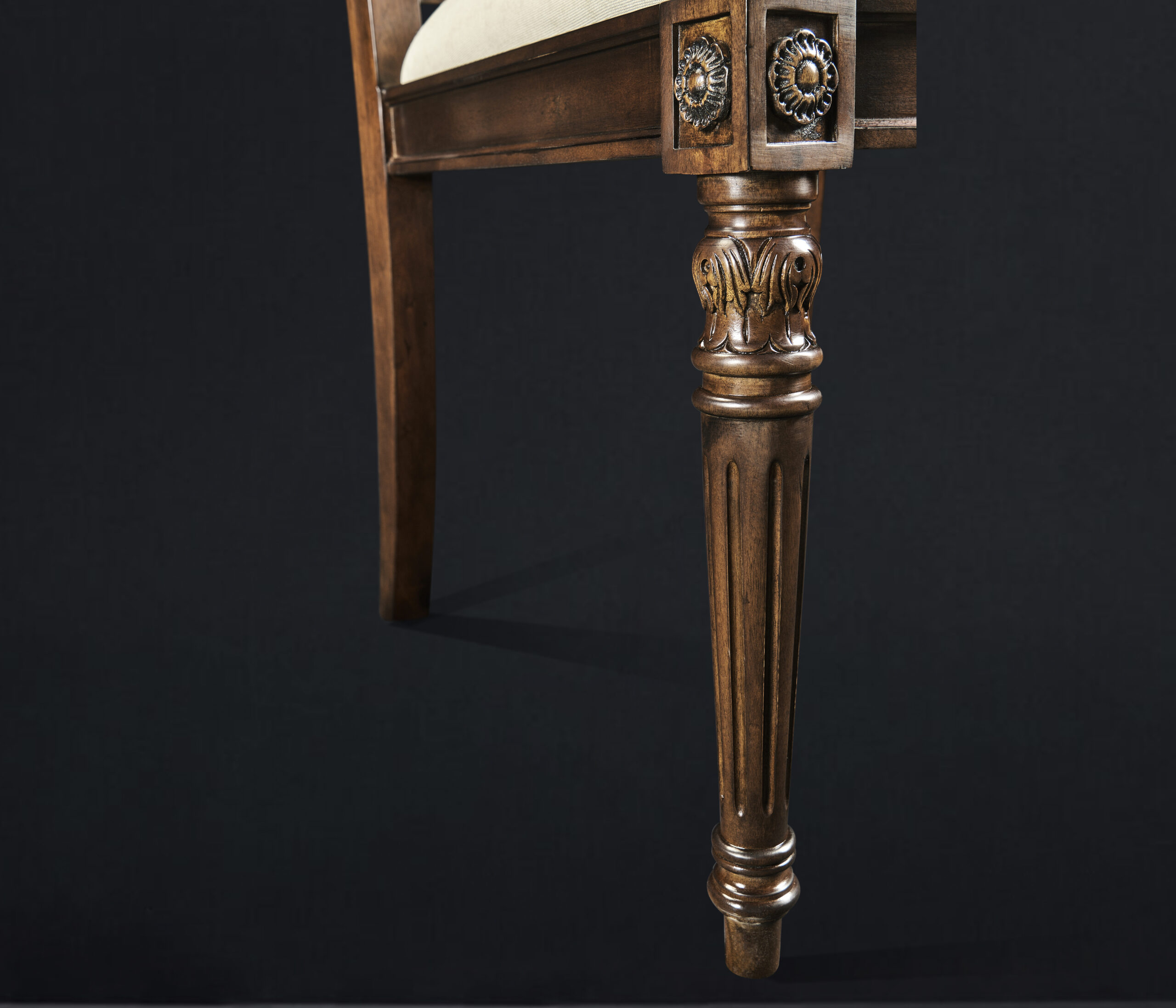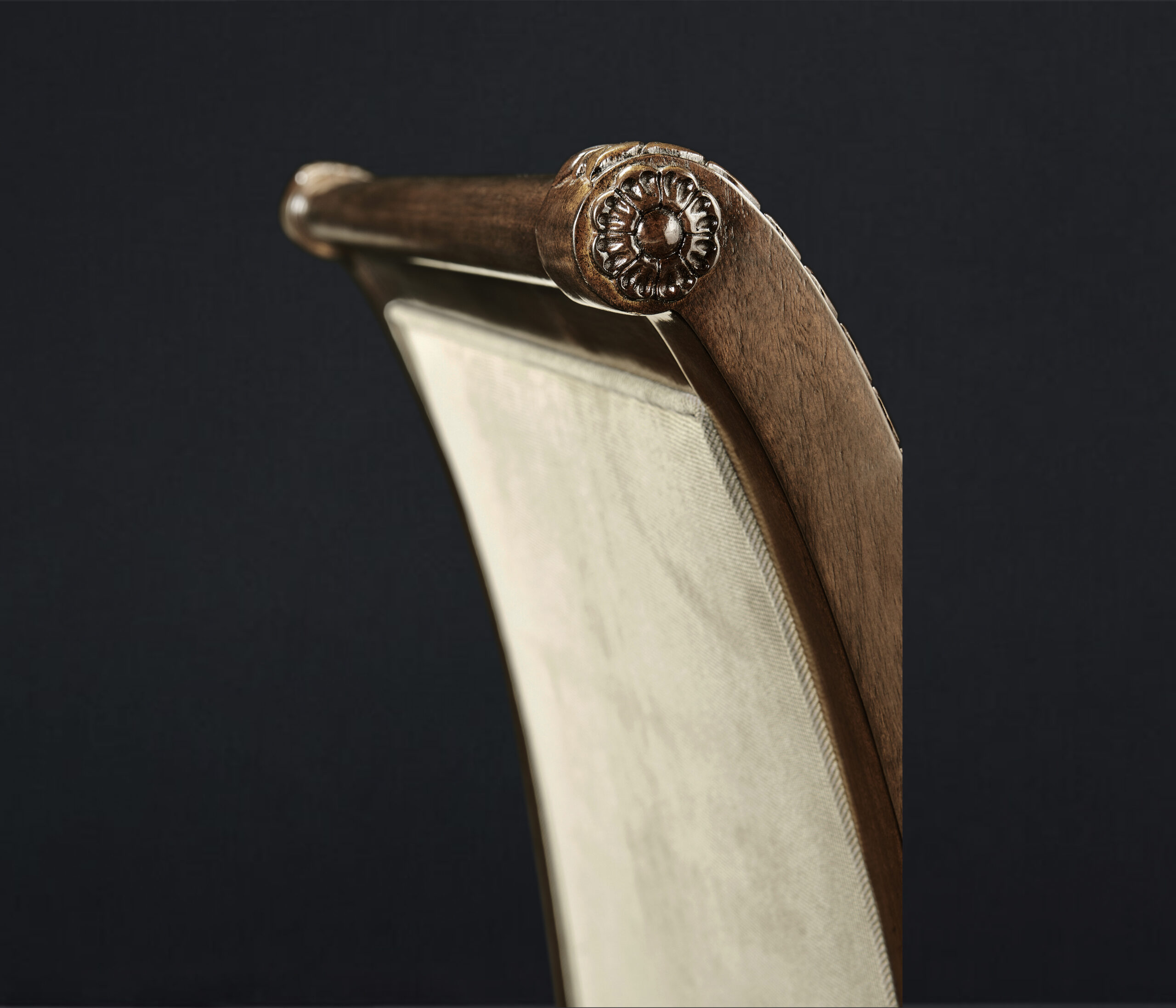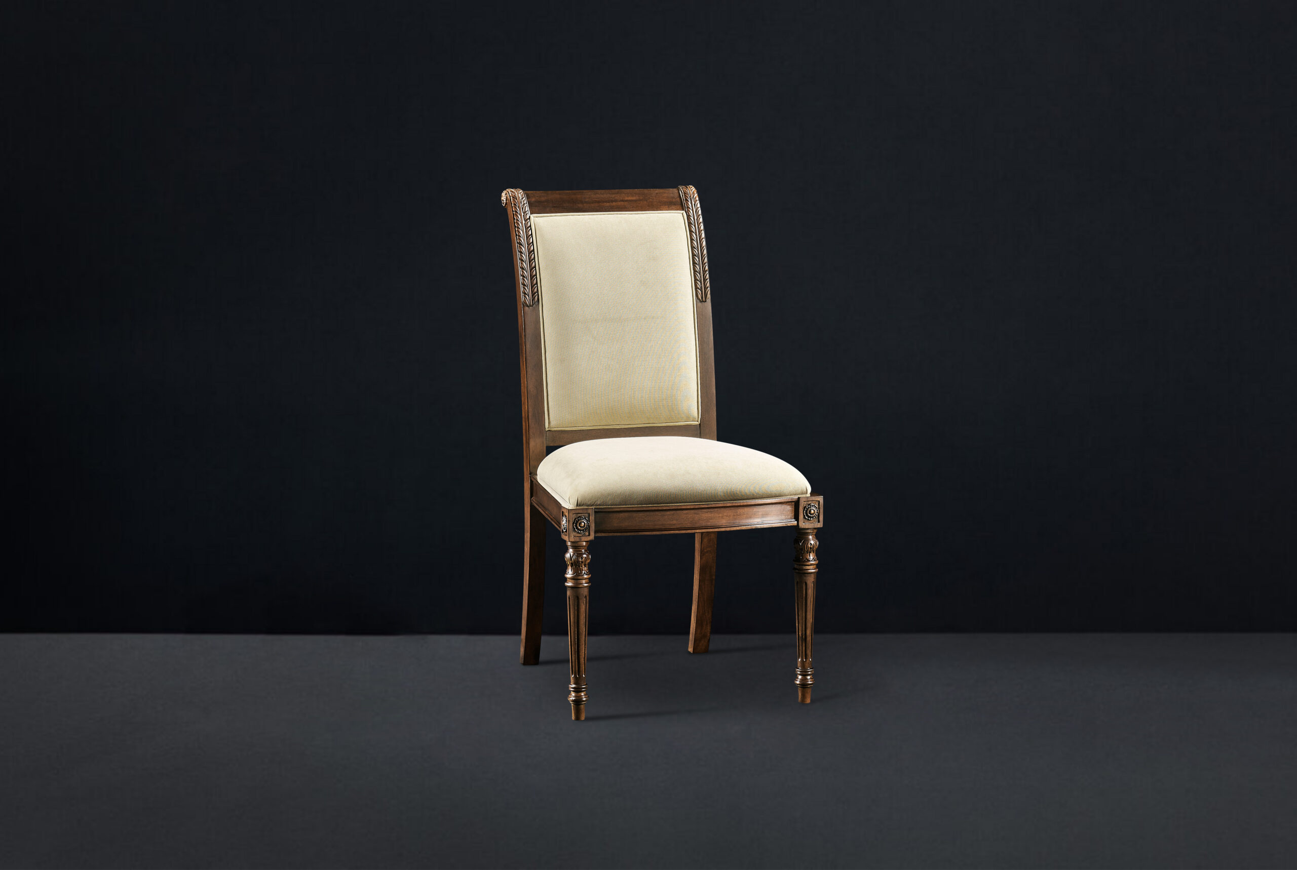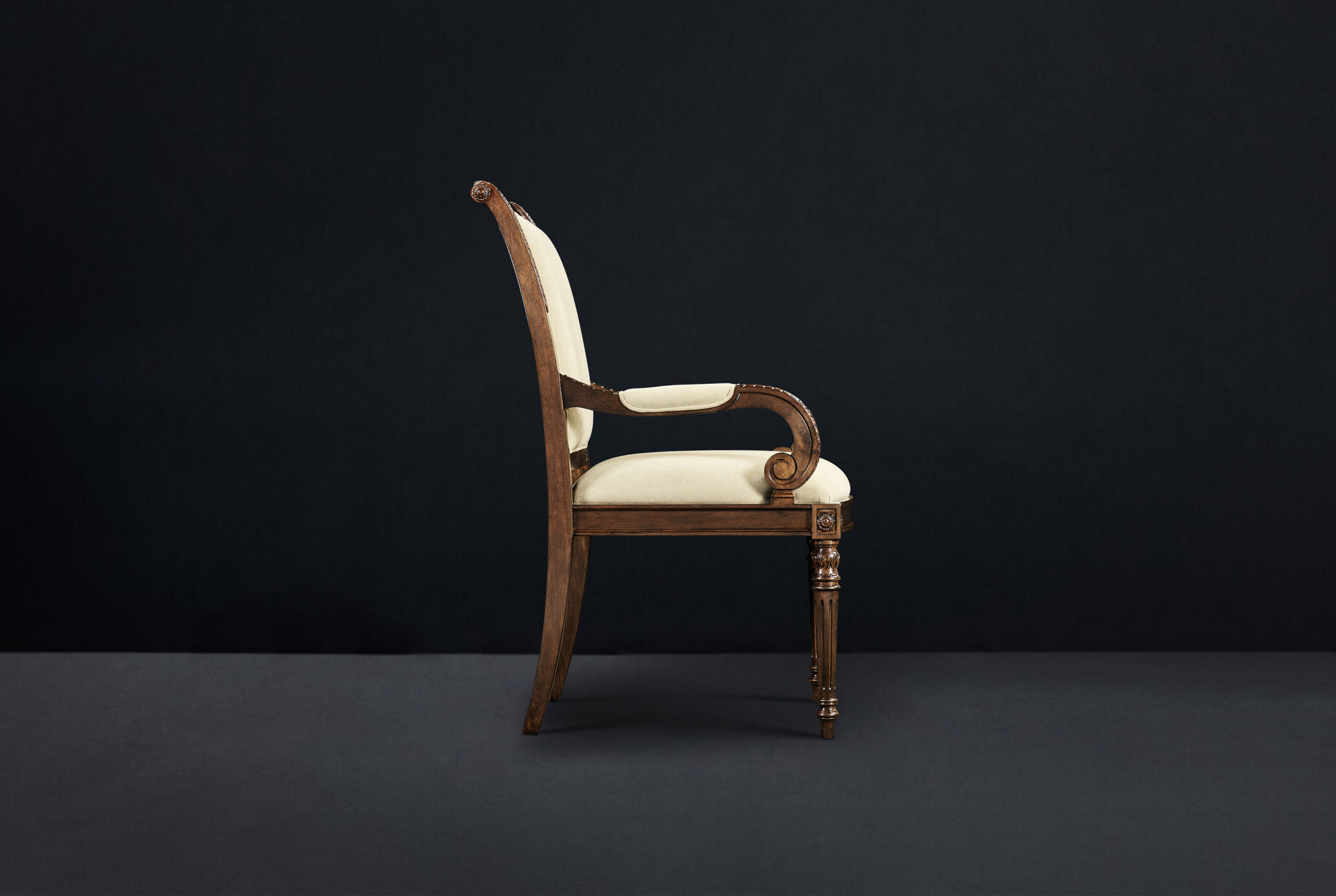 High-end solid mahogany Louis XVI-style dining room chairs, an AP Exclusive by AntiquePurveyor. These chairs feature an acanthus leaf-carved frame, fluted legs, and rosette-carved details on the ears and legs.They are comfortable chairs made from solid mahogany. The seats are spacious, and the seat cushions are generous and thick. These are designer-grade dining chairs of great quality. The chairs have a straw color fabric. Crypton fabrics are stain-resistant and their protective qualities will last indefinitely.