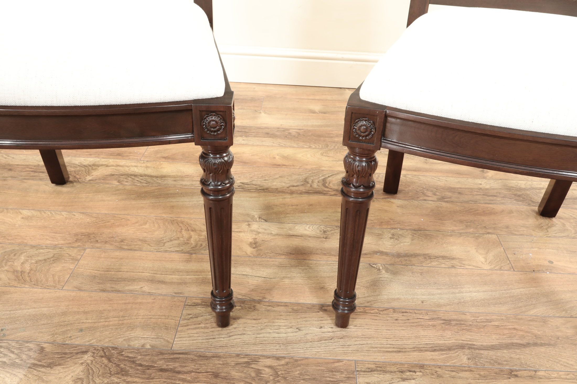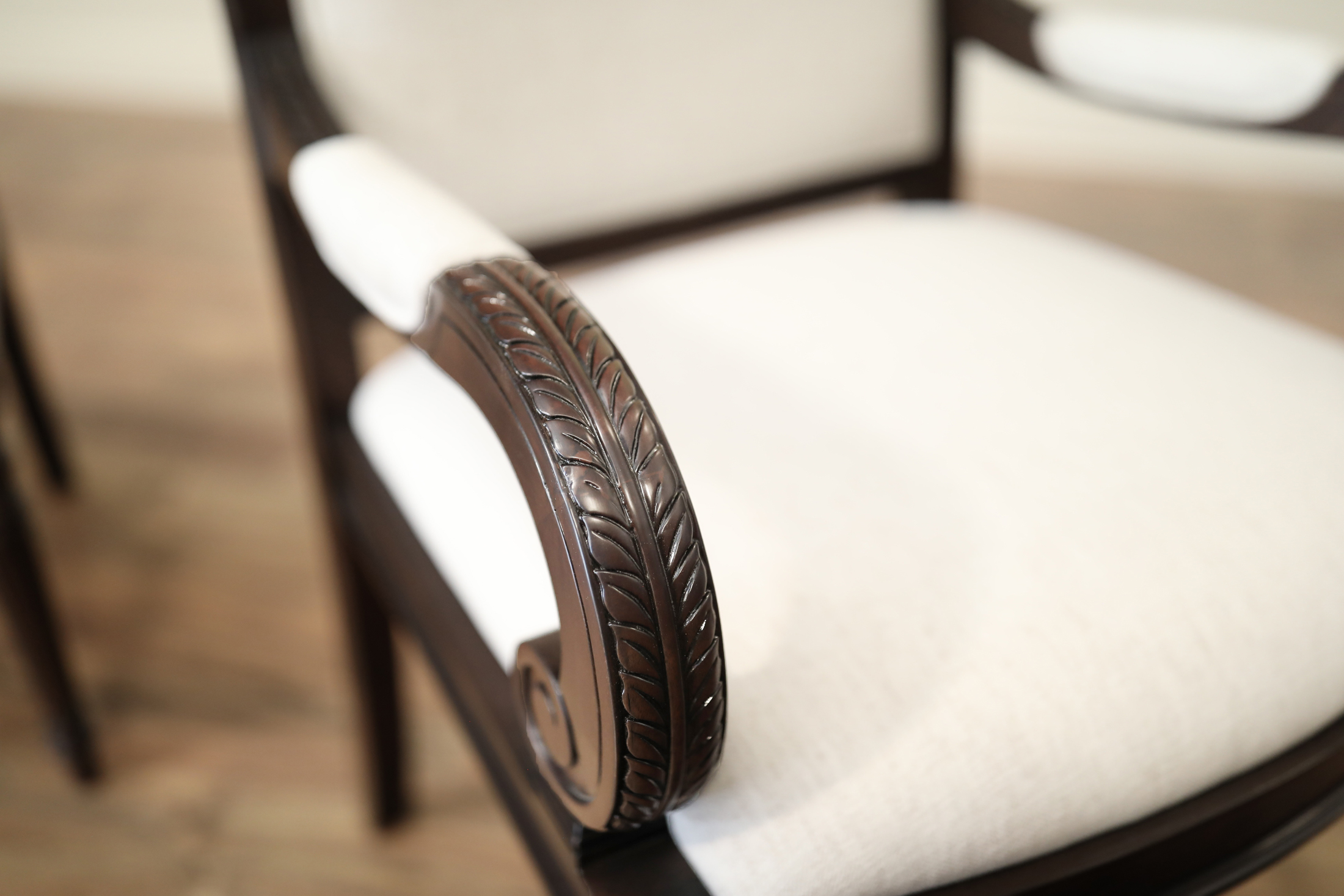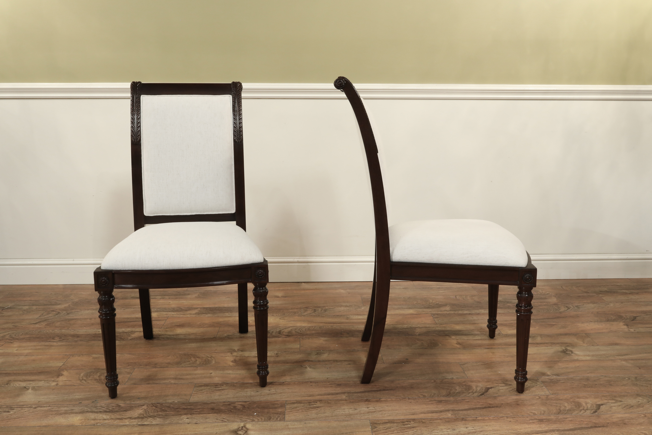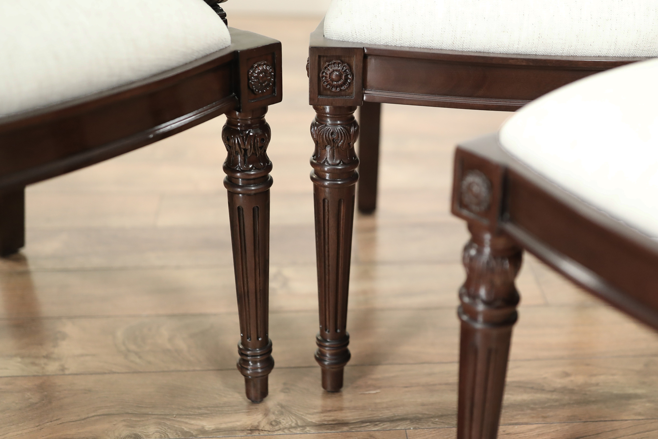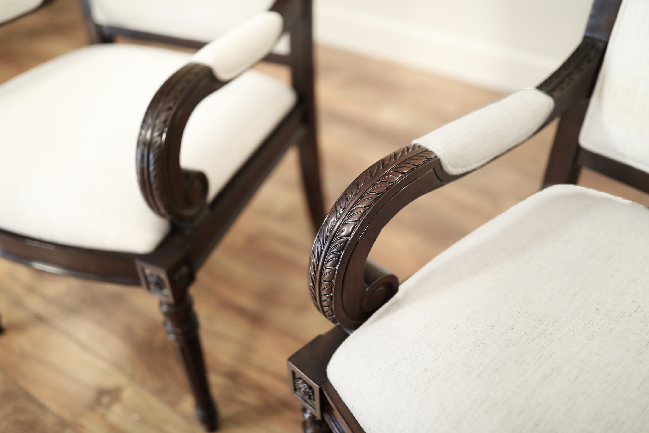 Set of 10 high-end solid mahogany Louis XVI-style dining room chairs, an AP Exclusive by AntiquePurveyor. These chairs feature an acanthus leaf-carved frame, fluted legs, and rosette-carved details on the ears and legs. They are comfortable chairs made from solid mahogany. The seats are spacious, and the seat cushions are generous and thick. These are designer-grade dining chairs of great quality. The chairs have original grayish-white fabric with a walnut-colored thread. Crypton fabrics are stain-resistant; however, unlike traditional fabric treatments, this system is heat-treated, and therefore, its protective qualities will last indefinitely.