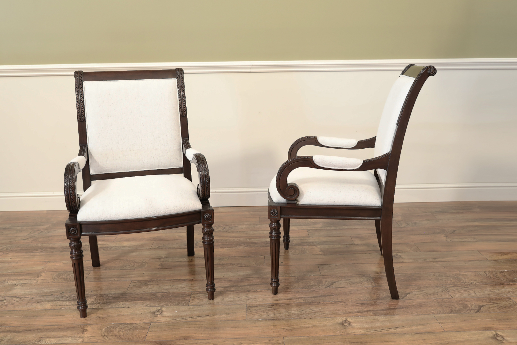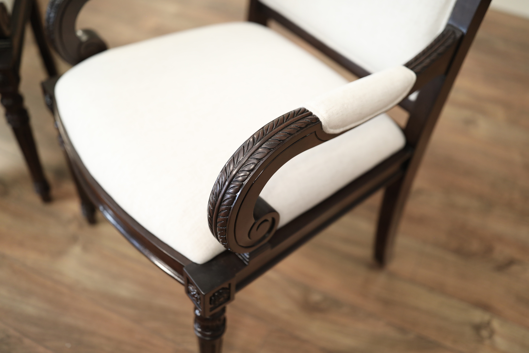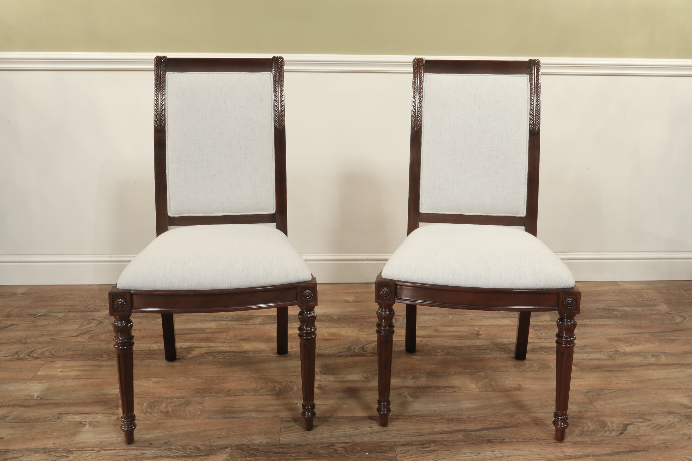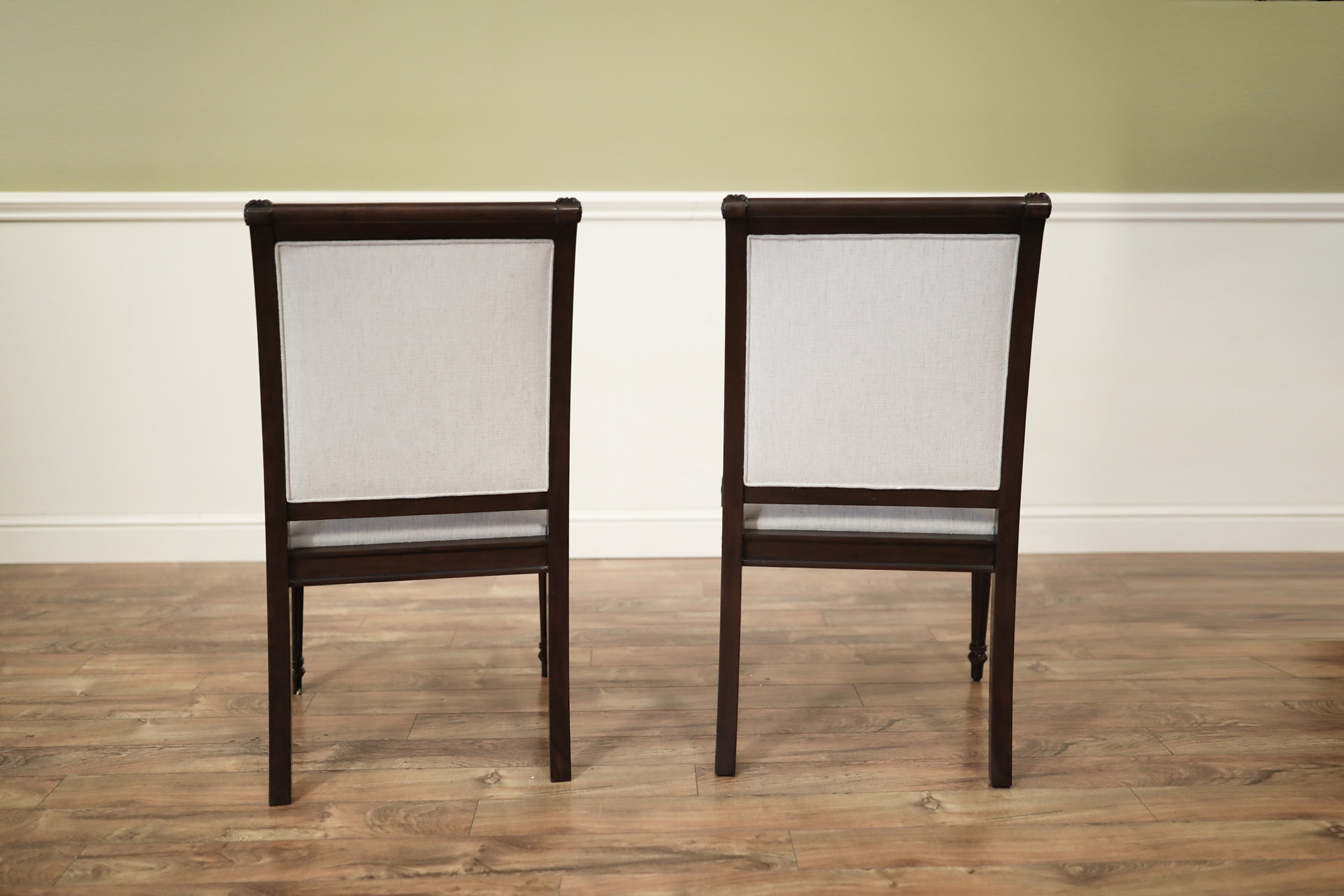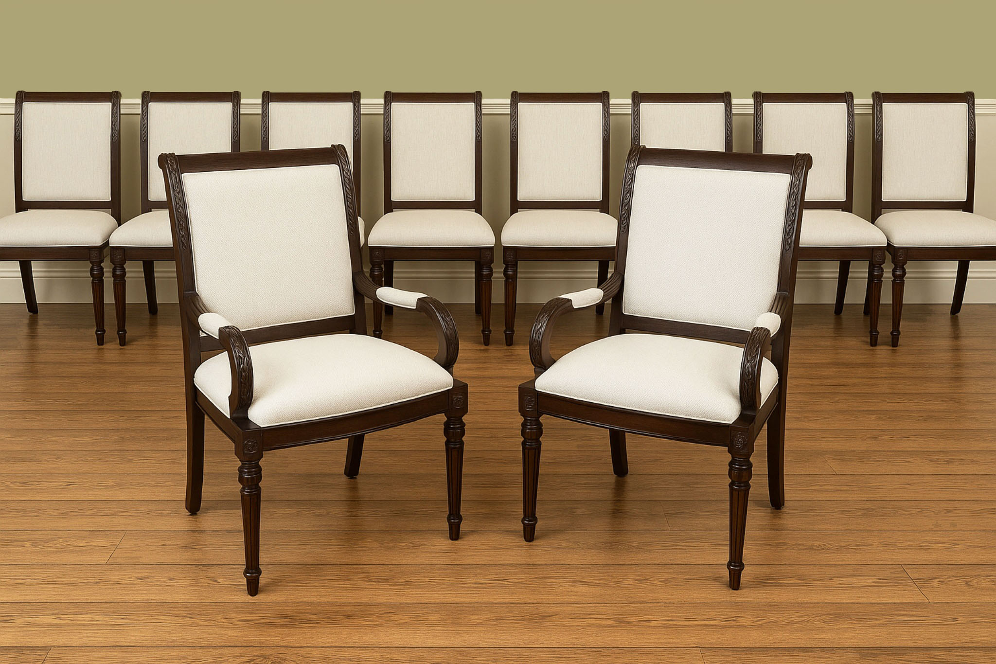 Set of 10 high-end solid mahogany Louis XVI-style dining room chairs, an AP Exclusive by AntiquePurveyor. These chairs feature an acanthus leaf-carved frame, fluted legs, and rosette-carved details on the ears and legs. They are comfortable chairs made from solid mahogany. The seats are spacious, and the seat cushions are generous and thick. These are designer-grade dining chairs of great quality. The chairs have original grayish-white fabric with a walnut-colored thread. Crypton fabrics are stain-resistant; however, unlike traditional fabric treatments, this system is heat-treated, and therefore, its protective qualities will last indefinitely.