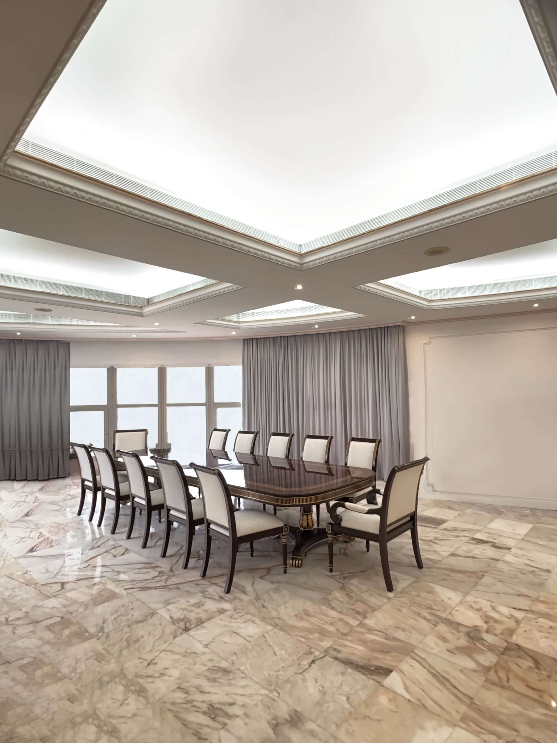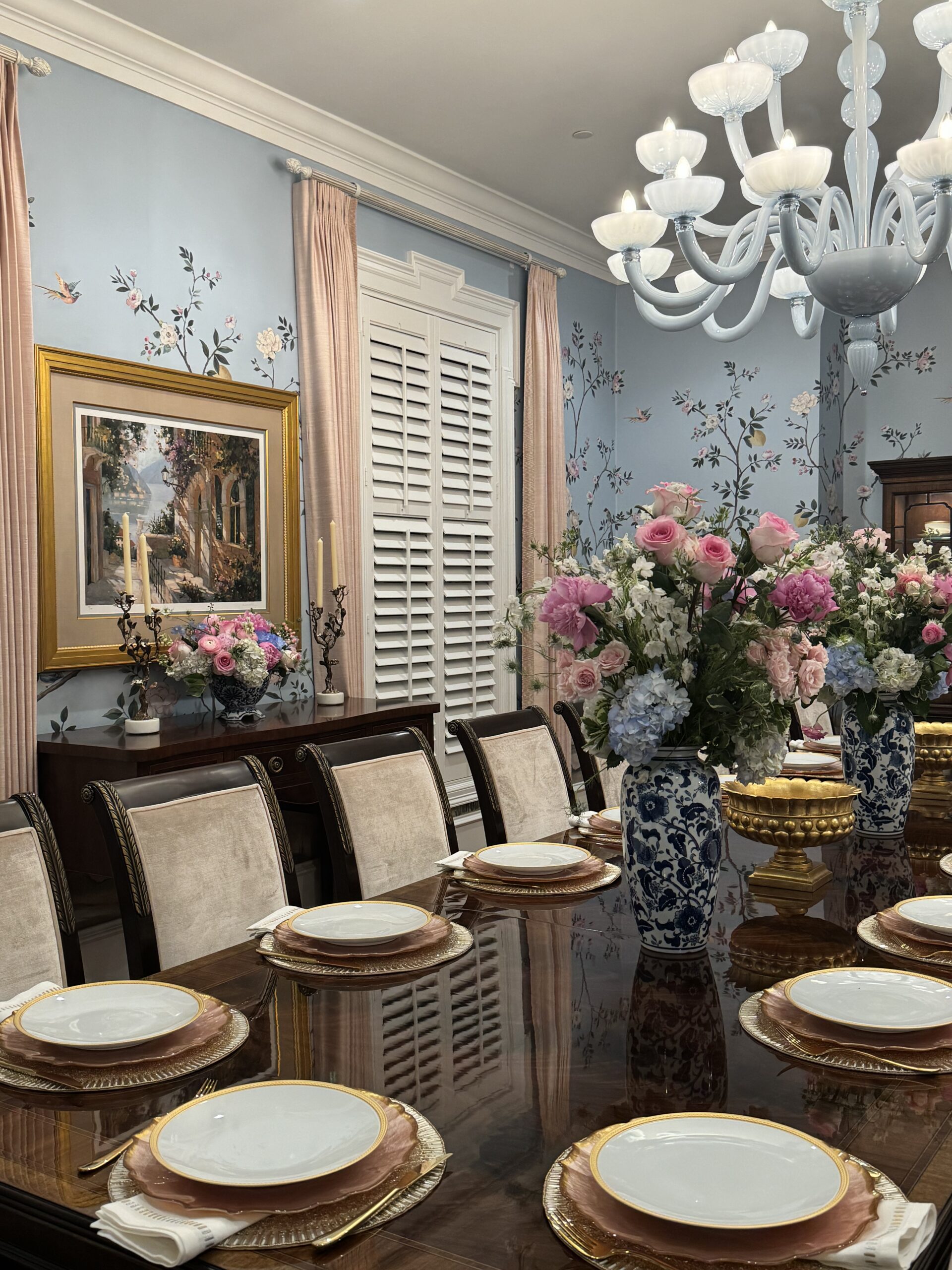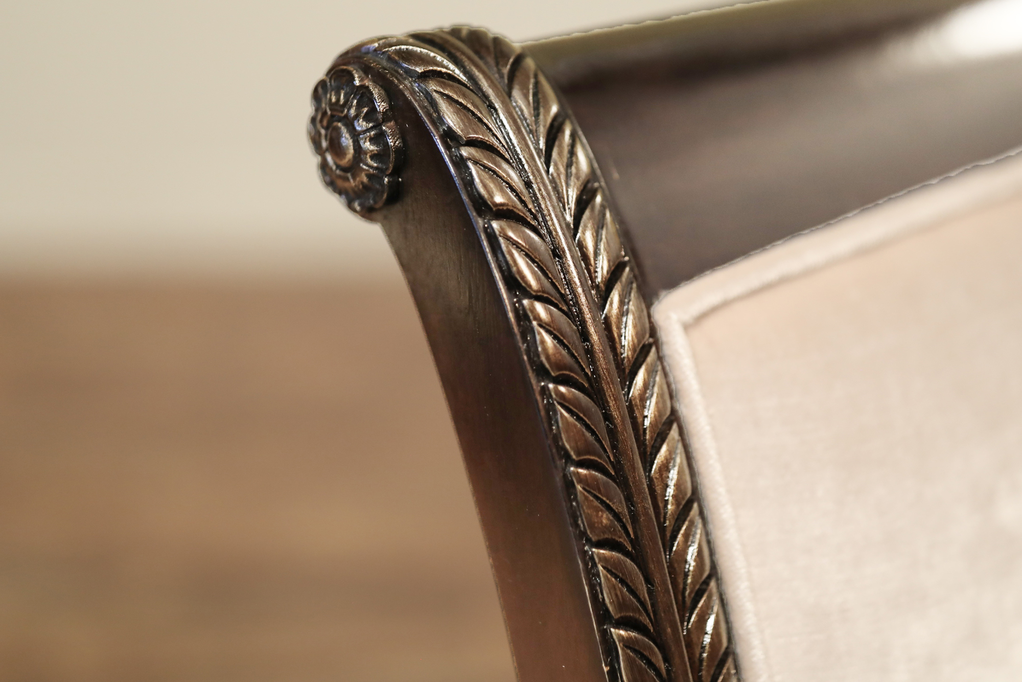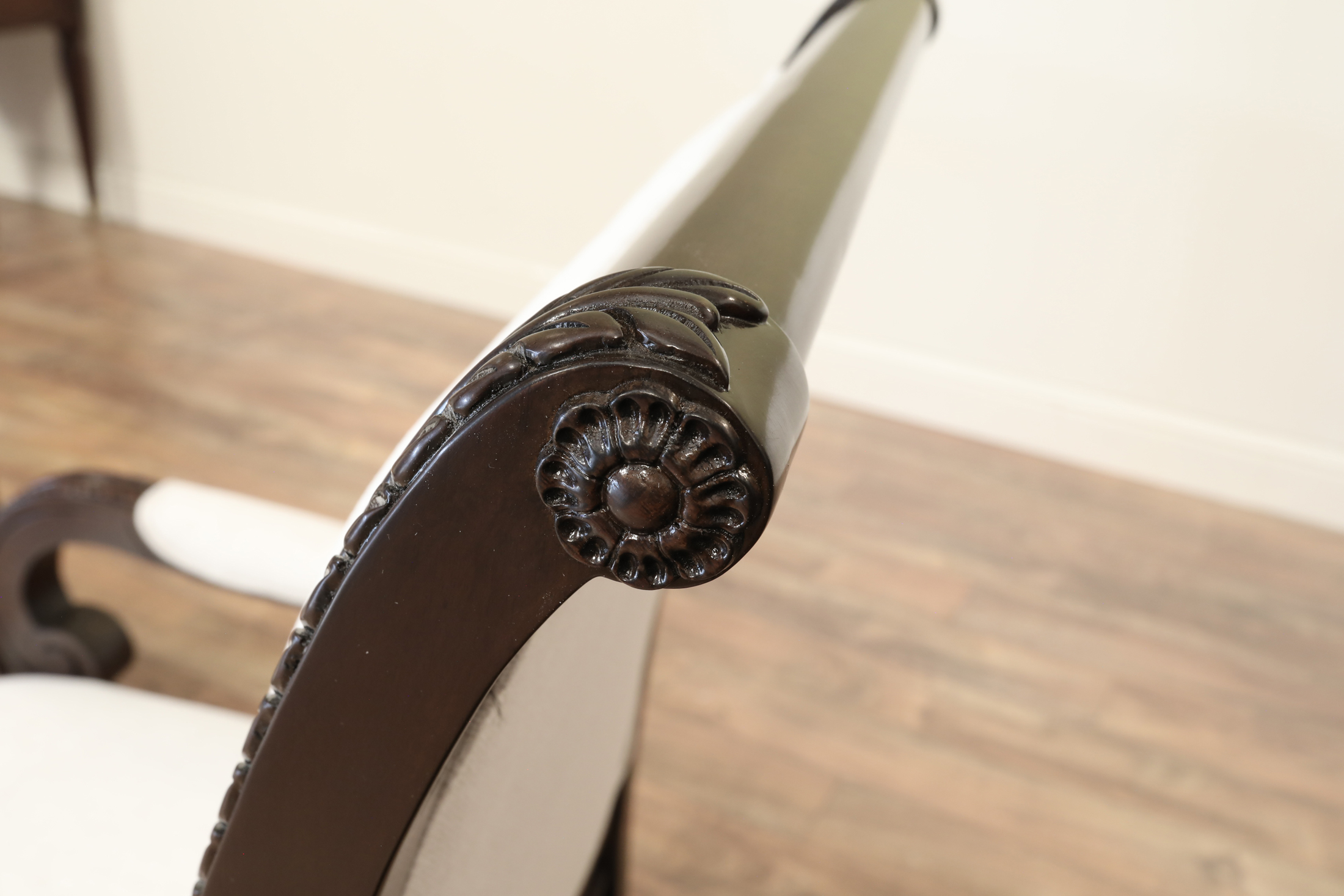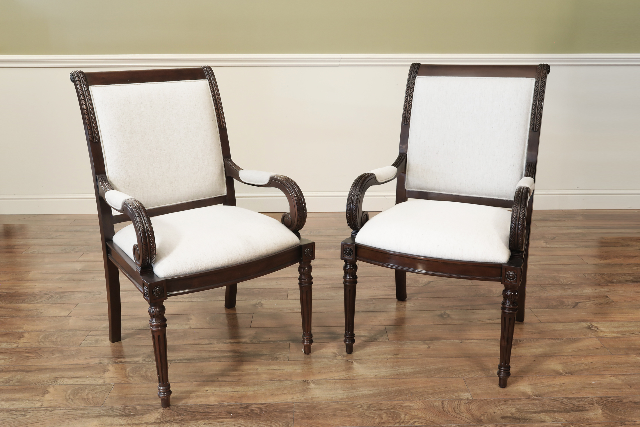 Set of 10 high-end solid mahogany Louis XVI-style dining room chairs, an AP Exclusive by AntiquePurveyor. These chairs feature an acanthus leaf-carved frame, fluted legs, and rosette-carved details on the ears and legs. They are comfortable chairs made from solid mahogany. The seats are spacious, and the seat cushions are generous and thick. These are designer-grade dining chairs of great quality. The chairs have original grayish-white fabric with a walnut-colored thread. Crypton fabrics are stain-resistant; however, unlike traditional fabric treatments, this system is heat-treated, and therefore, its protective qualities will last indefinitely.