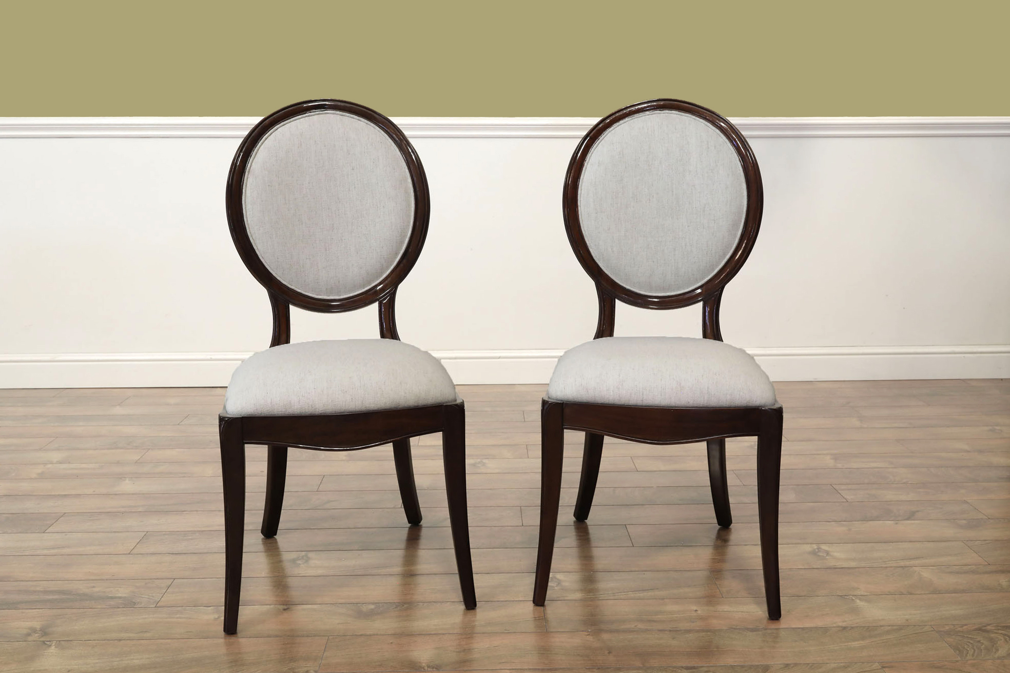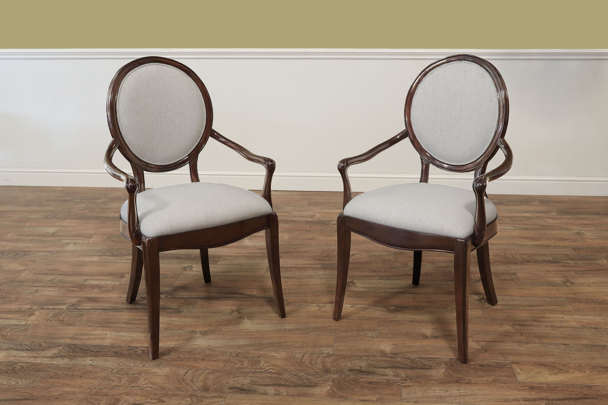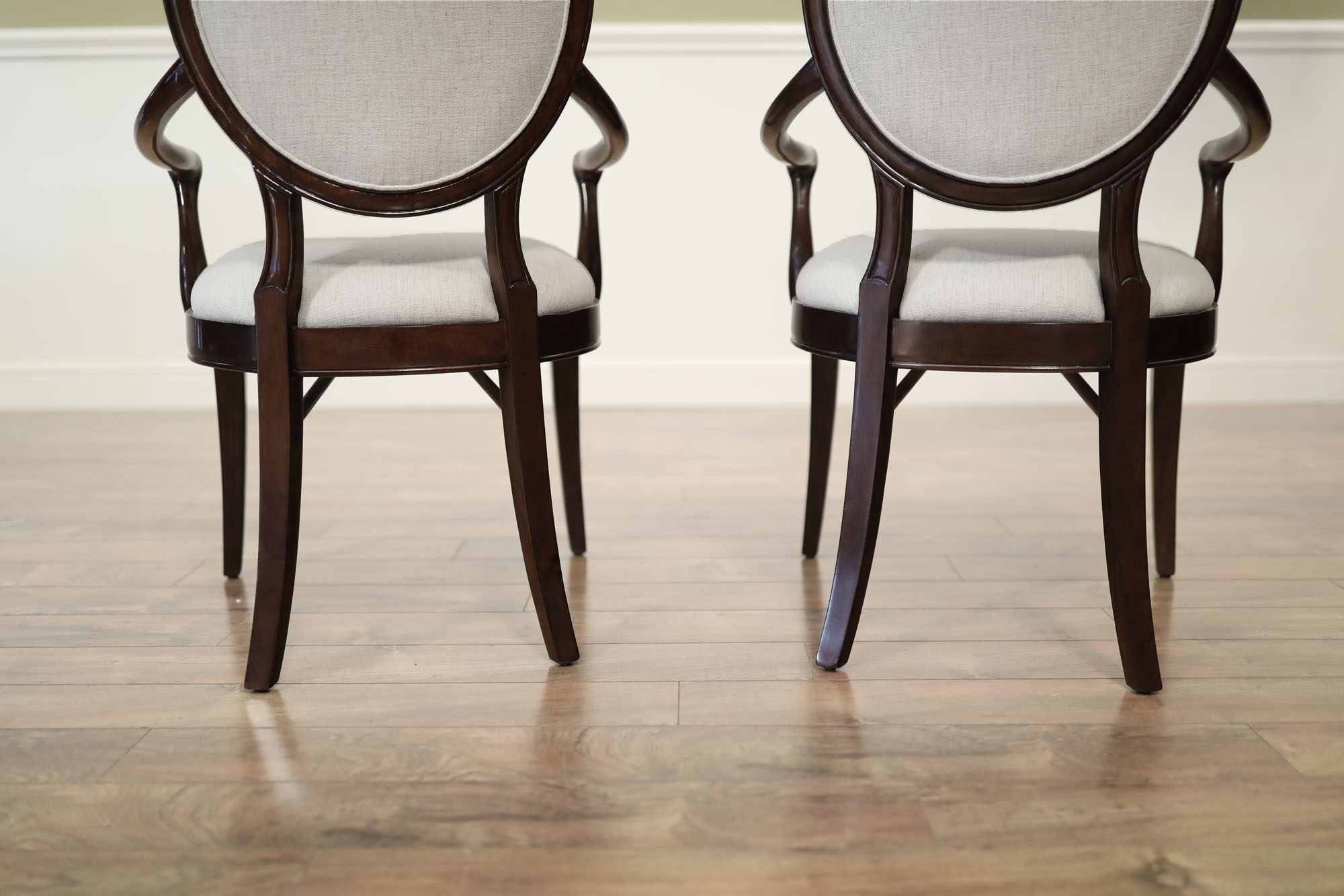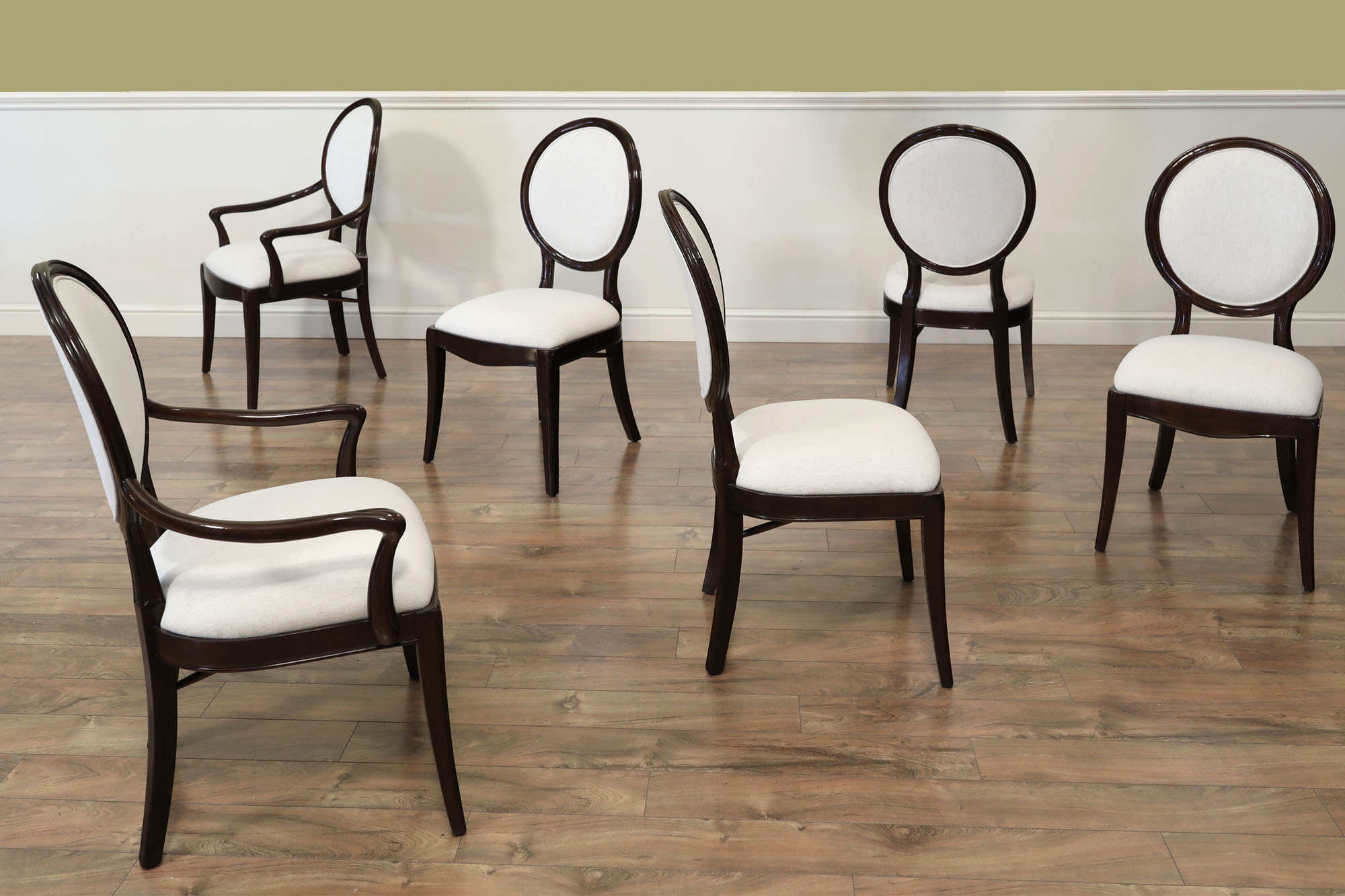 Set of 10 Solid mahogany round-back dining room chairs with engineered Crypton NOMAD SNOW performance fabric, an AP Exclusive by AntiquePurveyor. An updated traditional spoon-back chair with saber legs, minimalistic stretchers, and a dark brown finish. These chairs were designed with a narrow frame, which helps maximize the number of place settings around a dining table. They are only 20.5 inches wide (the Armchair is 25 inches wide), whereas a typical dining chair is about 22 inches wide. A gently sculpted back and generous seat pile make this a very comfortable chair. The neutral, greyish-white fabric is accented with a darker brown thread, and the fabric complements the dark walnut frames. These chairs will coordinate nicely with transitional dining spaces, especially when paired with today’s more modern color schemes. These are designer-grade dining chairs of great quality.