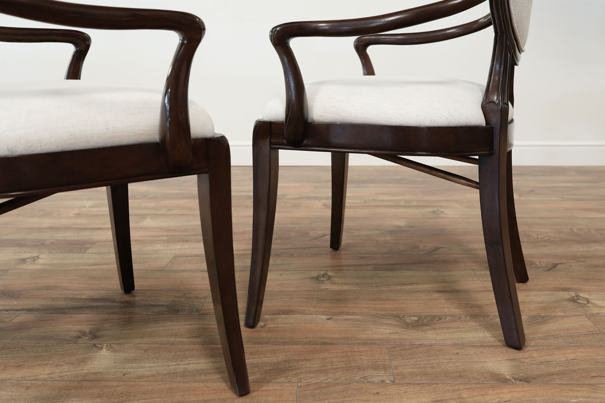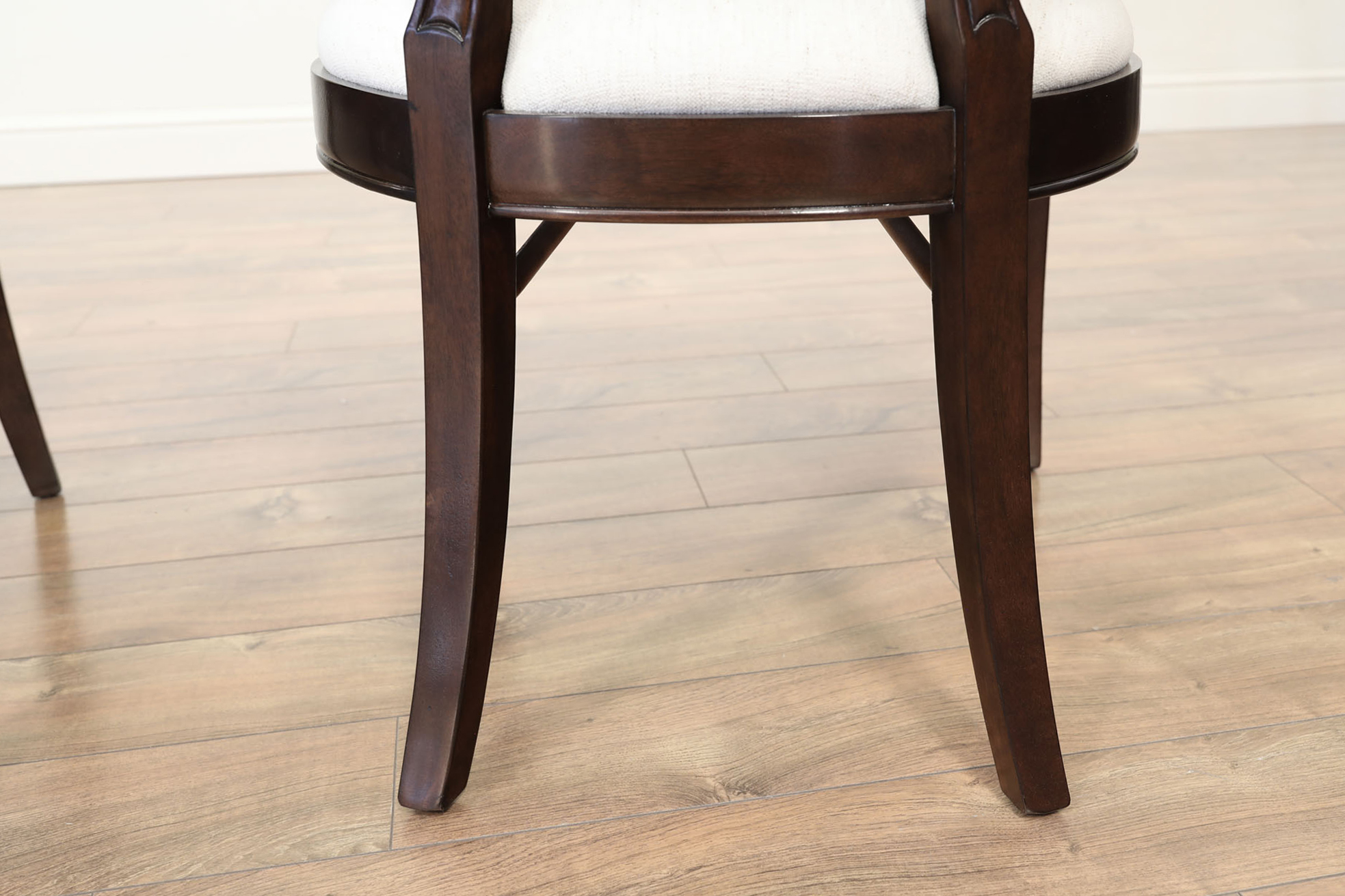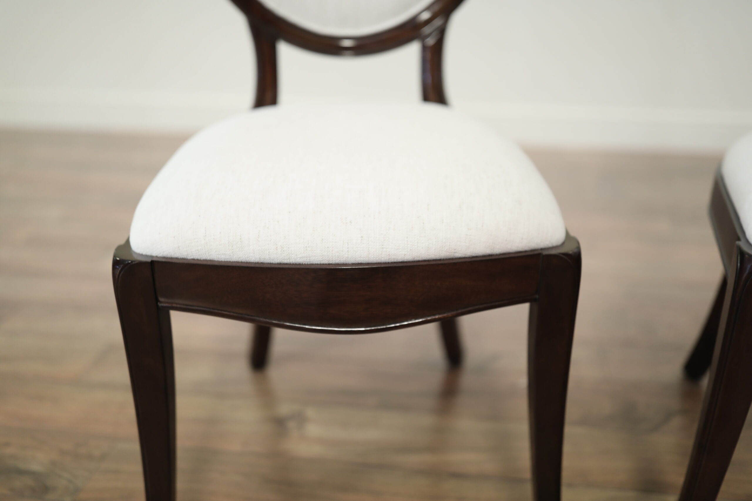 Set of 10 Solid mahogany round-back dining room chairs with engineered Crypton NOMAD SNOW performance fabric, an AP Exclusive by AntiquePurveyor. An updated traditional spoon-back chair with saber legs, minimalistic stretchers, and a dark brown finish. These chairs were designed with a narrow frame, which helps maximize the number of place settings around a dining table. They are only 20.5 inches wide (the Armchair is 25 inches wide), whereas a typical dining chair is about 22 inches wide. A gently sculpted back and generous seat pile make this a very comfortable chair. The neutral, greyish-white fabric is accented with a darker brown thread, and the fabric complements the dark walnut frames. These chairs will coordinate nicely with transitional dining spaces, especially when paired with today’s more modern color schemes. These are designer-grade dining chairs of great quality.