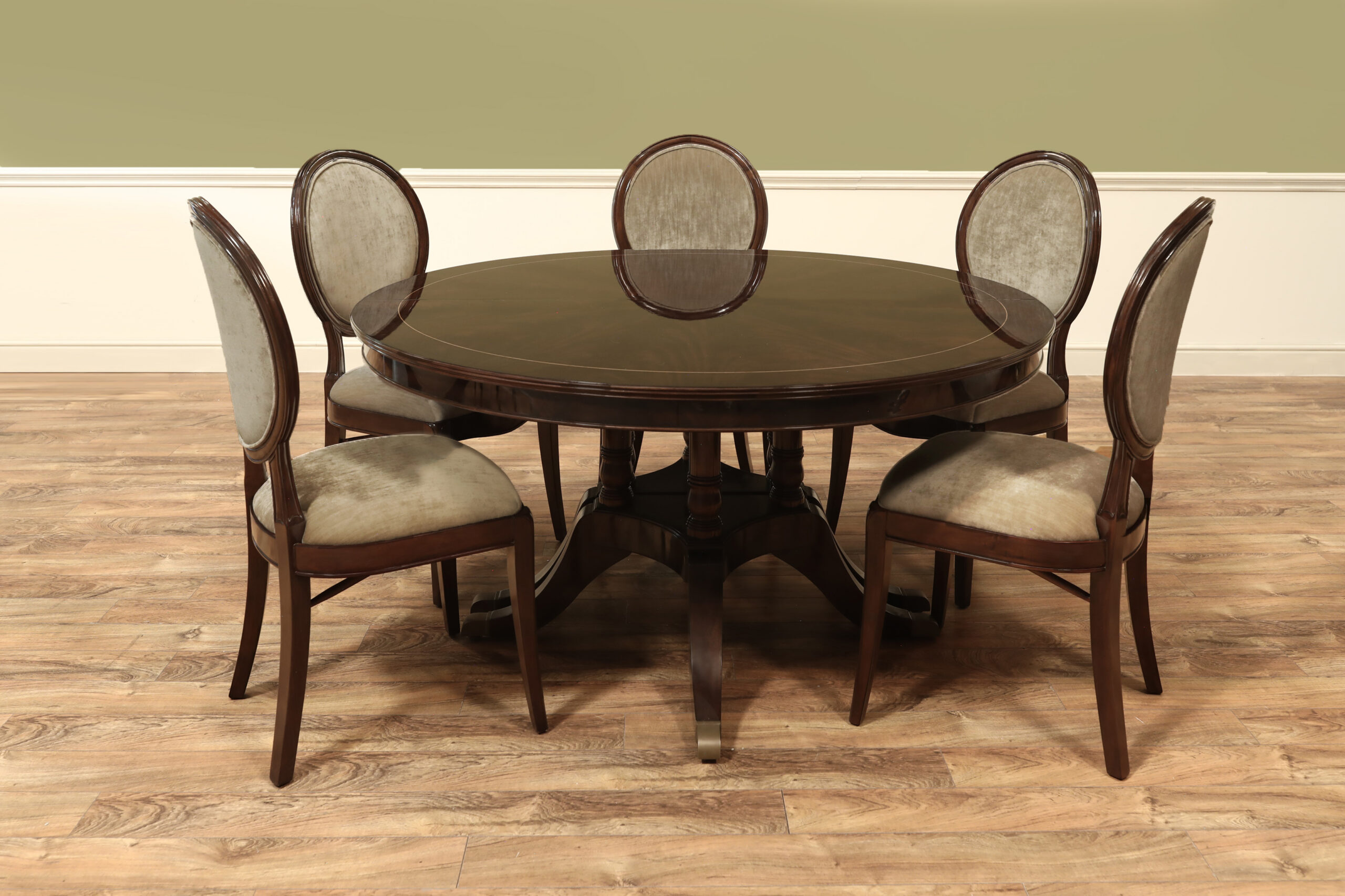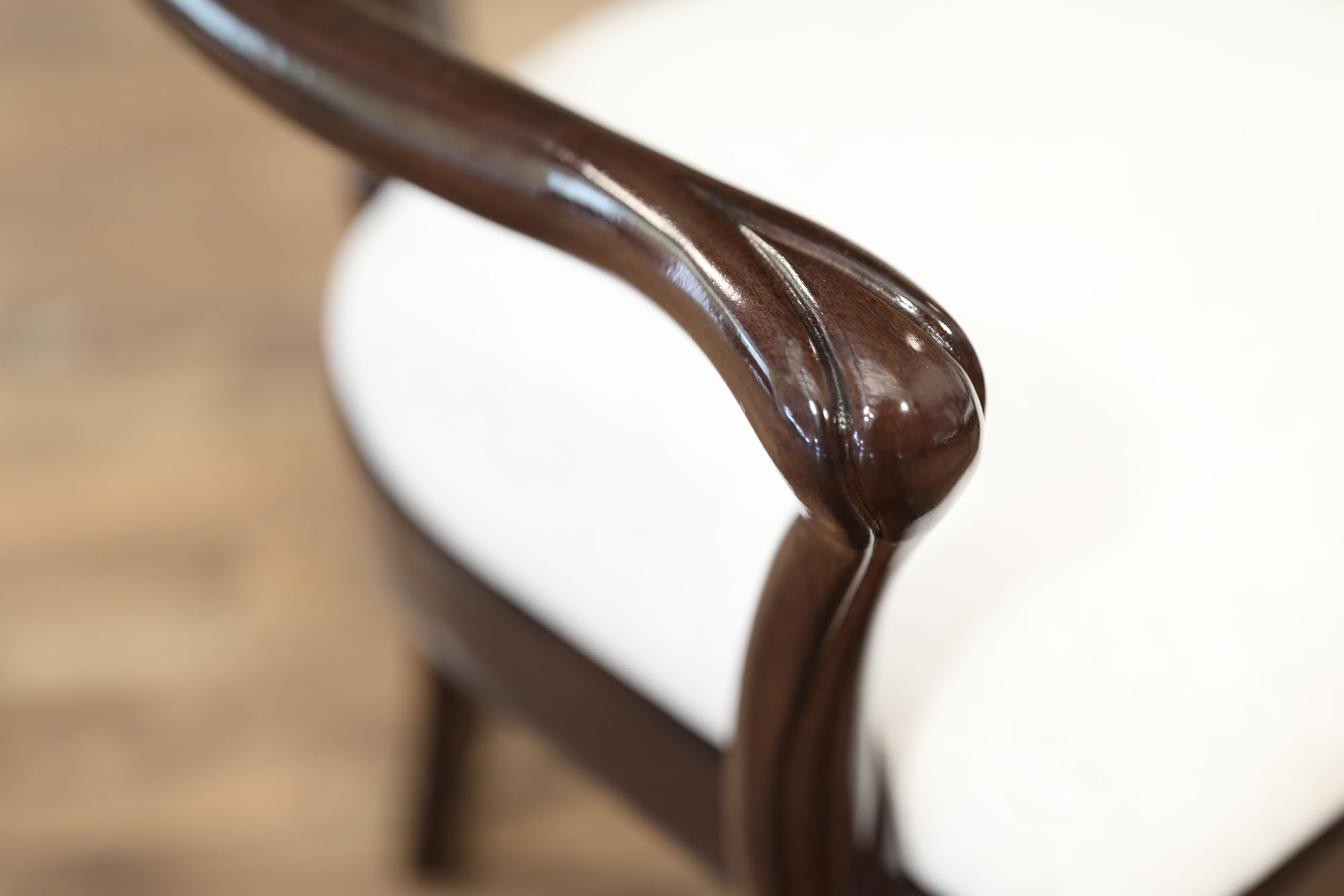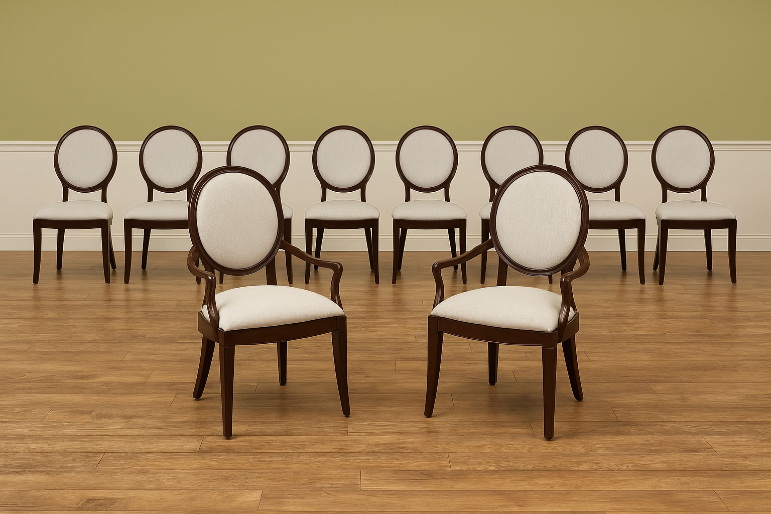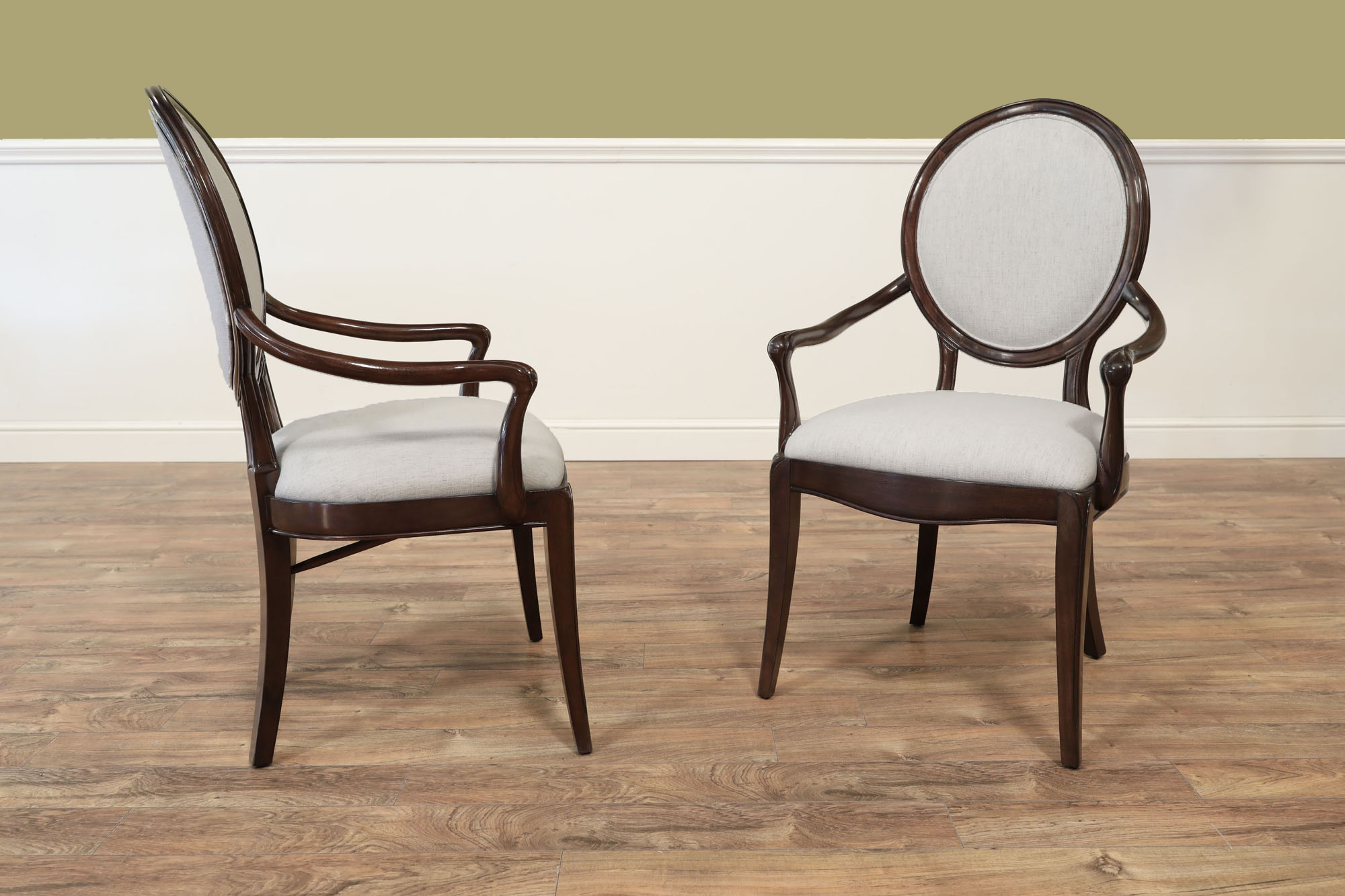 Set of 10 Solid mahogany round-back dining room chairs with engineered Crypton NOMAD SNOW performance fabric, an AP Exclusive by AntiquePurveyor. An updated traditional spoon-back chair with saber legs, minimalistic stretchers, and a dark brown finish. These chairs were designed with a narrow frame, which helps maximize the number of place settings around a dining table. They are only 20.5 inches wide (the Armchair is 25 inches wide), whereas a typical dining chair is about 22 inches wide. A gently sculpted back and generous seat pile make this a very comfortable chair. The neutral, greyish-white fabric is accented with a darker brown thread, and the fabric complements the dark walnut frames. These chairs will coordinate nicely with transitional dining spaces, especially when paired with today’s more modern color schemes. These are designer-grade dining chairs of great quality.