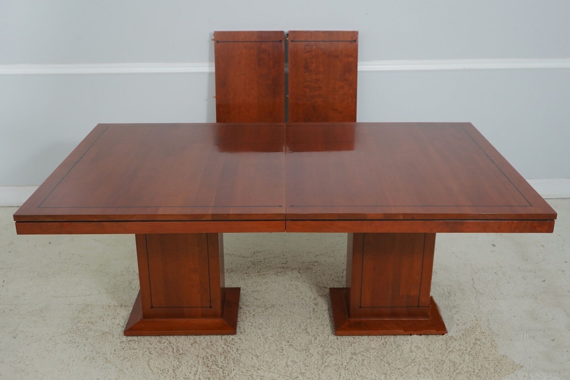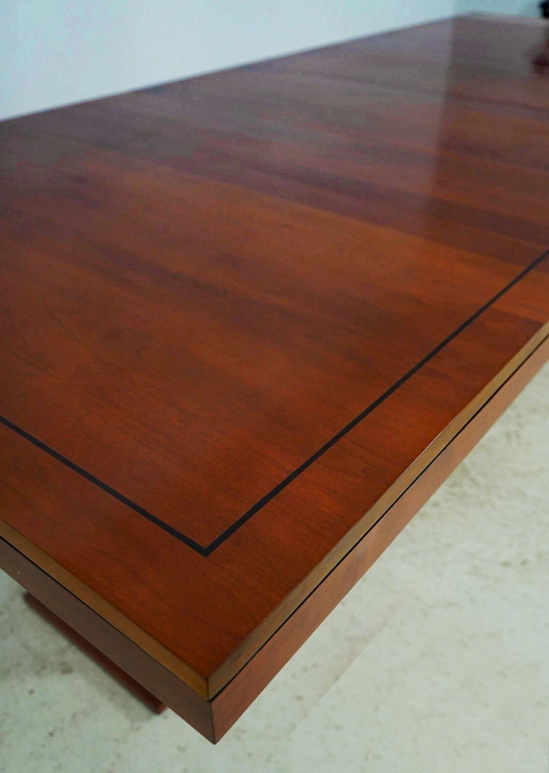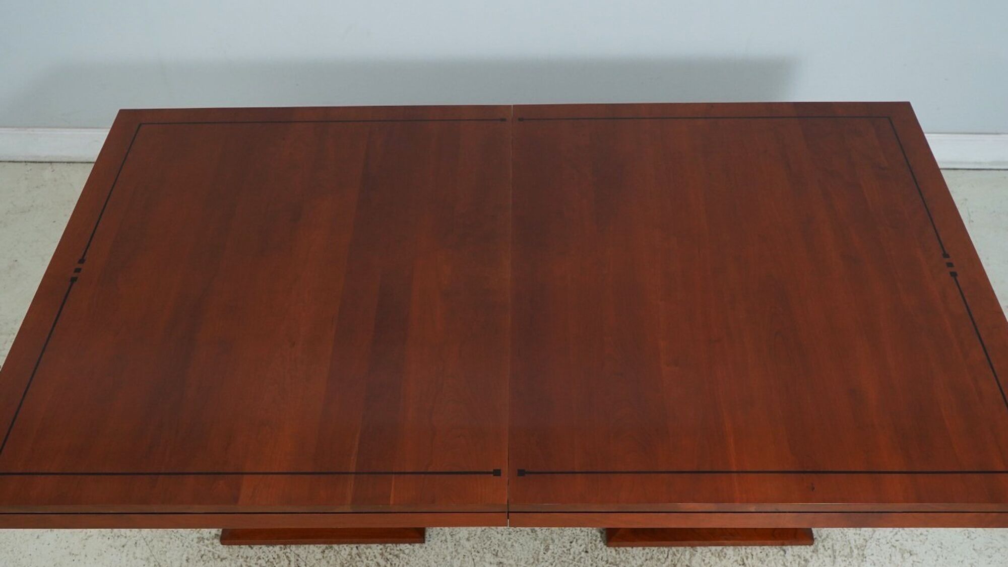 Vintage American-made, solid cherry conference room table or boardroom table with 2 leaves. The double box pedestal is ideal for cable management. Measurements: 74Wx44Dx30H, TWO16-inch leaves open the table to 106″ long