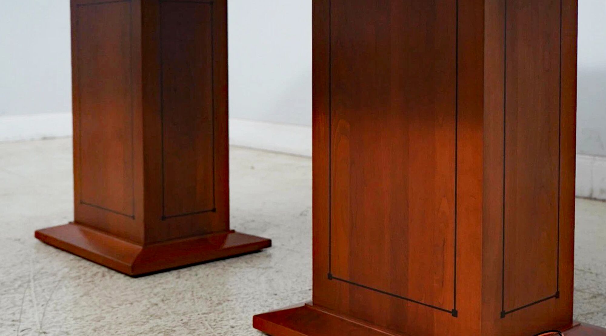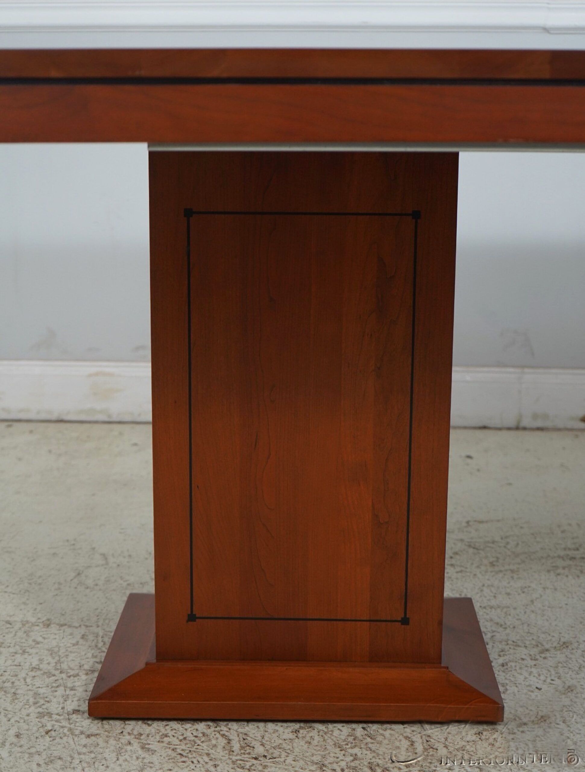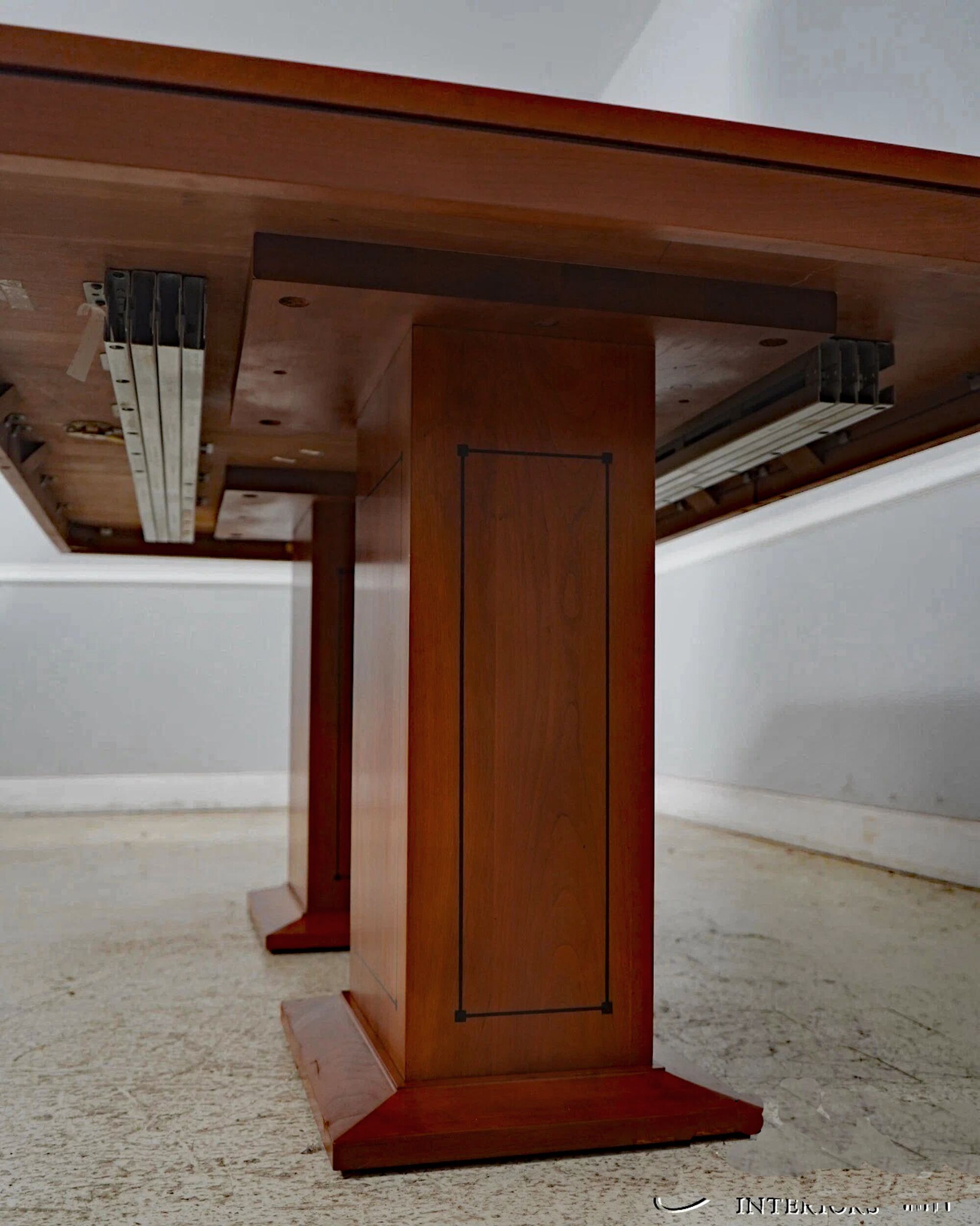 Vintage American-made, solid cherry conference room table or boardroom table with 2 leaves. The double box pedestal is ideal for cable management. Measurements: 74Wx44Dx30H, TWO16-inch leaves open the table to 106″ long