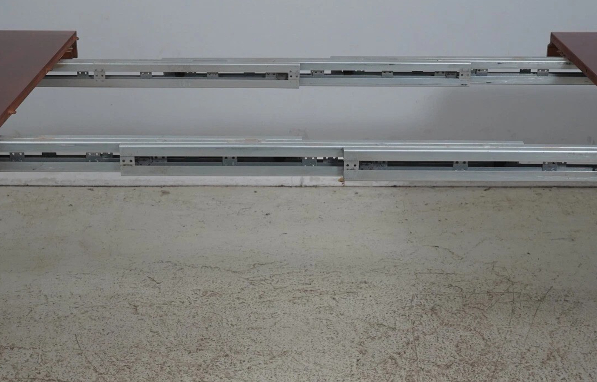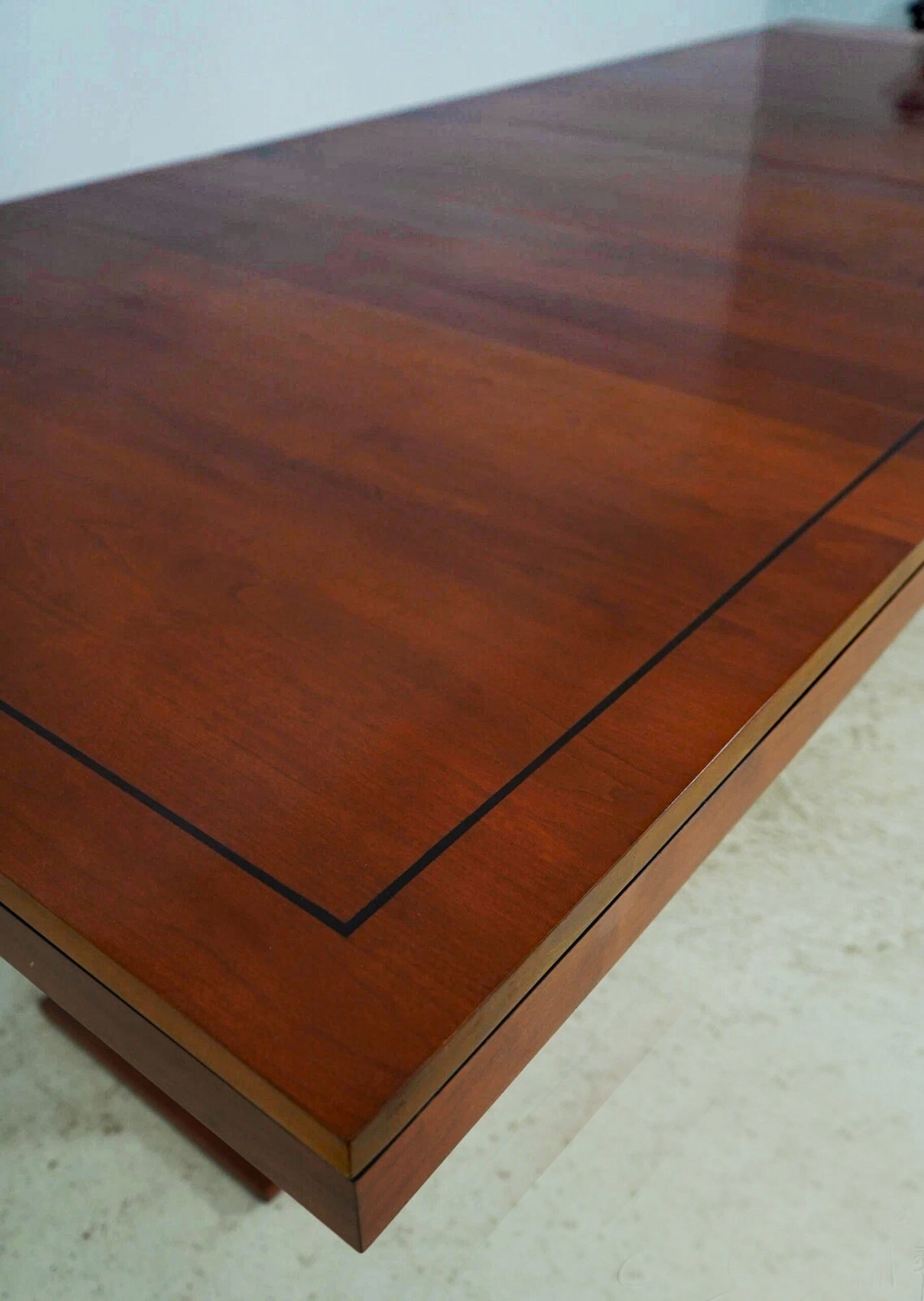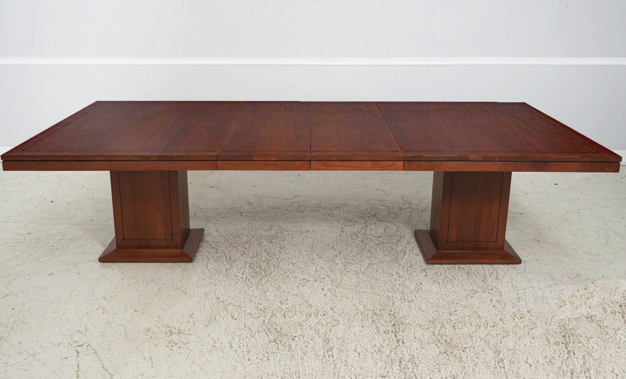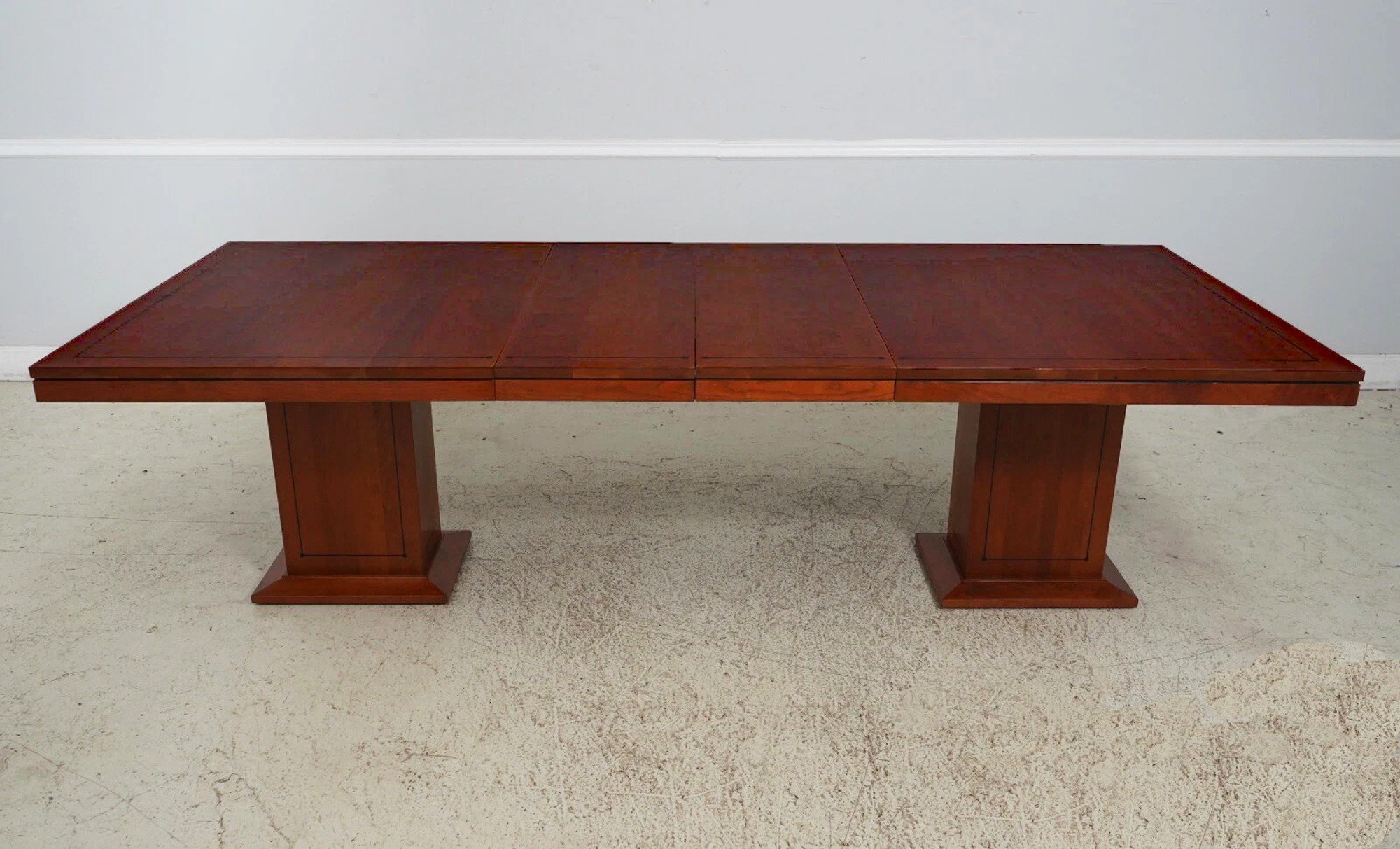 Vintage American-made, solid cherry conference room table or boardroom table with 2 leaves. The double box pedestal is ideal for cable management.