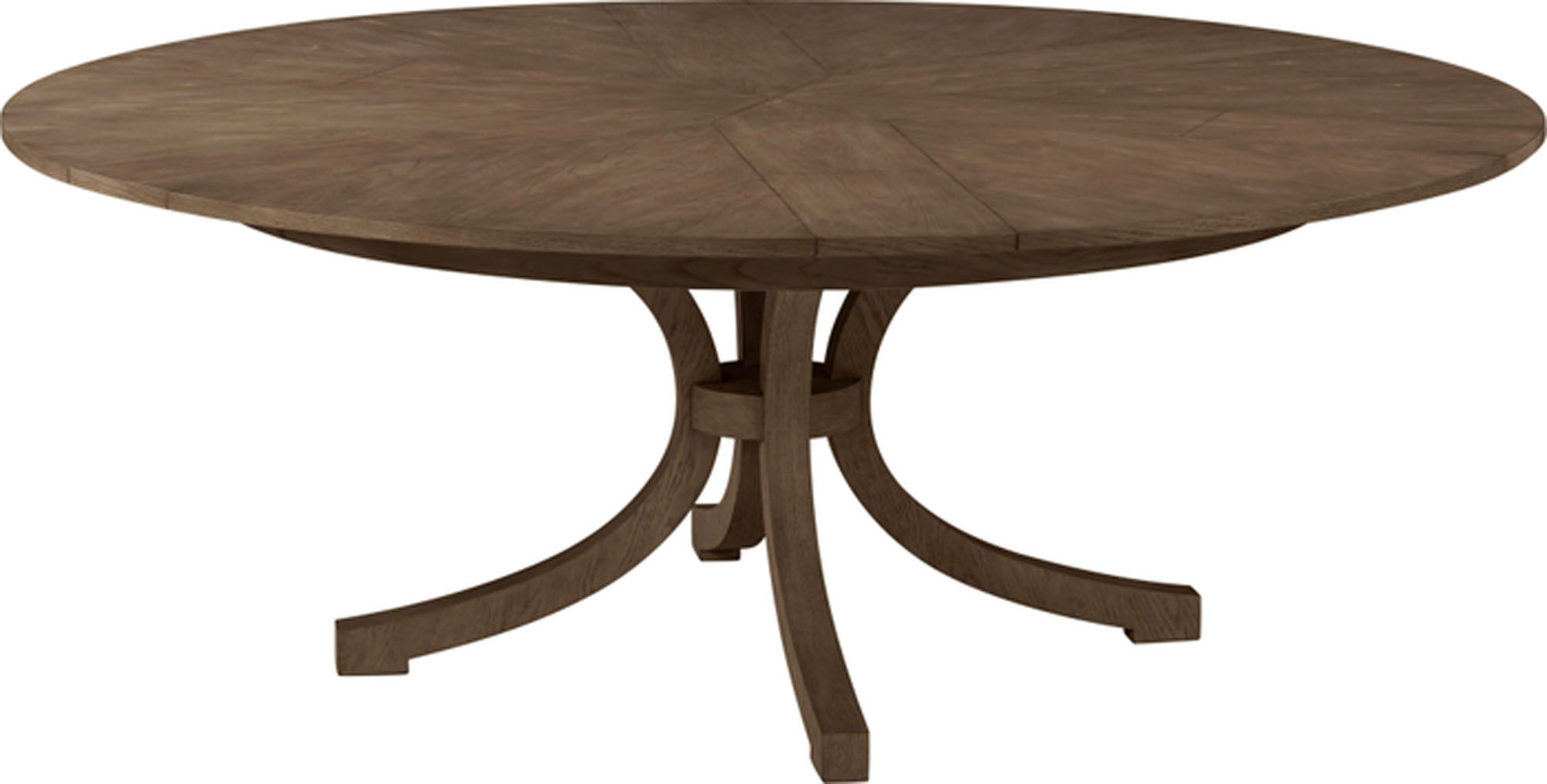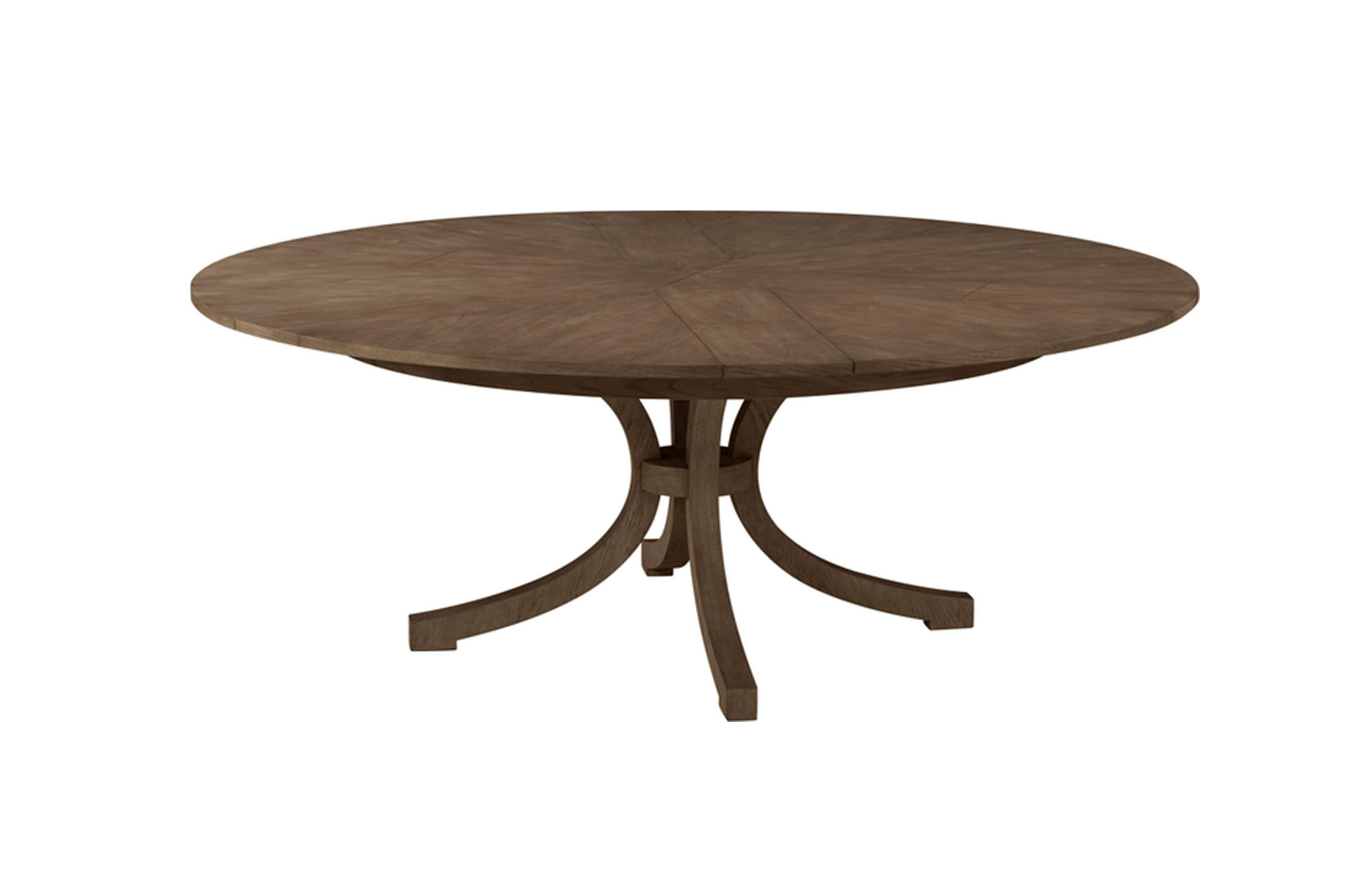 Round Jupe-style dining table crafted in hardwood with a mechanically expanding top. Radial leaves deploy smoothly to extend the table while the pedestal base maintains balanced proportions inspired by classic English designs.