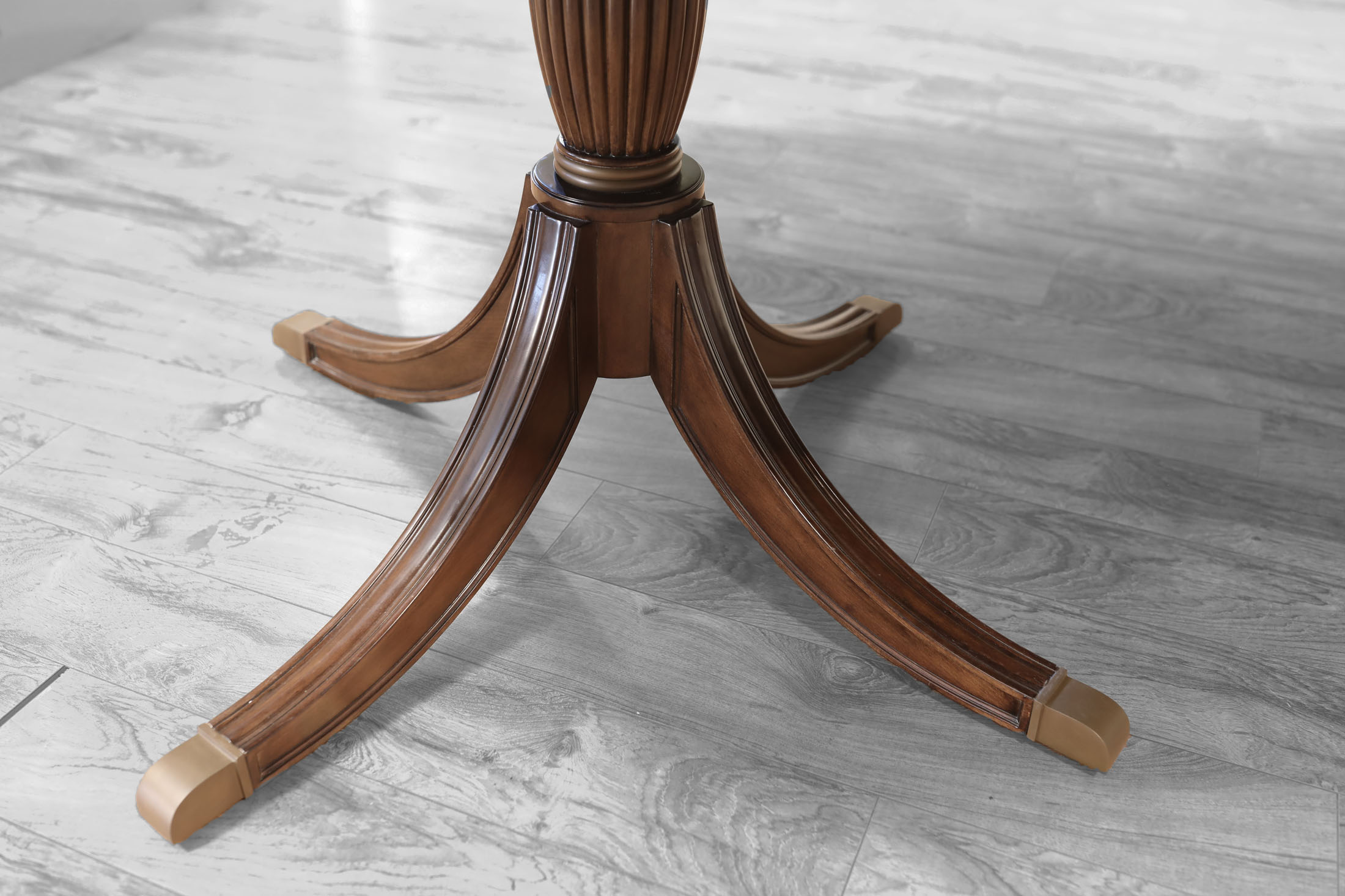 A double pedestal mahogany dining room table for seating up to 14 people, an AP Exclusive by AntiquePurveyor. It has an unusually long-grain crotch mahogany field with a medium brown finish. This mahogany dining table sits on two sturdy Duncan Phyfe pedestals, which are capped with custom-forged brass caps, feet, and levelers.