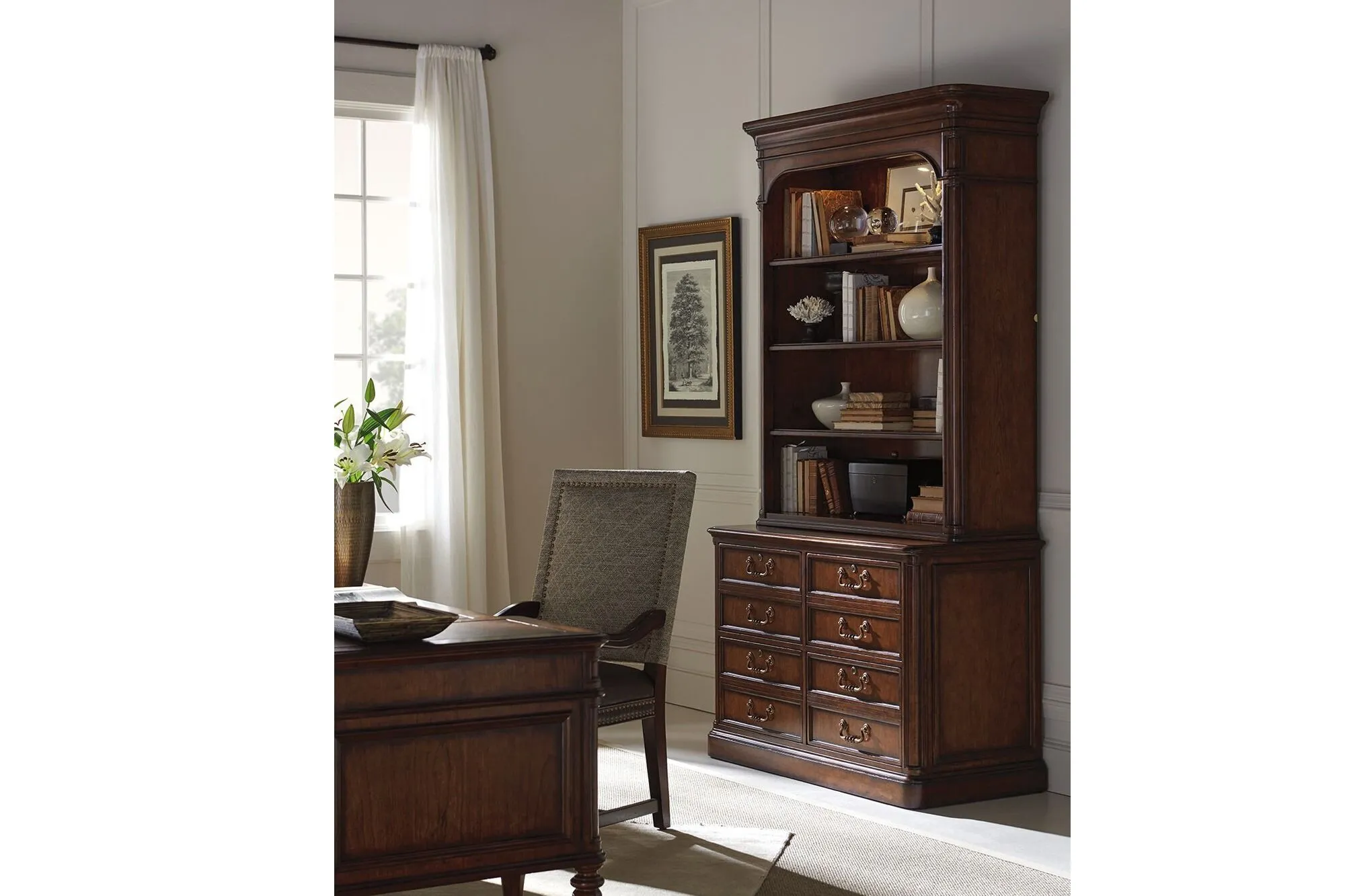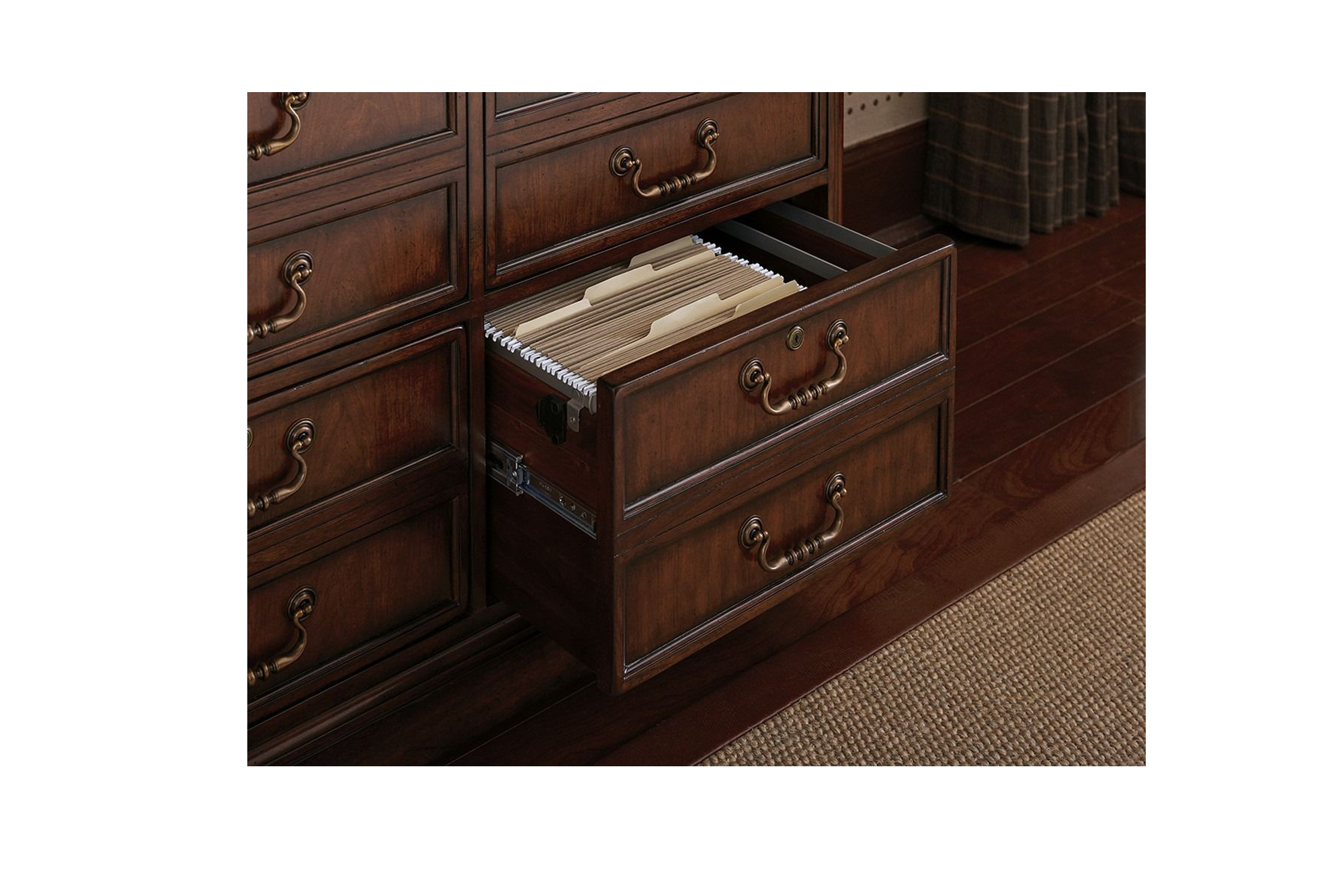 This file chest is constructed in cherry and includes four lockable file drawers fitted with brass-finished hardware. Each drawer is designed to accommodate legal or letter size files and provides enclosed document storage. The chest is finished in a chestnut brown tone applied to the cherry wood surfaces. The file chest is compatible with the Lanier deck, which is available separately. The piece is intended for residential or office use where secure file storage is required.