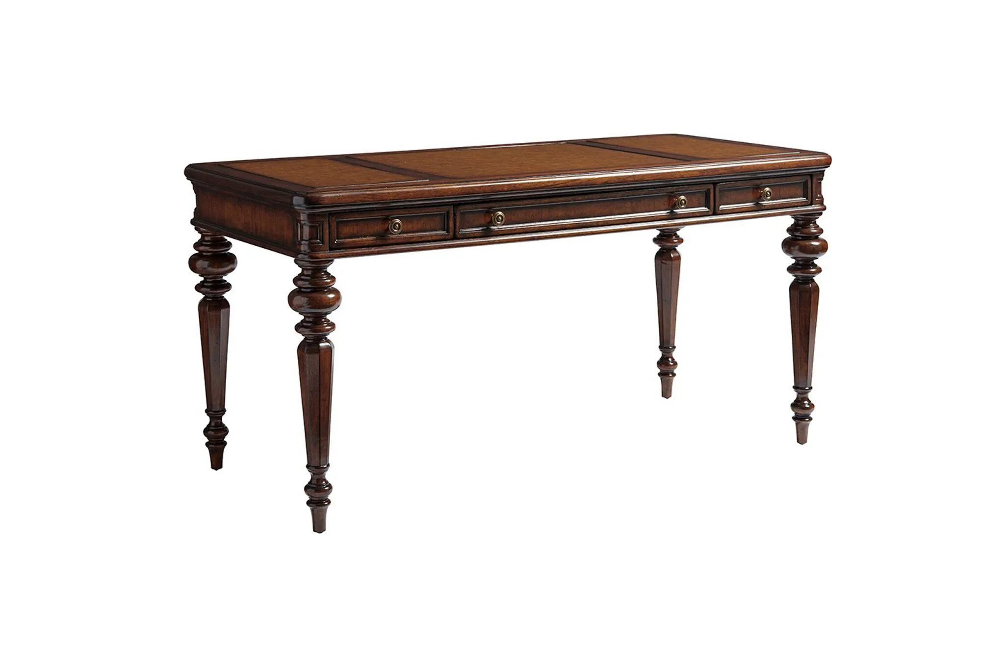 This writing desk is constructed in a traditional form and features a faux leather writing surface. The desk is supported by ringed tapered legs and finished in cherry veneers with a chestnut brown coloration. Storage is provided by three full-extension, self-closing drawers designed to hold writing implements, stationery, and small electronic devices. The drawers are fitted with metal knobs finished in aged brass. The desk is intended for residential or office use where a fixed writing surface and enclosed drawer storage are required.