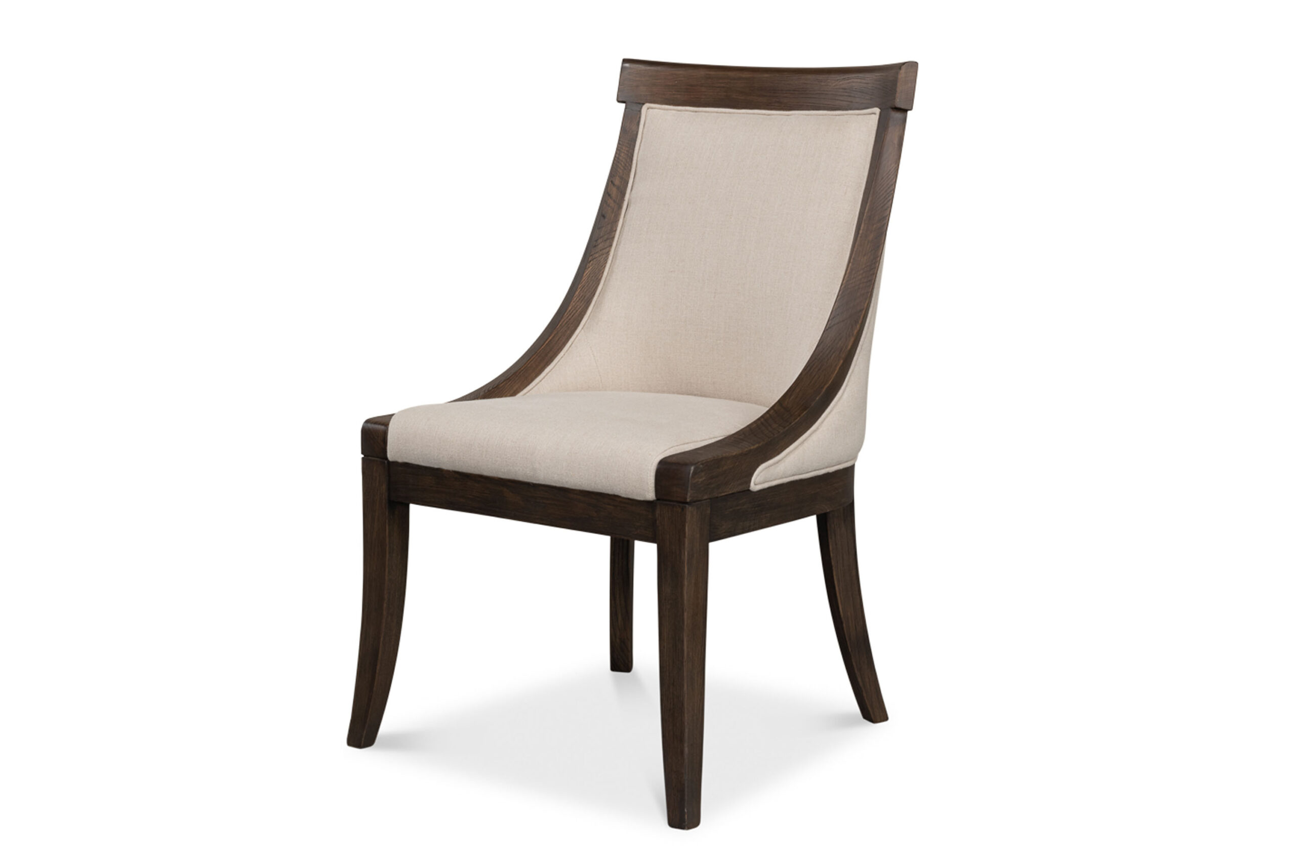 Transitional hip-hugger upholstered dining side chair on a dark ash frame
