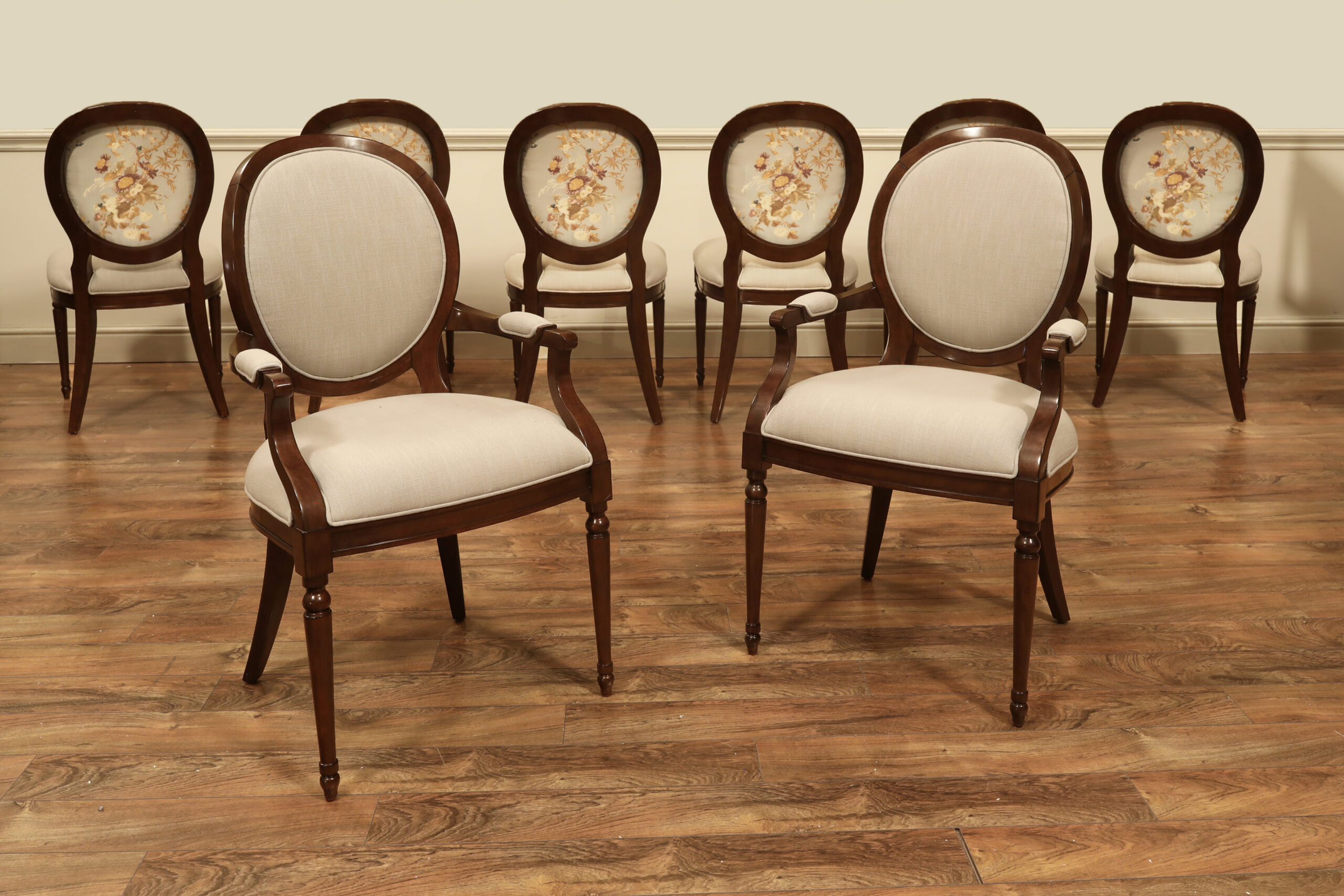 These chairs come with a durable, stain-resistant fabric in a widely acceptable neutral linen color.  Many pictures show this chair with COM material, which adds to the cost. We can help design a chair around your space, like we did for this client, or you can send fabrics to our studio.  We did these powder blue, linen and bronze floral chairs to match the walls, the case molding, and the floors of an existing space.  These chairs are pictured in a Historic NY Victorian.  The table and corner cabinets might also be available.  Here is a link to the table, here is a link to the china cabinet.