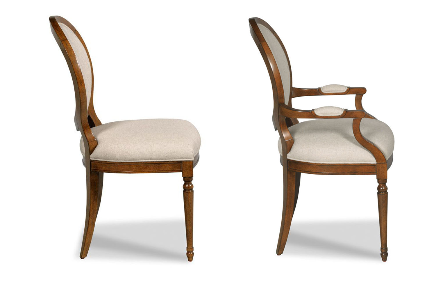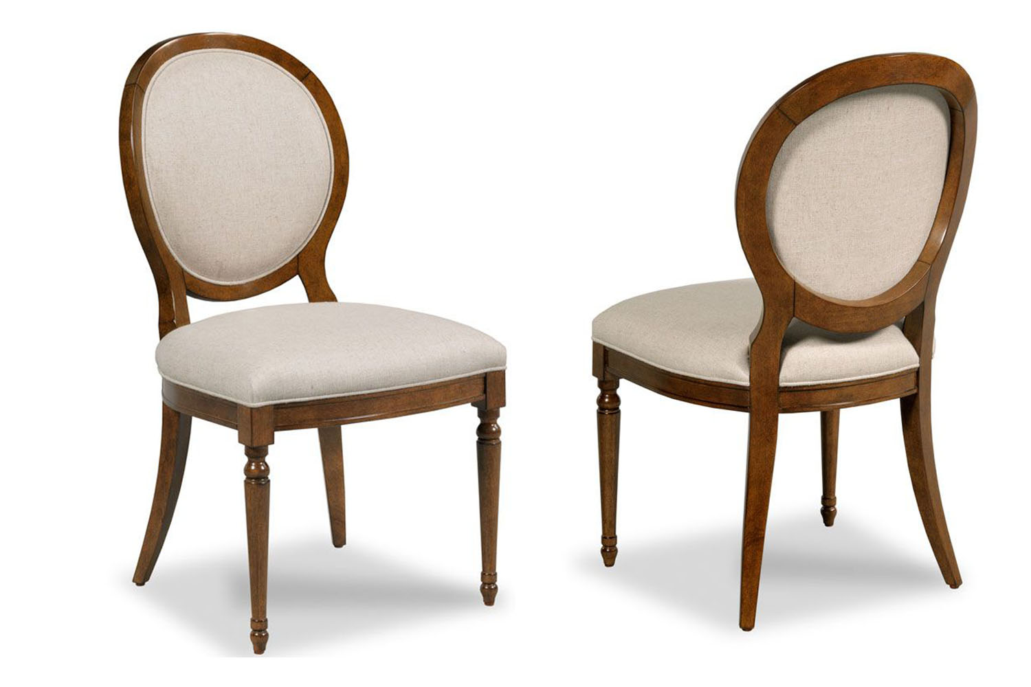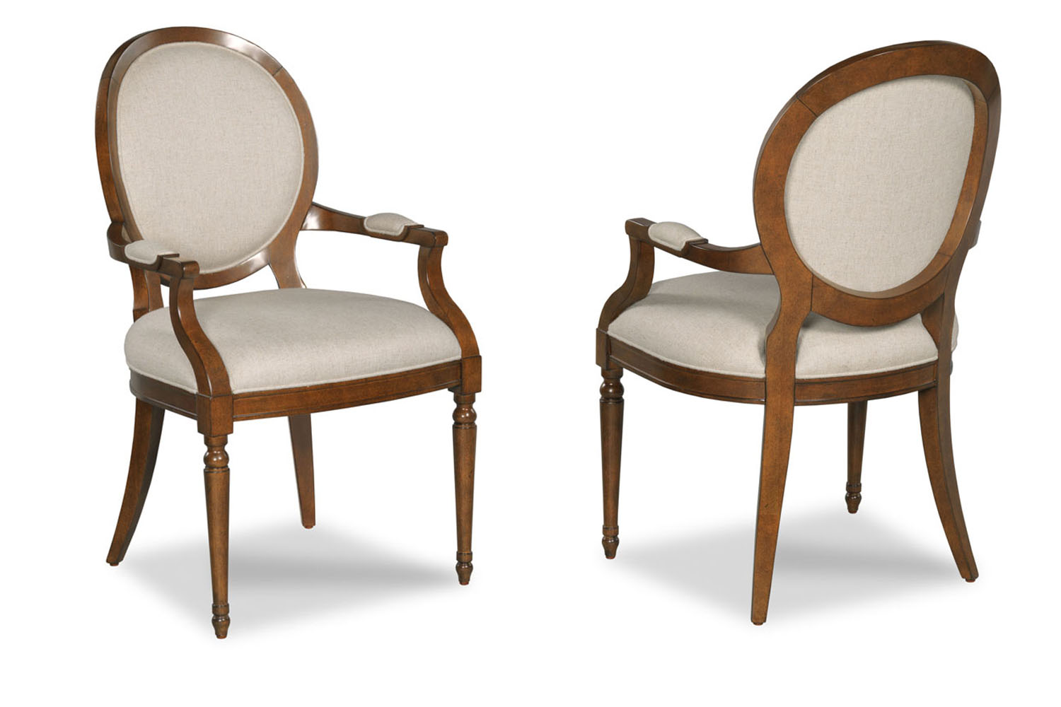 Transitional round-back dining room chairs. A French-inspired, modernized round back chair with fewer carvings than a traditional Louis XVI style chair.  They feature saber rear legs and coordinate with Duncan Phyfe-style dining tables.  These chairs have a medium brown, syrupy color finish. They are upholstered in a stain-resistant linen fabric. These chairs might also be available with leather upholstery and brass nails, but inventory may be limited.