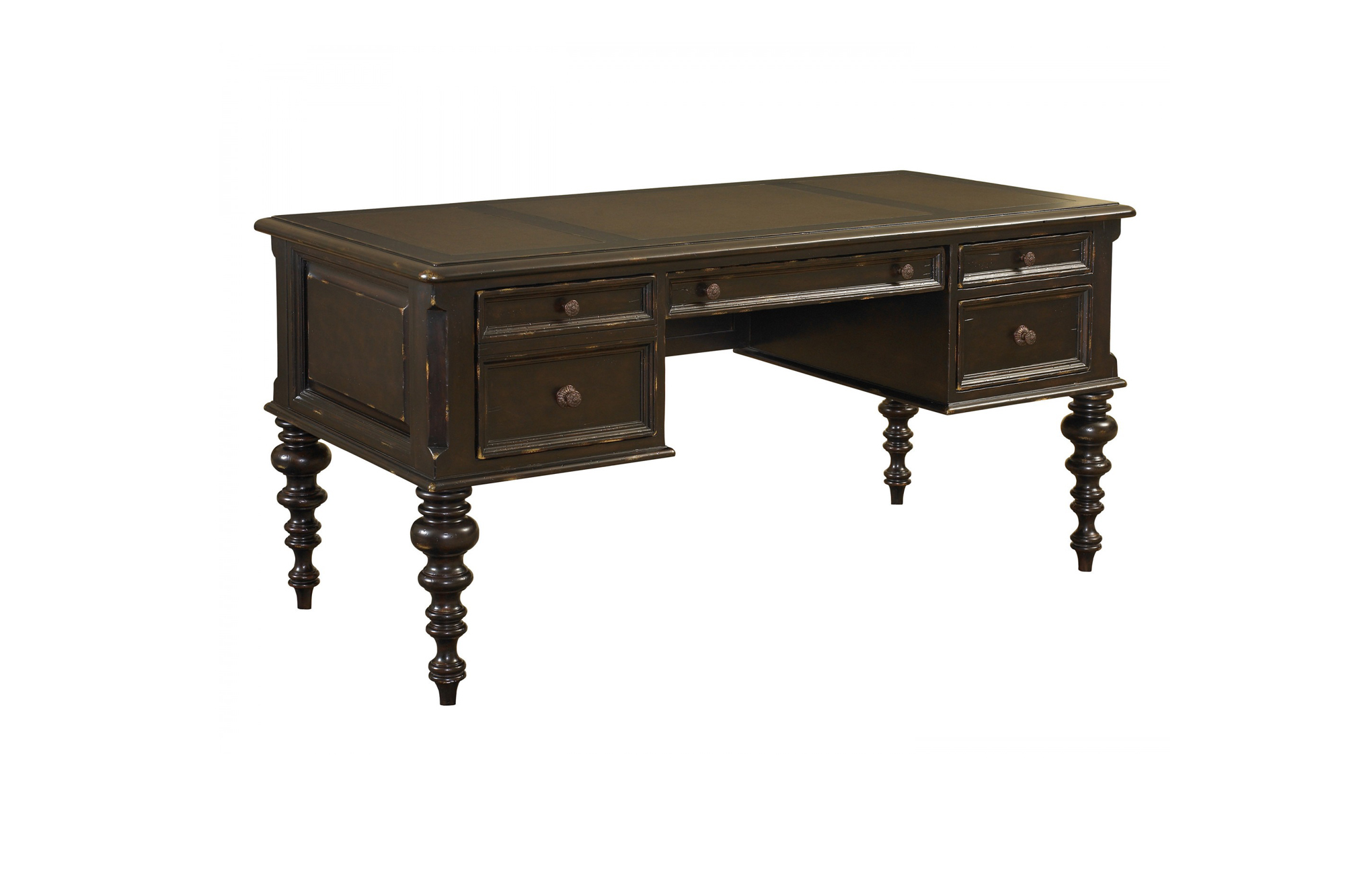 This writing desk is in a Victorian style and features a leather writing surface. The desk is supported by ringed legs and incorporates storage drawers within the case. A keyboard tray is integrated to support computer use. The desk is intended for residential or office use where a fixed writing surface, drawer storage, and keyboard accommodation are required.