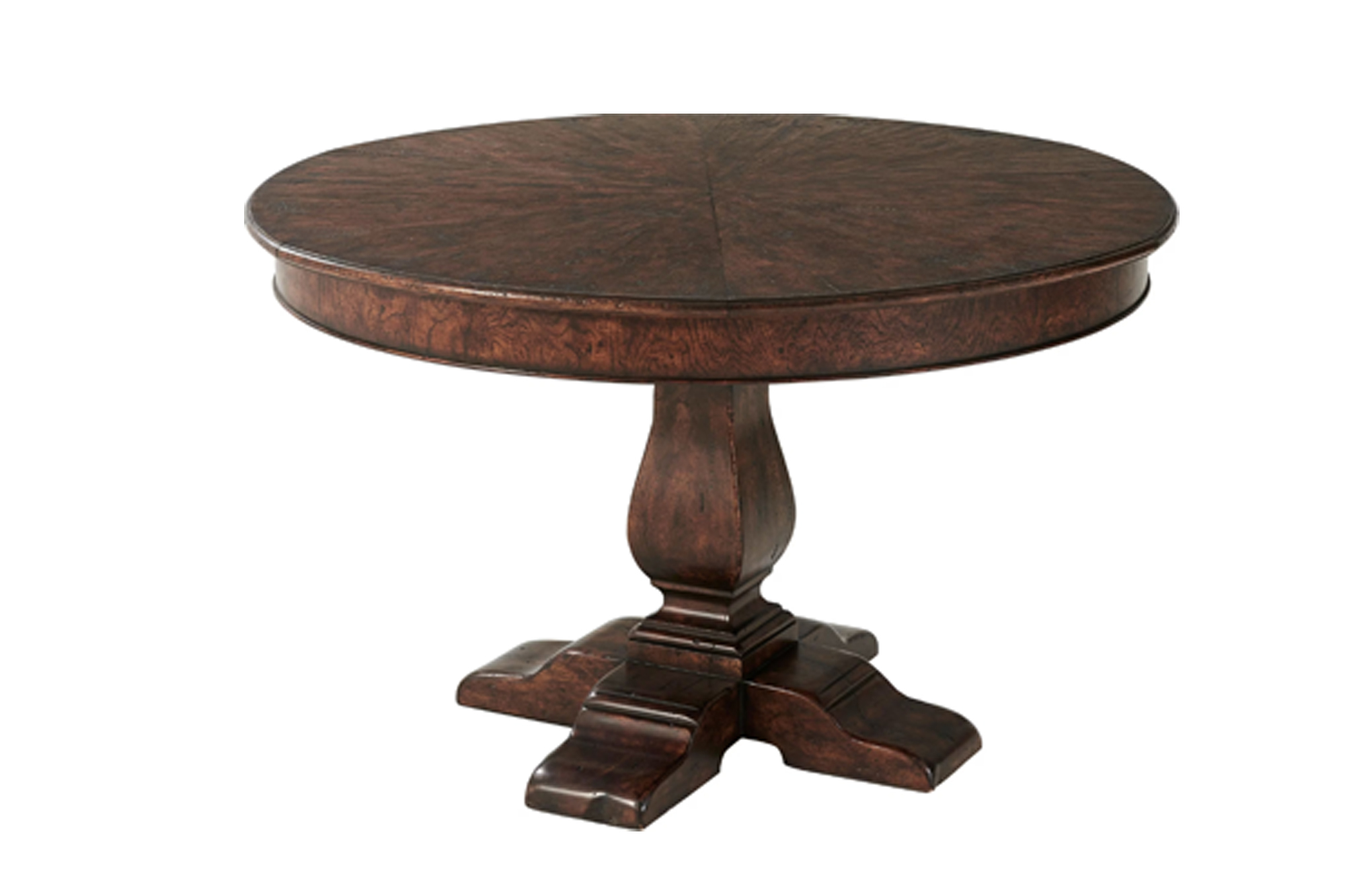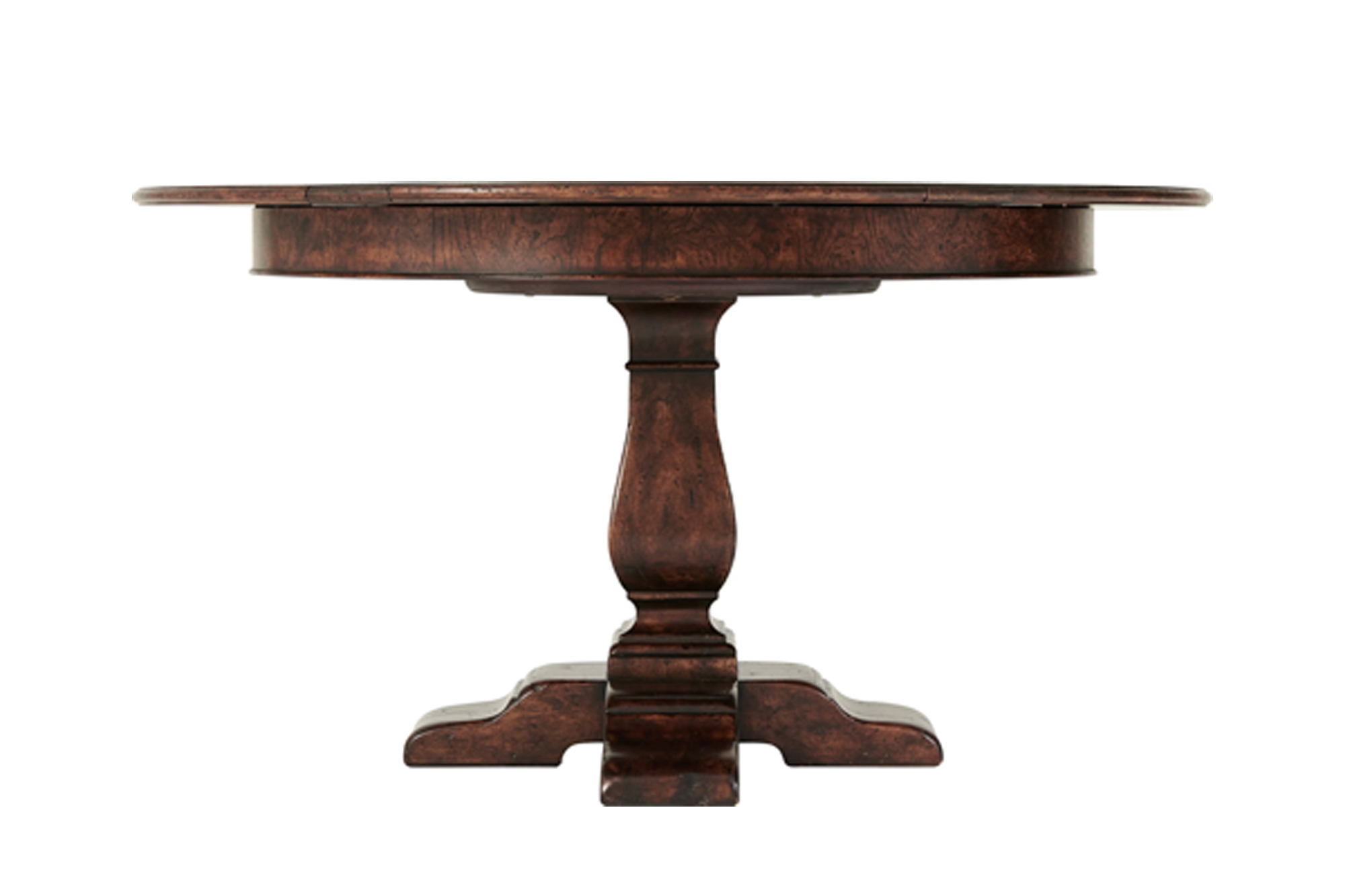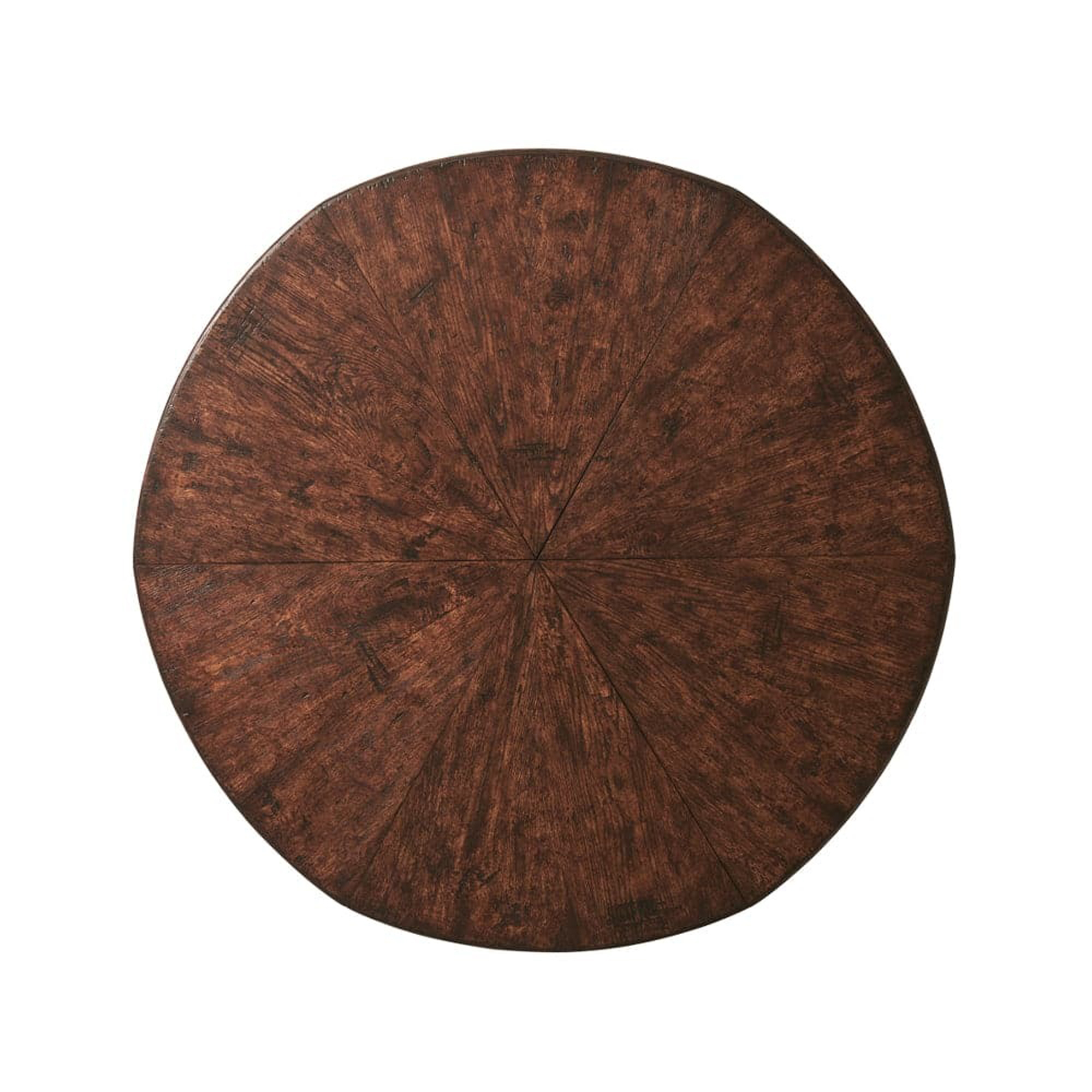 Round Jupe-style dining table crafted in oak with a mechanically expanding top. Concealed leaves deploy smoothly to extend the table, while the solid pedestal base provides stability and a classic silhouette inspired by traditional English designs.