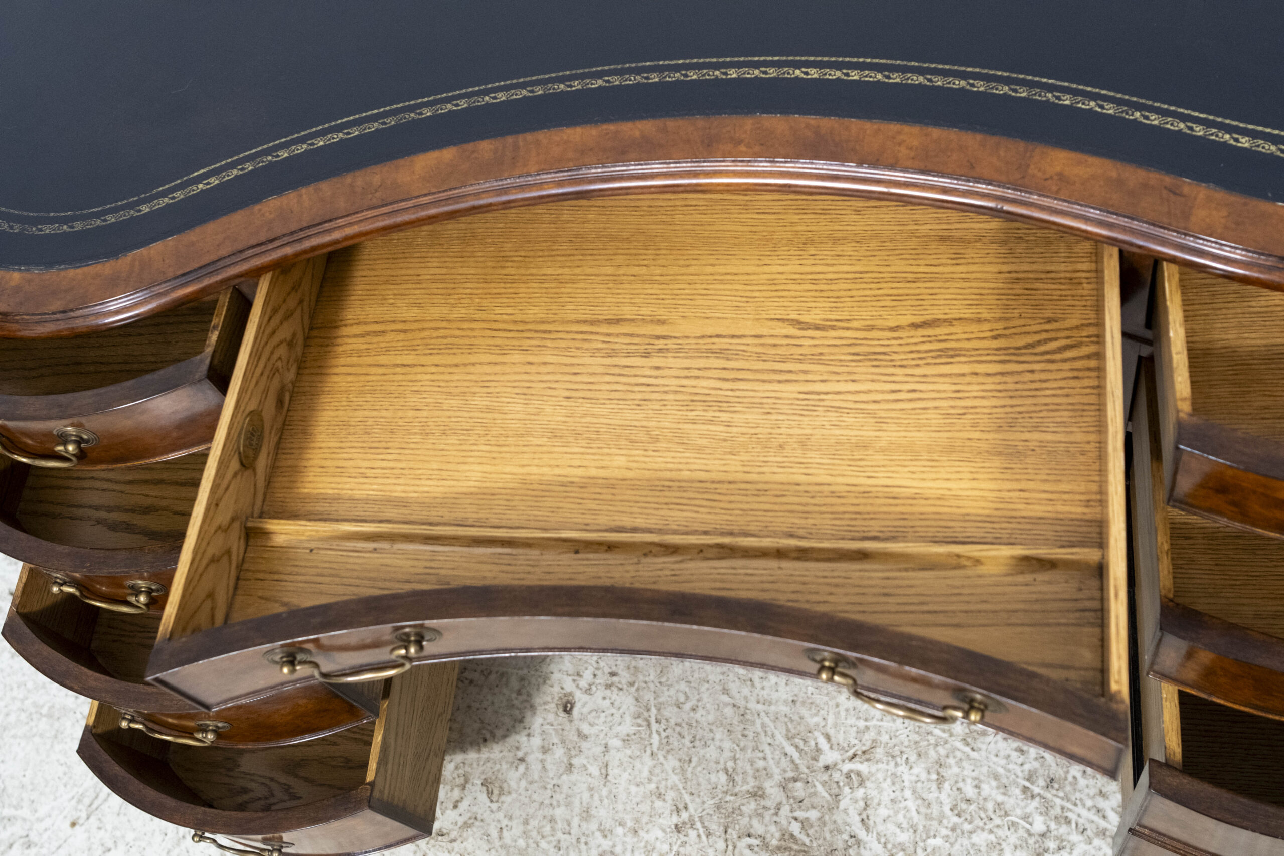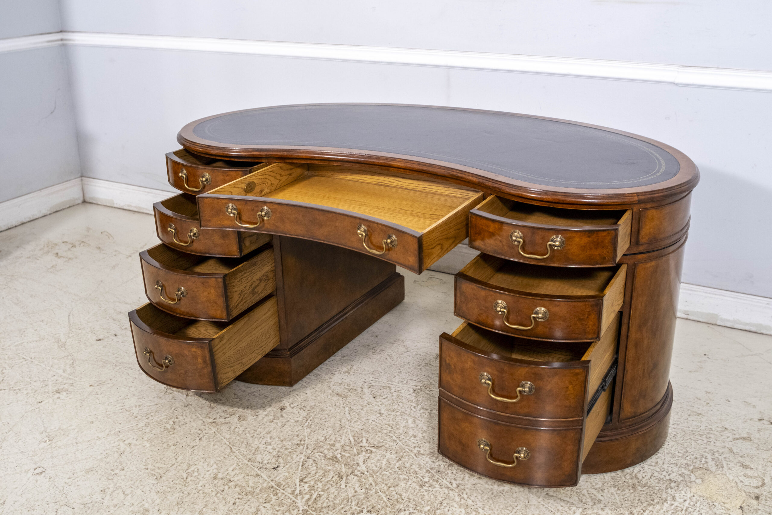 Home » Catalog » Vintage Walnut Kidney Desk with Black Leather Top and Gold Tooling