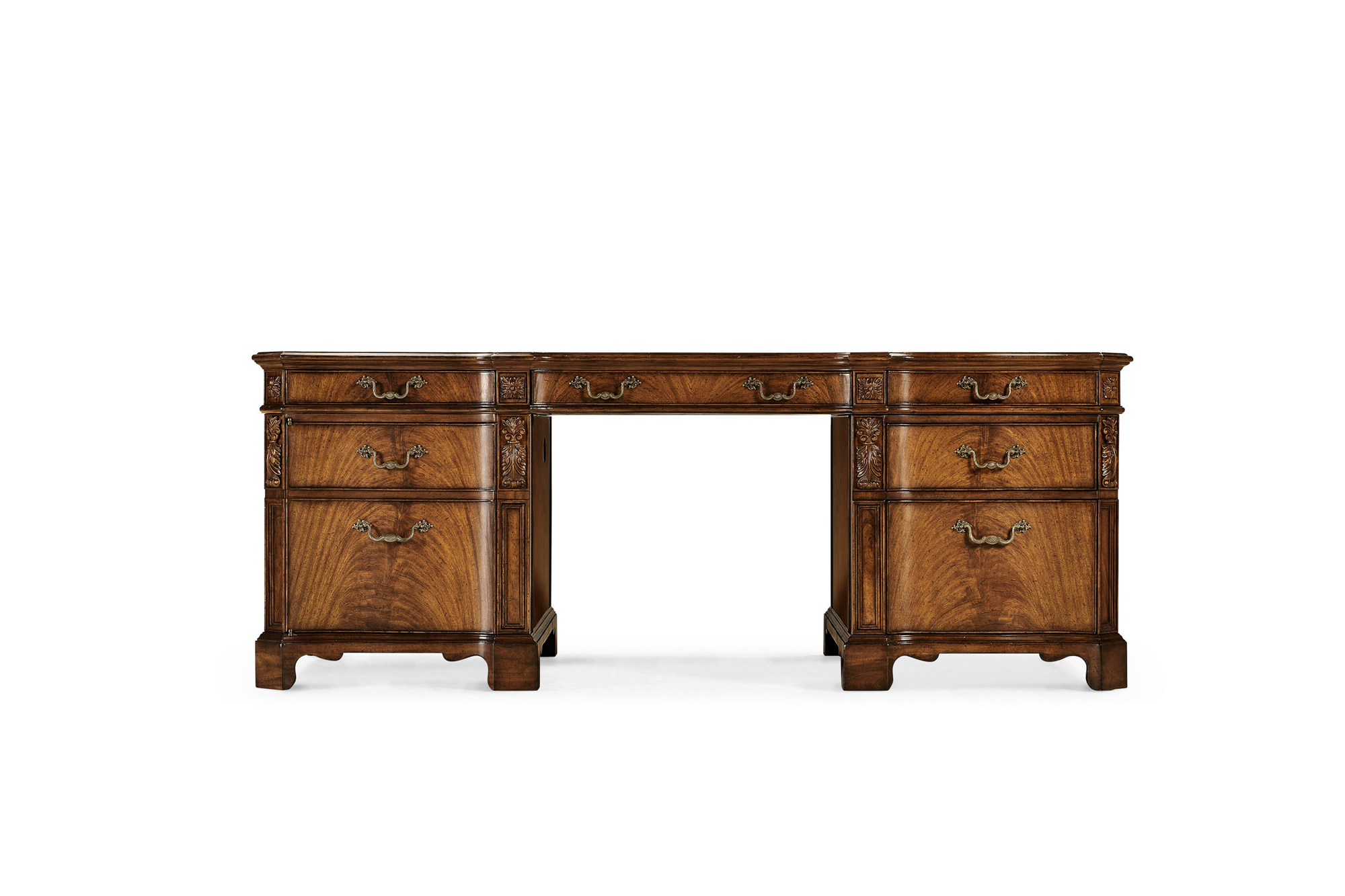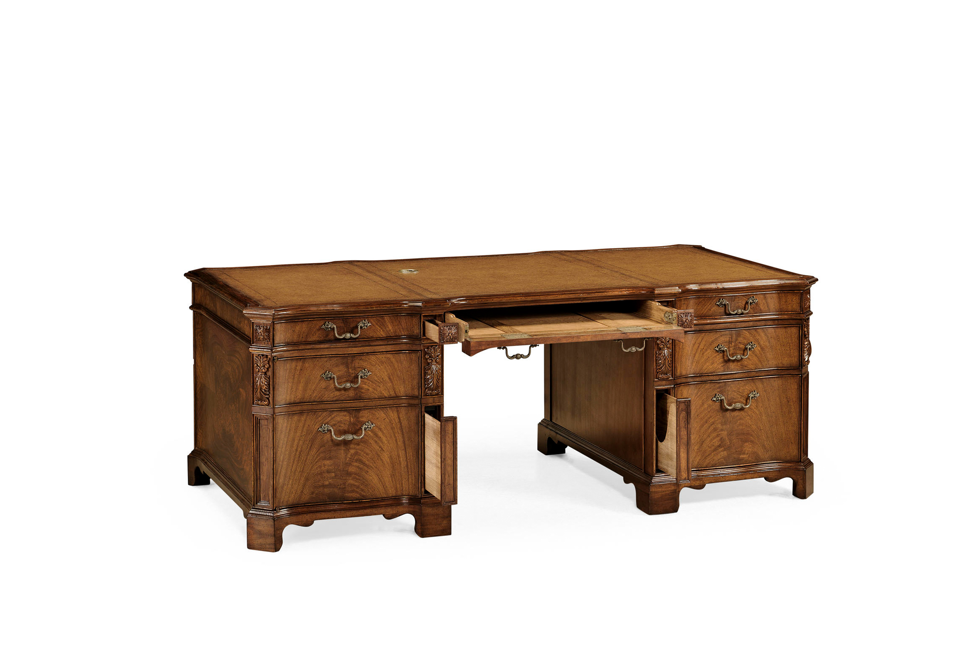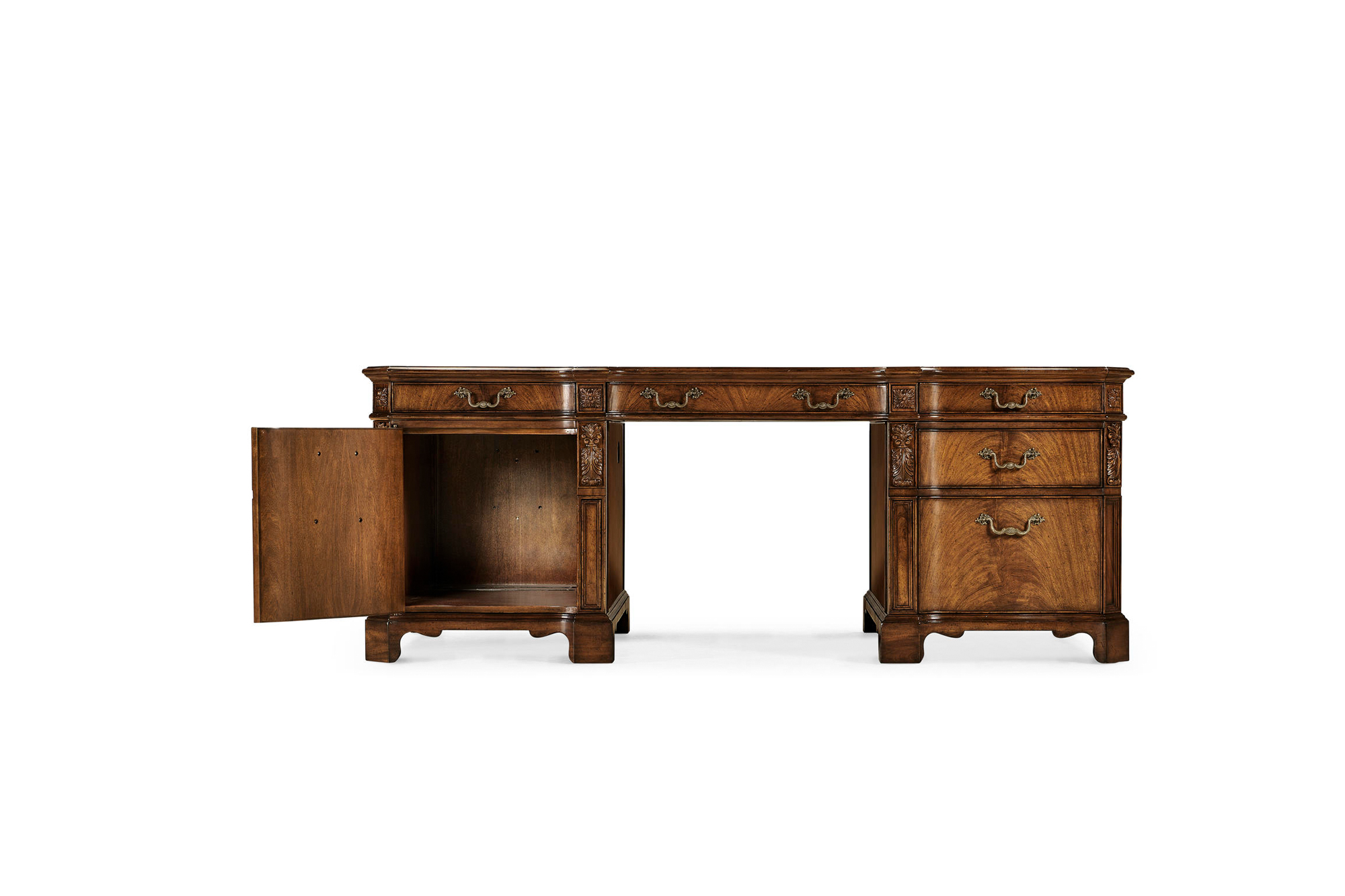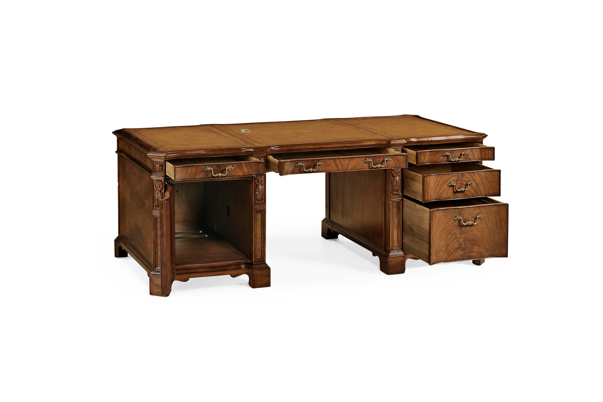Walnut faux partners desk with tan inset leather top, cable management and secret drawers. Large cupboard to left and drawers to right with hanging file facility. Fine carved details throughout.
