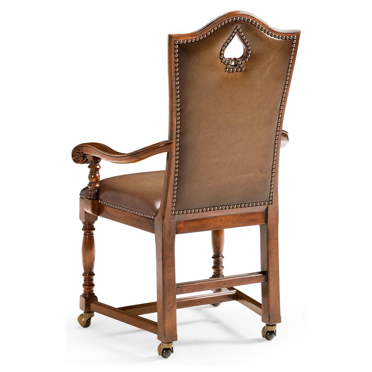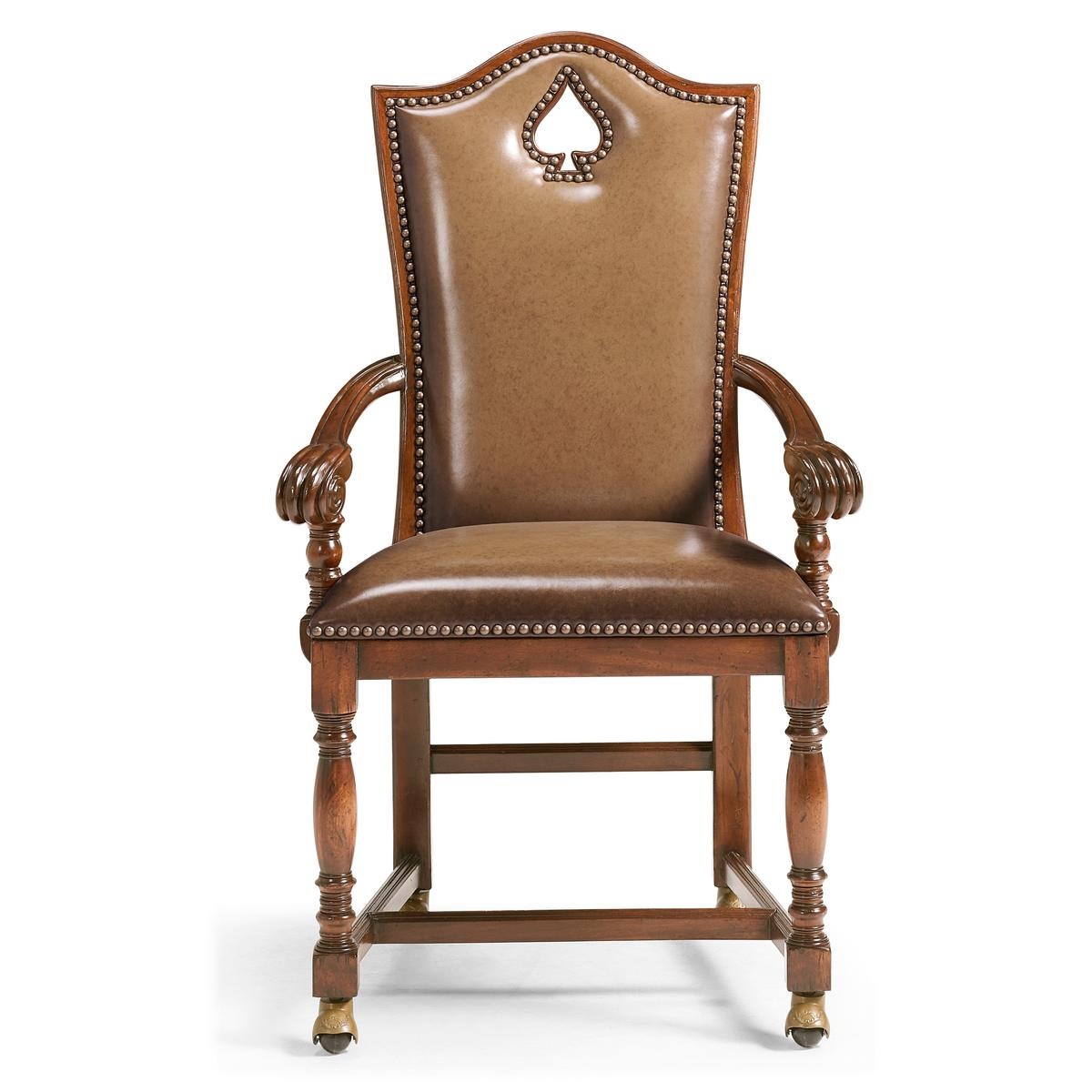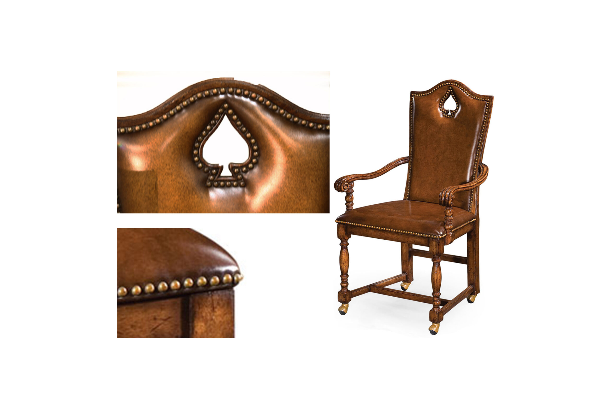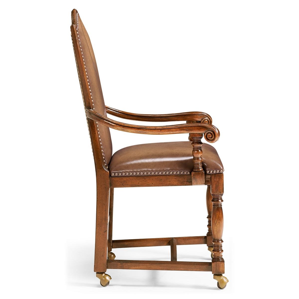 Leather upholstered armchair with shaped back presenting a traditional European influenced form with a spade pieced back. The tall back is upholstered in rich brown leather and outlined with a continuous border of brass nailhead trim that follows the shaped crest and side rails. At the center of the back a decorative pierced spade-shaped opening introduces a distinctive visual element while maintaining the strong vertical profile of the chair. The upholstered seat is generously proportioned and similarly trimmed with brass nailheads along the seat rail. Shaped wooden arms sweep outward in a gentle curve and terminate in scrolled handholds, supported by turned arm posts. The frame is constructed in wood with turned front legs and straight rear supports, joined by stretchers that reinforce the base structure. The chair is fitted with brass-capped casters, allowing it to move easily across flooring surfaces while preserving its traditional appearance. The combination of leather upholstery, nailhead detailing, and turned wooden supports creates a substantial armchair suitable for dining rooms, libraries, or study environments.