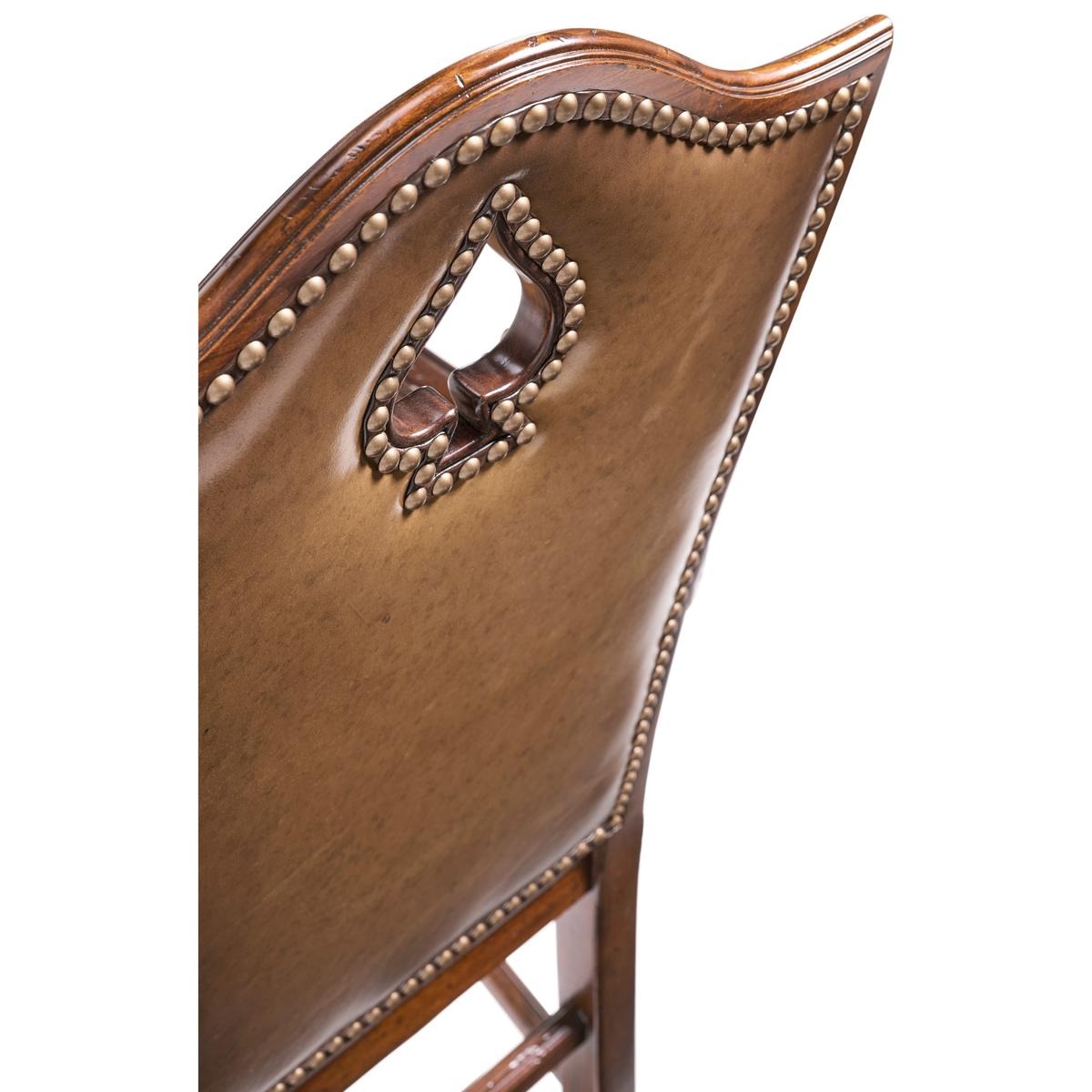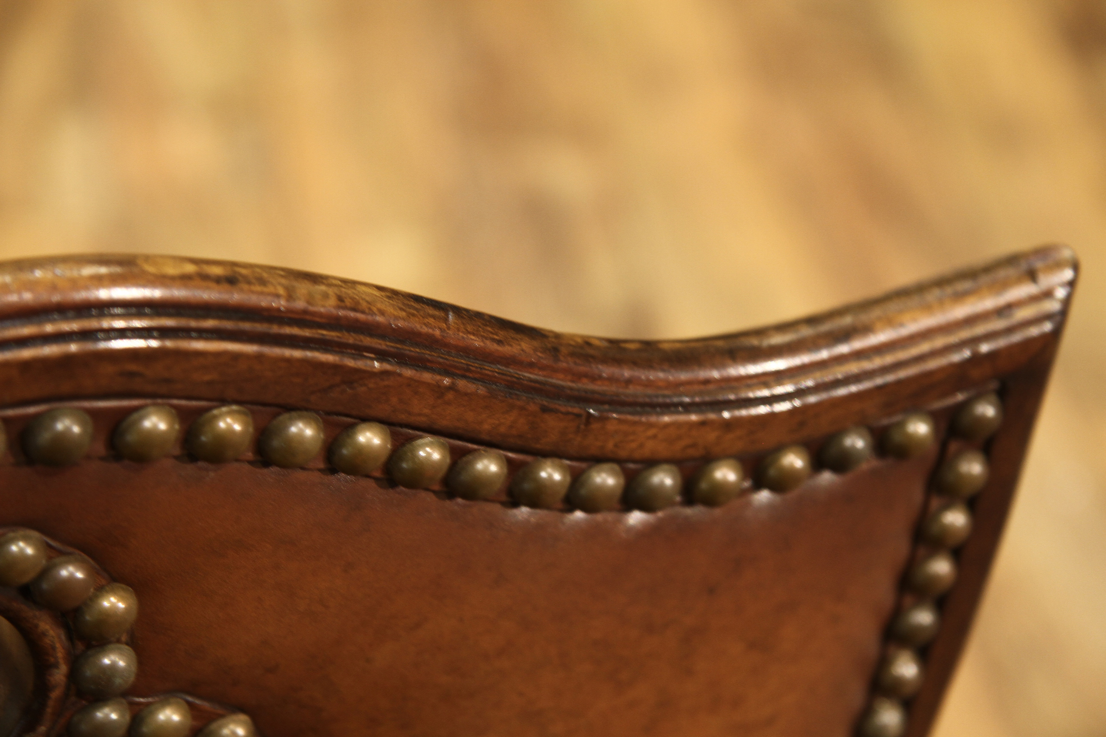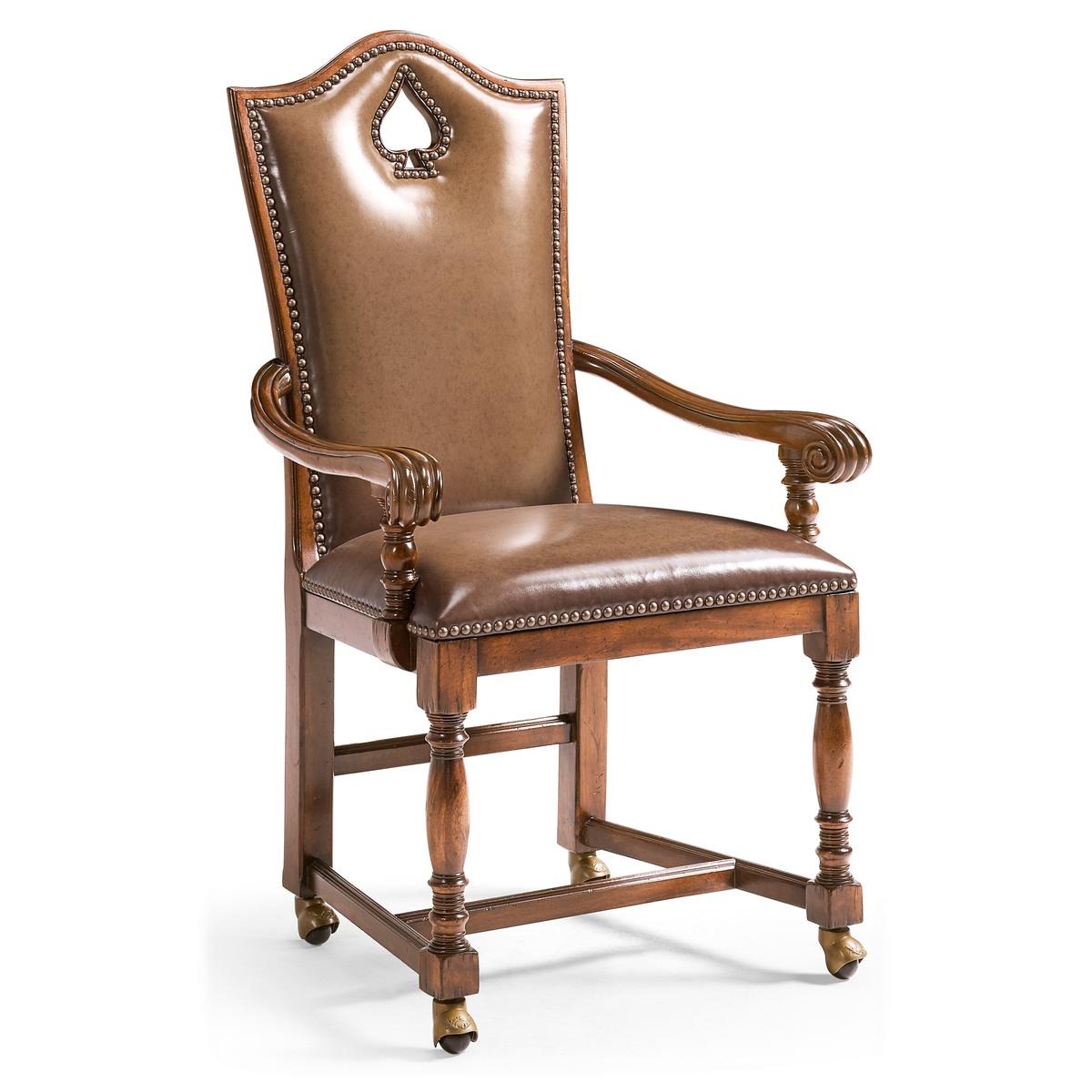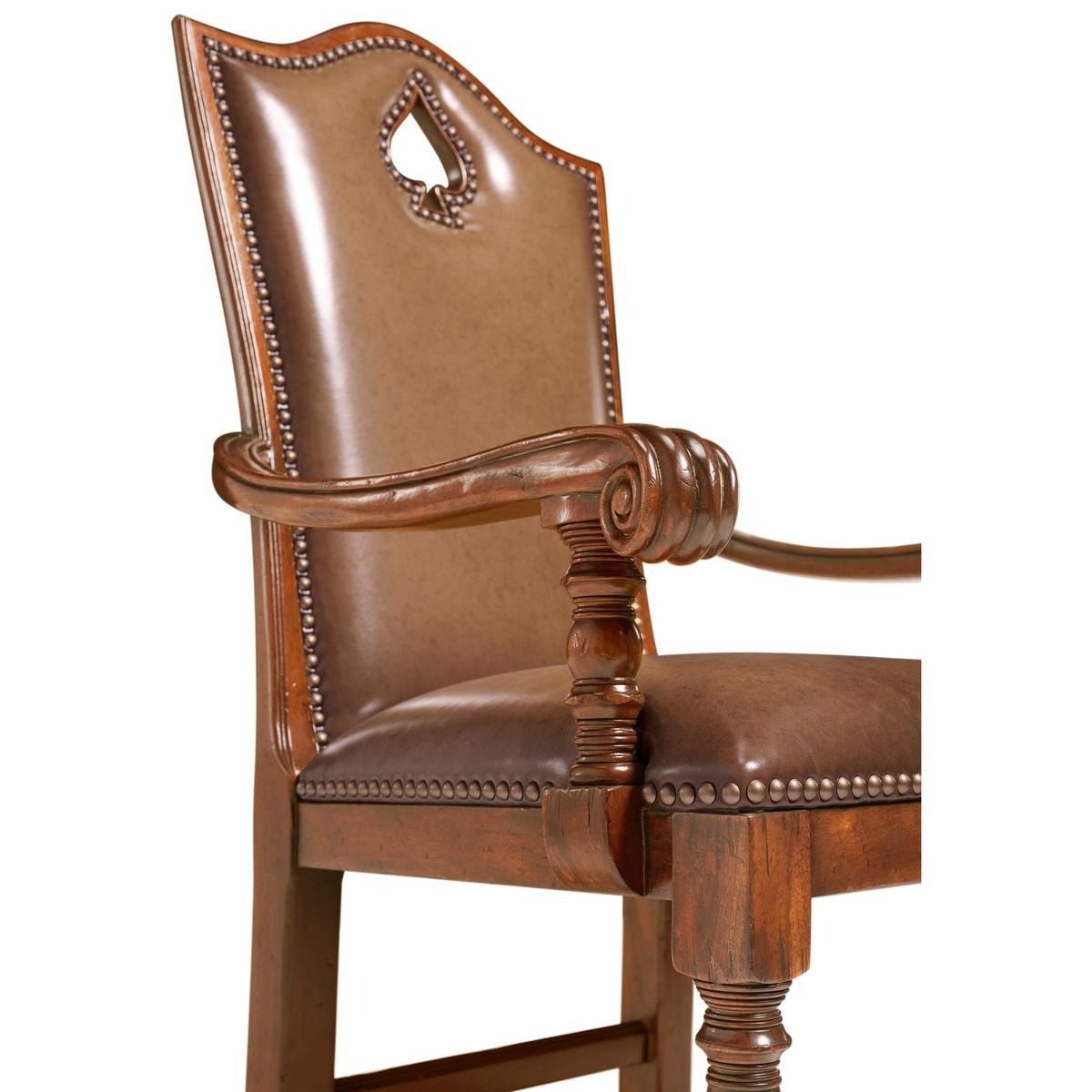 Leather upholstered armchair with shaped back presenting a traditional European influenced form with a spade pieced back. The tall back is upholstered in rich brown leather and outlined with a continuous border of brass nailhead trim that follows the shaped crest and side rails. At the center of the back a decorative pierced spade-shaped opening introduces a distinctive visual element while maintaining the strong vertical profile of the chair. The upholstered seat is generously proportioned and similarly trimmed with brass nailheads along the seat rail. Shaped wooden arms sweep outward in a gentle curve and terminate in scrolled handholds, supported by turned arm posts. The frame is constructed in wood with turned front legs and straight rear supports, joined by stretchers that reinforce the base structure. The chair is fitted with brass-capped casters, allowing it to move easily across flooring surfaces while preserving its traditional appearance. The combination of leather upholstery, nailhead detailing, and turned wooden supports creates a substantial armchair suitable for dining rooms, libraries, or study environments.