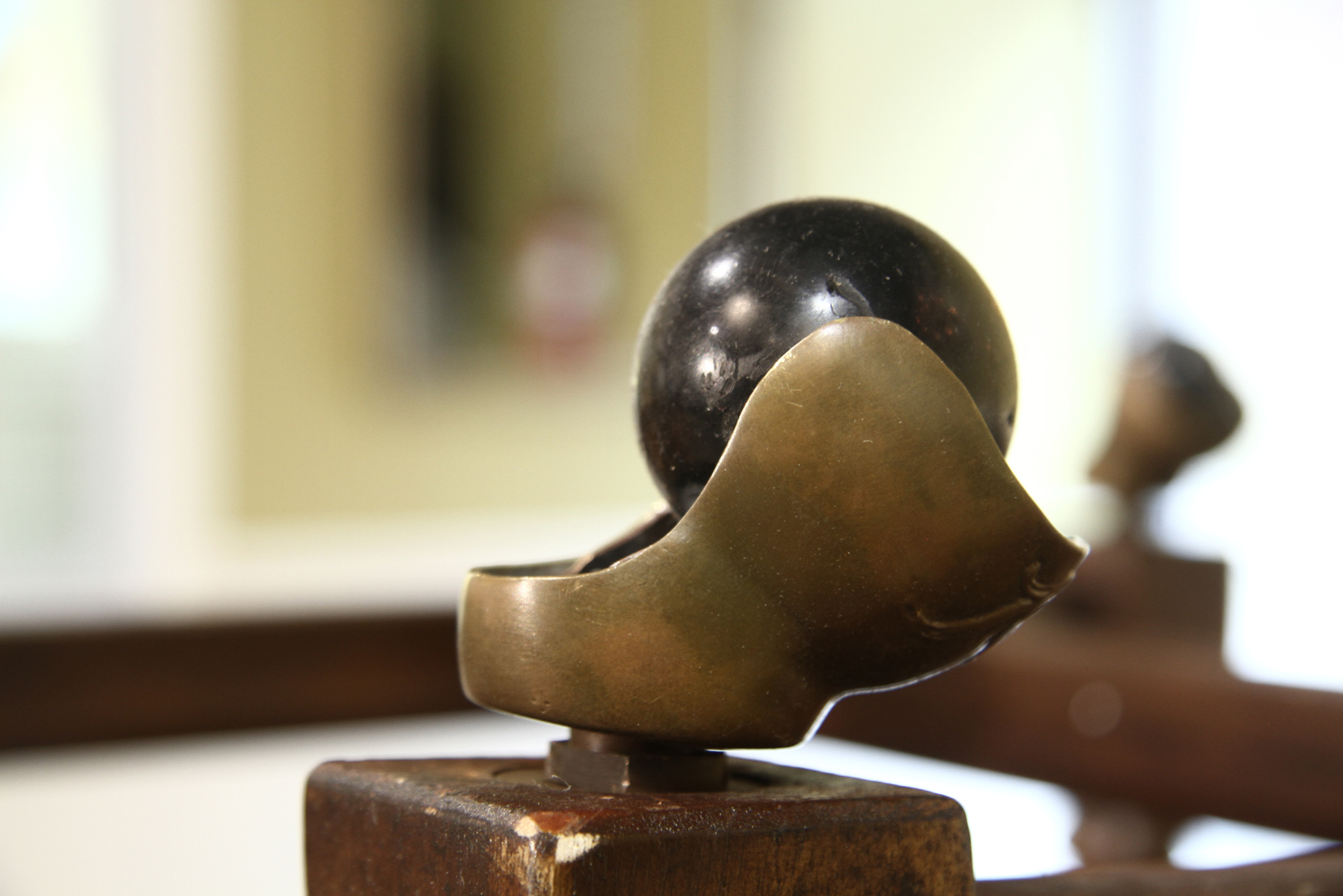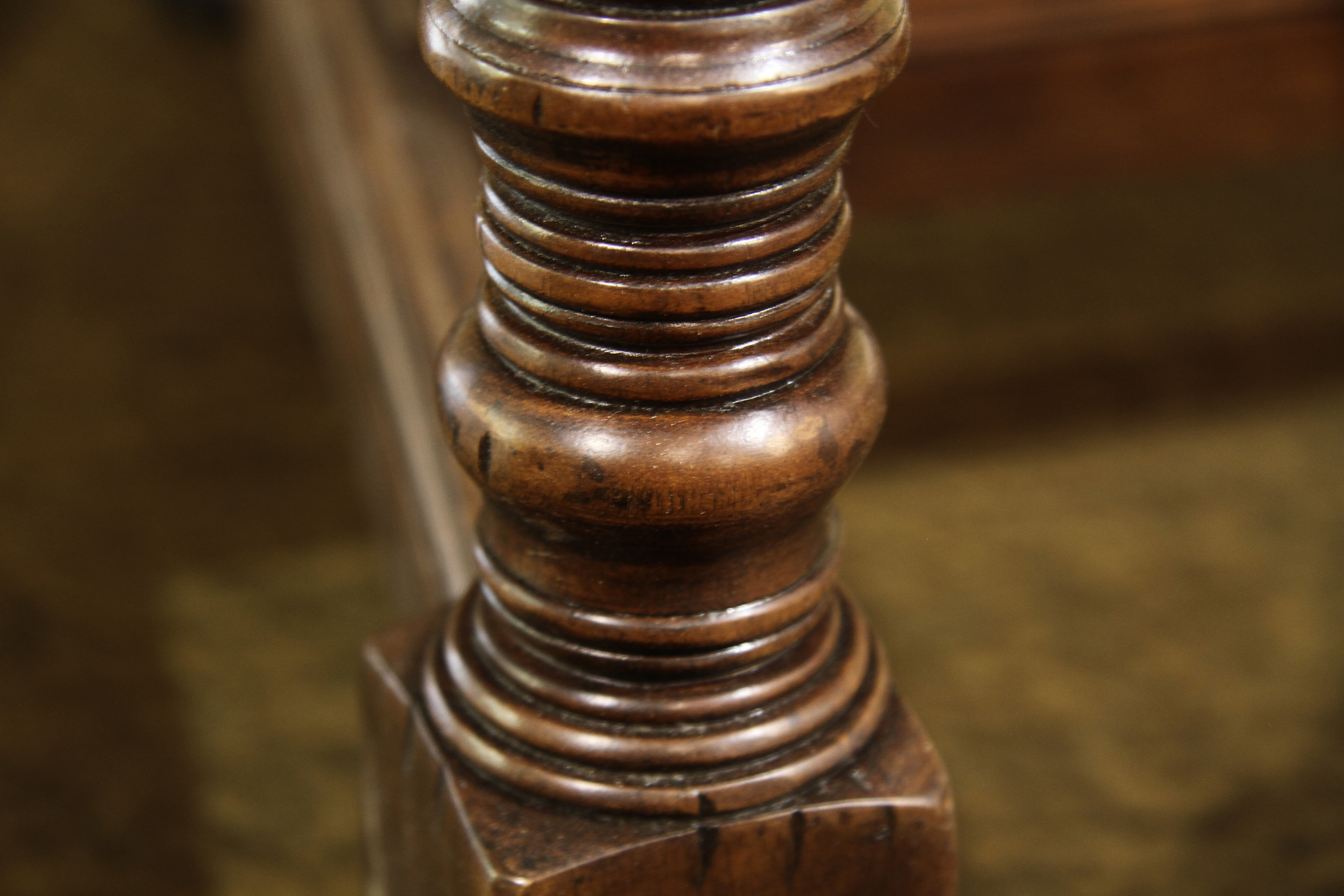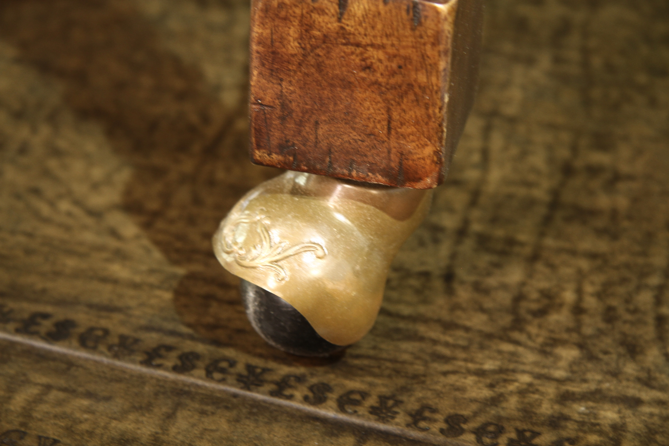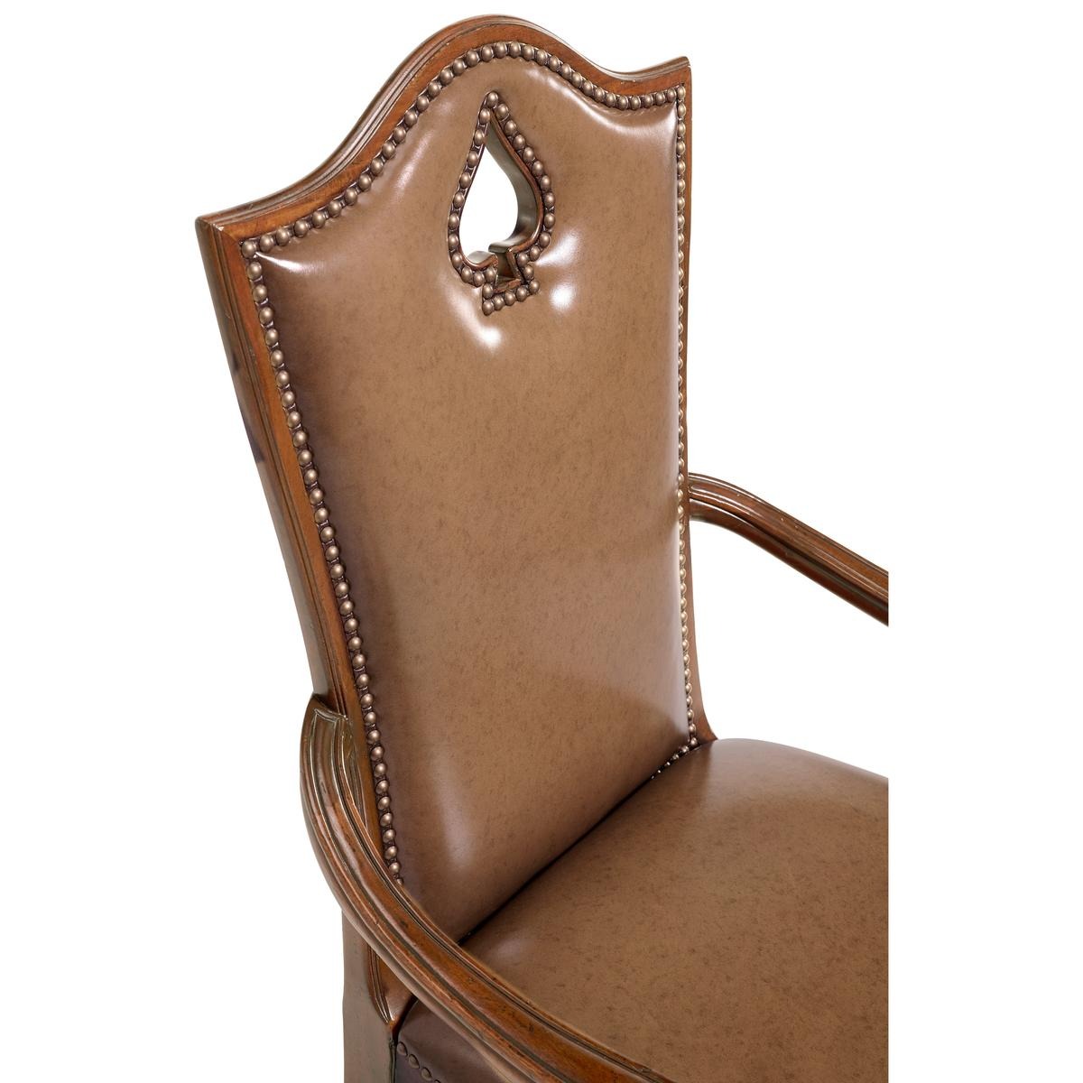 Leather upholstered armchair with shaped back presenting a traditional European influenced form with a spade pieced back. The tall back is upholstered in rich brown leather and outlined with a continuous border of brass nailhead trim that follows the shaped crest and side rails. At the center of the back a decorative pierced spade-shaped opening introduces a distinctive visual element while maintaining the strong vertical profile of the chair. The upholstered seat is generously proportioned and similarly trimmed with brass nailheads along the seat rail. Shaped wooden arms sweep outward in a gentle curve and terminate in scrolled handholds, supported by turned arm posts. The frame is constructed in wood with turned front legs and straight rear supports, joined by stretchers that reinforce the base structure. The chair is fitted with brass-capped casters, allowing it to move easily across flooring surfaces while preserving its traditional appearance. The combination of leather upholstery, nailhead detailing, and turned wooden supports creates a substantial armchair suitable for dining rooms, libraries, or study environments.