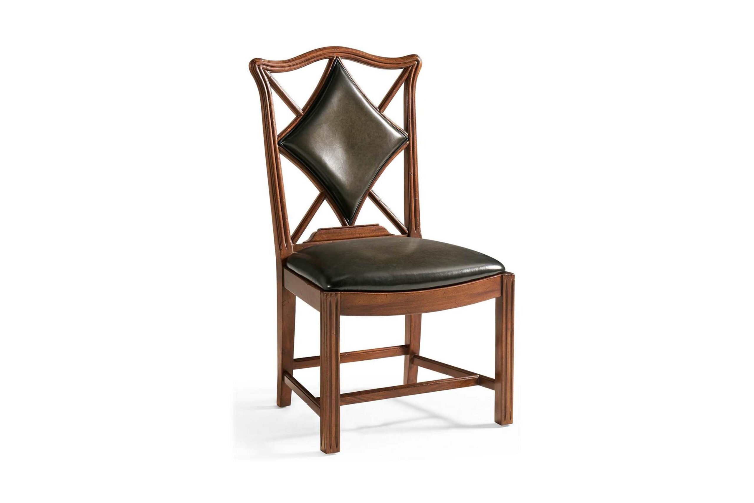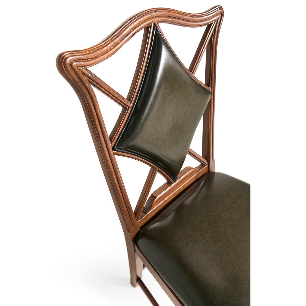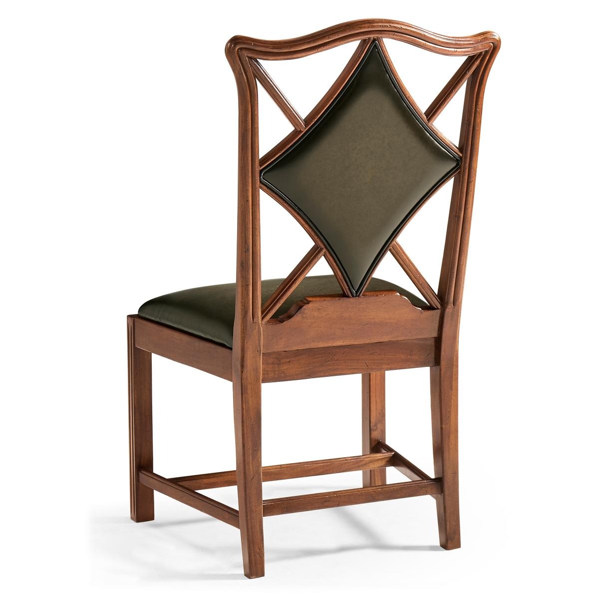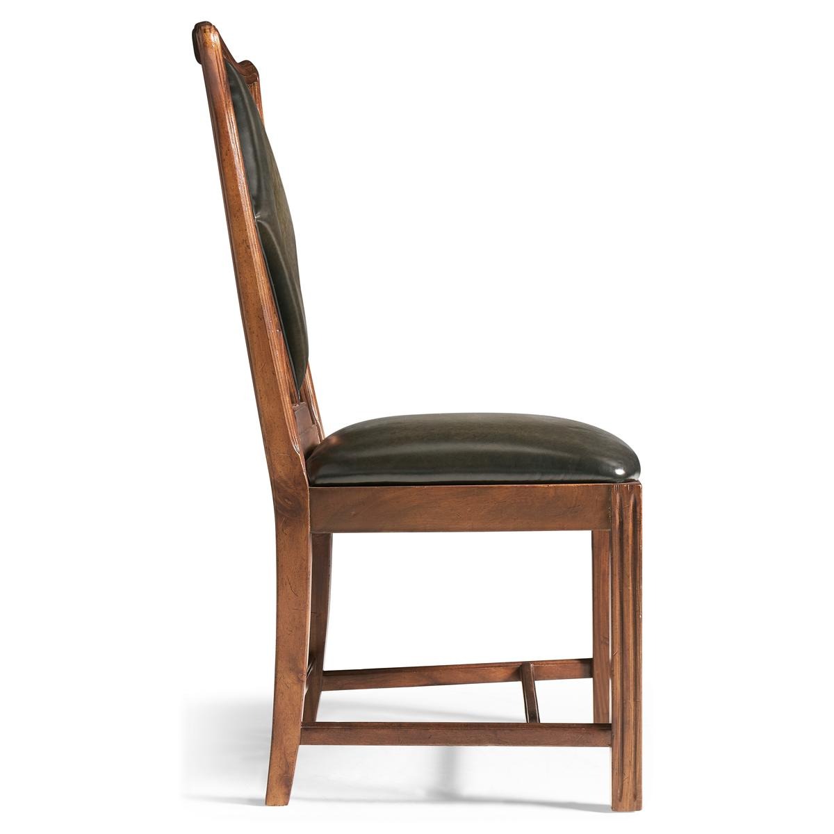 An unusual side chair constructed in walnut, based on an 18th century form with a shaped and serpentine top rail. The back features a central upholstered panel in English library green leather, formed in a diamond-shaped outline and set within the surrounding frame. The arms sweep outward from the back, transitioning into the seat rail in a continuous line. The chair is raised on reeded straight front legs, paired with raked rear legs that angle backward to support the structure. The proportions are scaled for table seating, making it suitable for use in card or game environments. The combination of shaped rail, upholstered panel, and leg detailing reflects a reinterpretation of period design adapted for functional use.