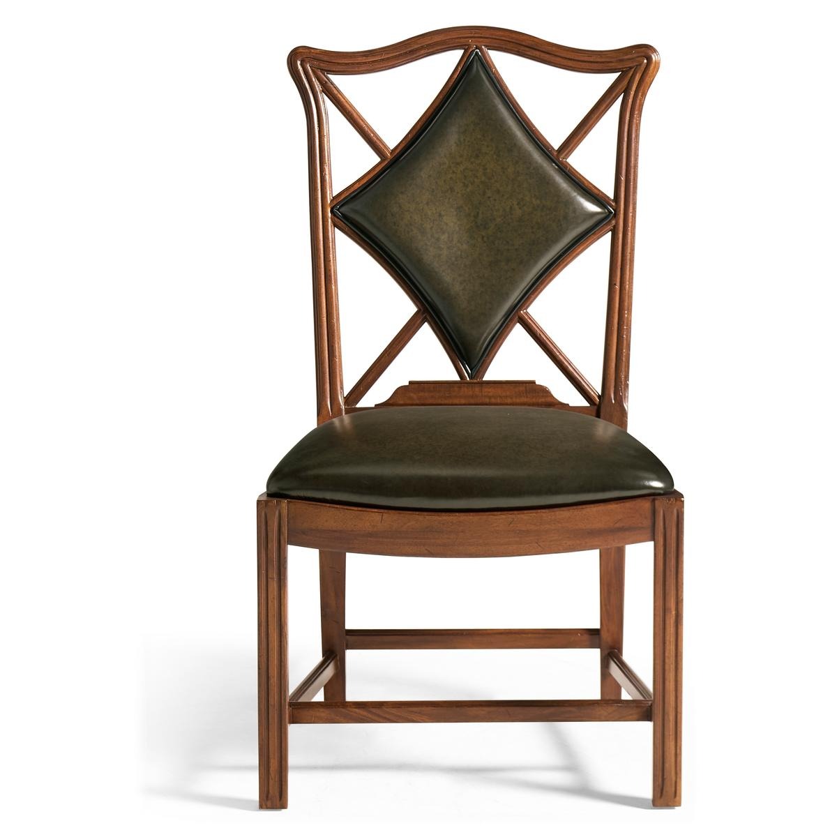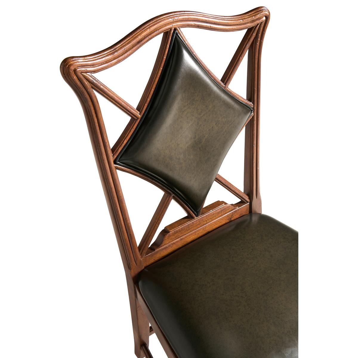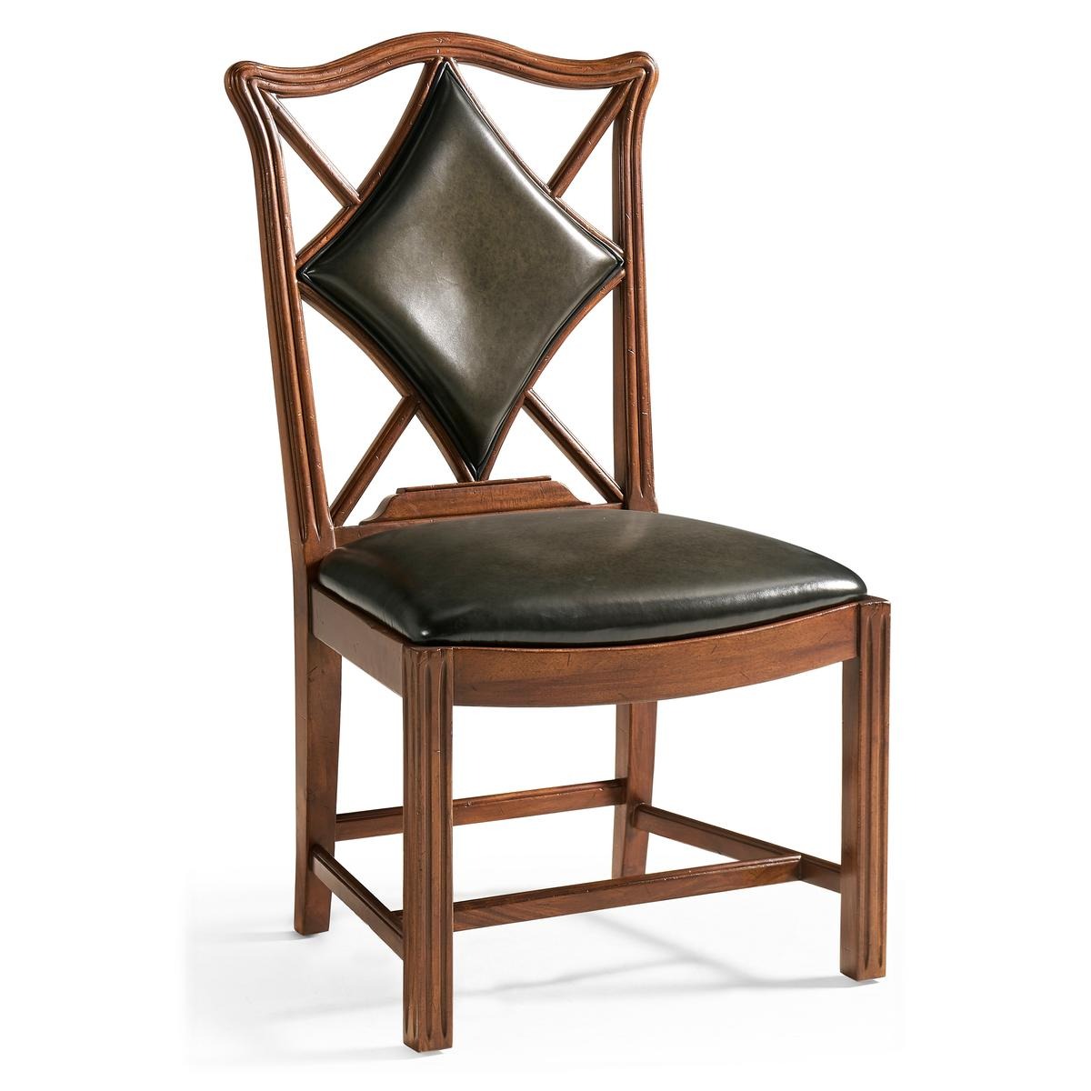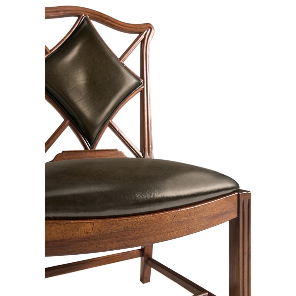 An unusual side chair constructed in walnut, based on an 18th century form with a shaped and serpentine top rail. The back features a central upholstered panel in English library green leather, formed in a diamond-shaped outline and set within the surrounding frame. The arms sweep outward from the back, transitioning into the seat rail in a continuous line. The chair is raised on reeded straight front legs, paired with raked rear legs that angle backward to support the structure. The proportions are scaled for table seating, making it suitable for use in card or game environments. The combination of shaped rail, upholstered panel, and leg detailing reflects a reinterpretation of period design adapted for functional use.